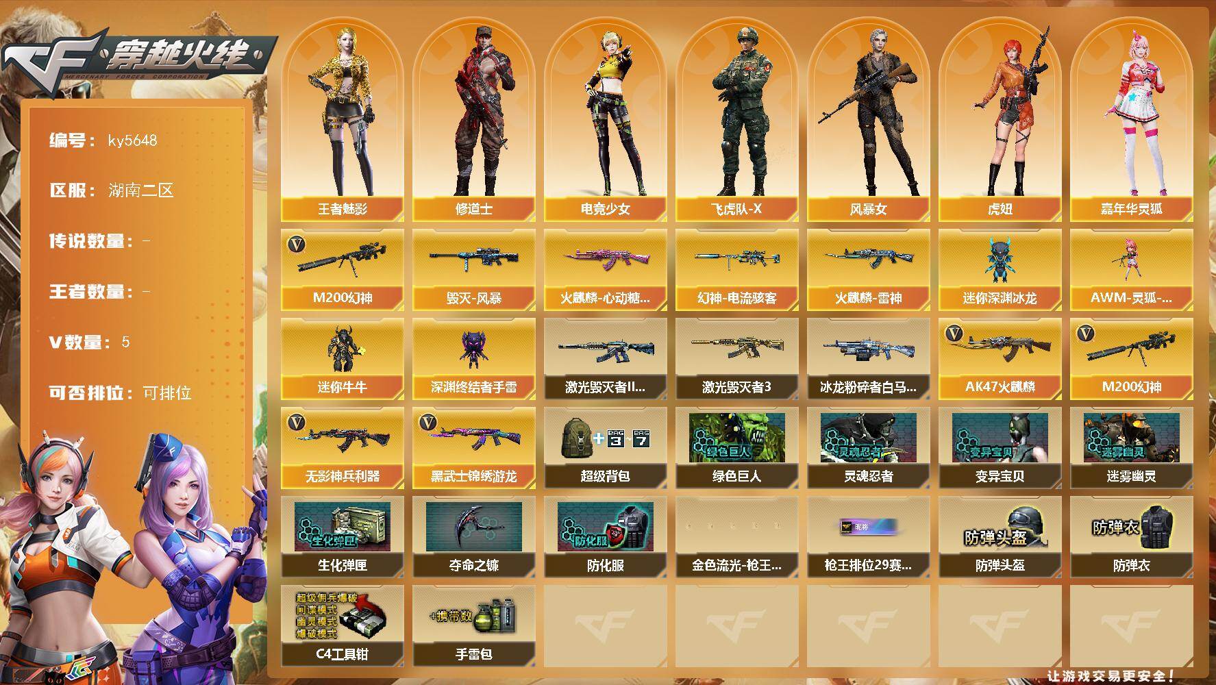 [16729323]湖南二区-5V-0王者武器数-0炫金武器数 【热门武器】:M200-幻神 【皮肤】:幻神-电流骇客 皮肤,火麒麟-雷神,火麒麟-心动糖果,毁灭-风暴 【角色】:王者-魅影,修道士,电竞少女,飞虎队-X,风暴女,虎妞,嘉年华灵狐,曼陀罗-X,潘多拉-X,斯沃特-X,兔囡囡,维纳斯,新娜塔莎,夜玫瑰-宠粉 【人偶武器】:AWM-灵狐-15周年嘉年华,迷你深渊冰龙,迷你牛牛*3,深渊终结者手雷 【挑战大师】:冰龙粉碎者-白马银枪,激光毁灭者III-白马银枪,激光毁灭者III 【英雄级武器】:AK47-火麒麟,无影-神兵利器,黑武士-锦绣游龙,M200-幻神 【道具】:超级背包,绿色巨人,灵魂忍者*2,变异宝贝,迷雾幽灵*2,生化弹匣,夺命之镰,防化服*2,金色流光-枪王排位*2,星辰流光-枪王排位,枪王排位28赛季金色流光,枪王排位29赛季金色流光,防弹头盔*4,防弹衣*4,C4工具钳*4,手雷包*4 【特殊枪械】: