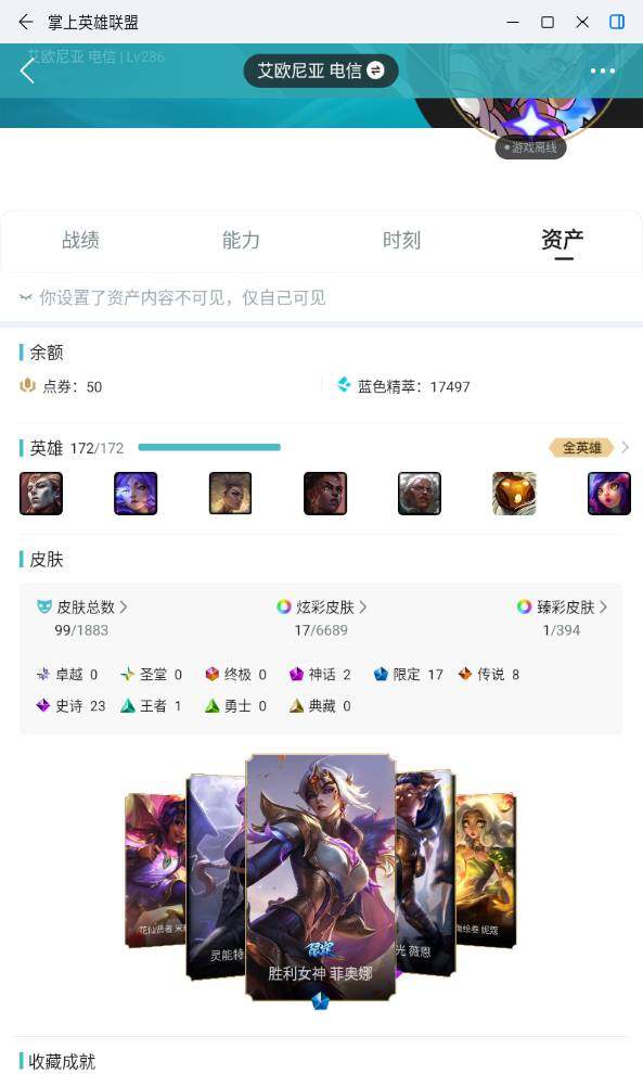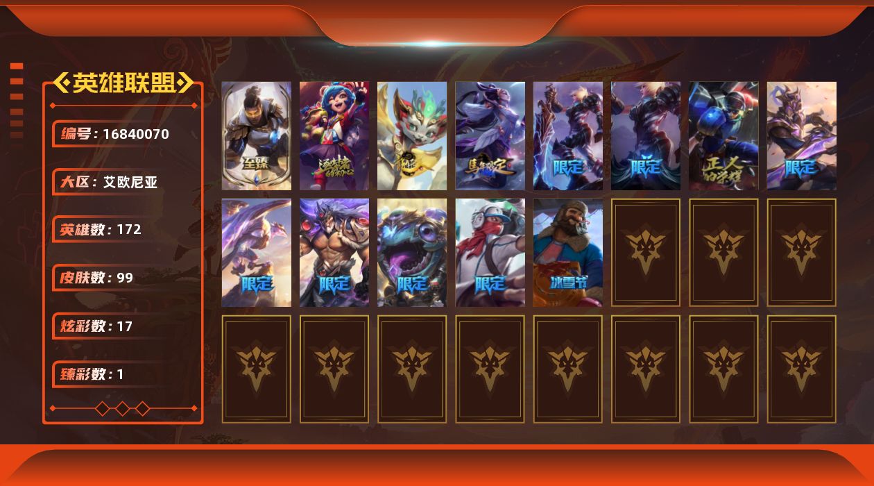 [16840070]白银段位-172英雄-99皮肤-17炫彩-0终极-2神话-17限定-8传说-23史诗