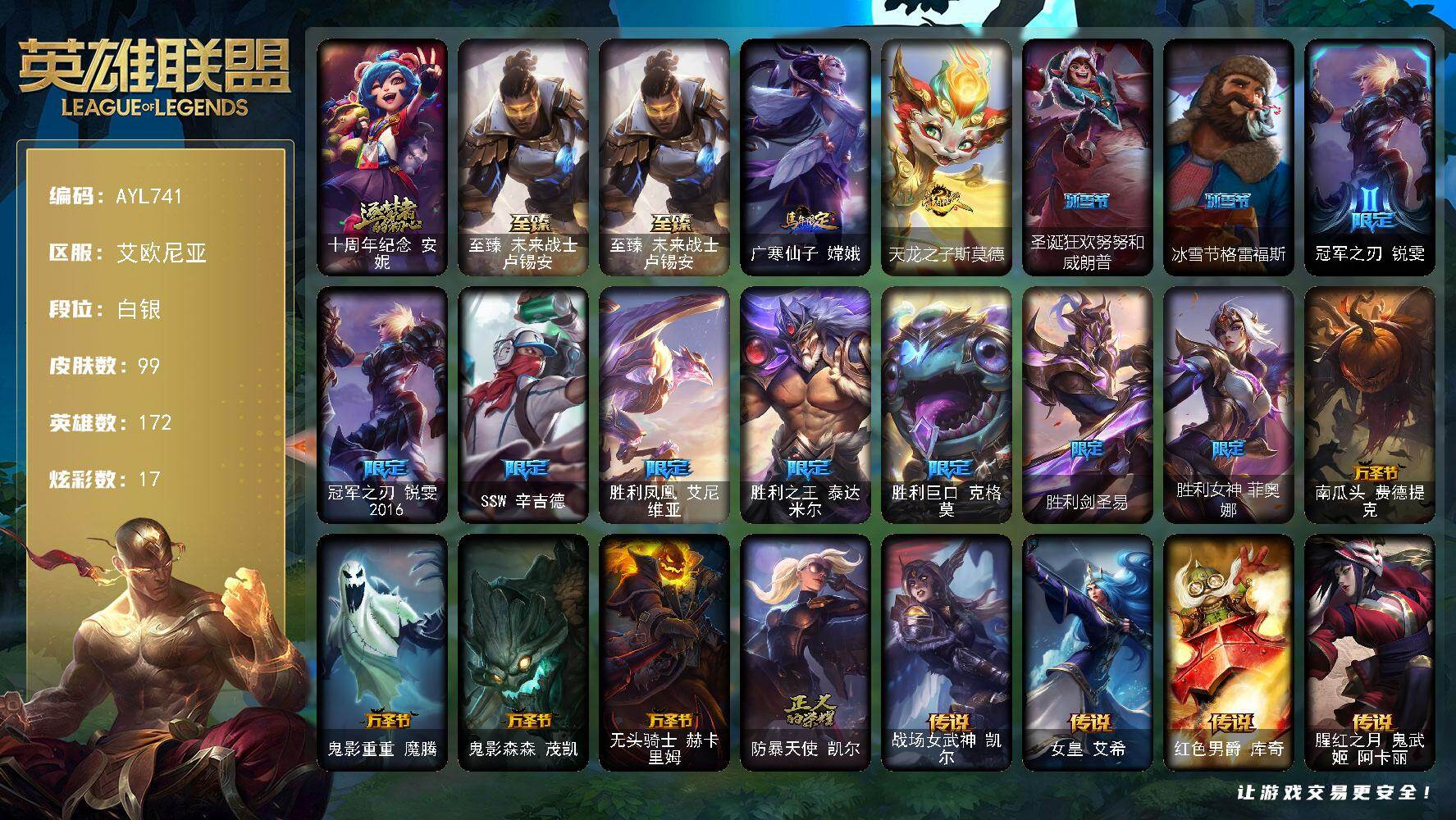 [16840070]白银段位-172英雄-99皮肤-17炫彩-0终极-2神话-17限定-8传说-23史诗 【神话皮肤】:十周年纪念安妮,至臻未来战士卢锡安 【至臻皮肤】:至臻未来战士卢锡安 【臻彩皮肤】:无畏骑士瑟庄妮赤子初心 【年限皮肤】:广寒仙子嫦娥,天龙之子斯莫德 【冰雪限定】:圣诞狂欢努努和威朗普,冰雪节格雷福斯 【限定皮肤】:冠军之刃锐雯,冠军之刃锐雯2016,SSW辛吉德,胜利凤凰艾尼维亚,胜利之王泰达米尔,胜利巨口克格莫,胜利剑圣易,胜利女神菲奥娜,南瓜头费德提克,鬼影重重魔腾,鬼影森森茂凯,无头骑士赫卡里姆,防暴天使凯尔 【传说皮肤】:战场女武神凯尔,女皇艾希,红色男爵库奇,腥红之月鬼武姬阿卡丽,黎明使者锐雯,焰尾妖狐阿狸,泳池派对吉格斯,黎明使者永恩 【史诗皮肤】:摄魂男爵弗拉基米尔,地狱火阿利斯塔,死亡绽放伊莉丝,苍穹之光薇恩,深海妖姬卡西奥佩娅,血色之锤波比,飞车暴走族古拉加斯,钢铁意志潘森,银色之牙阿卡丽,铁血女忍阿卡丽,刺客信条凯南,源计划山蕾欧娜,刺客信条锐雯,血色精锐锐雯,战国大名慎,铁血猎人雷恩加尔,死亡绽放卡兹克,生化骑士德莱厄斯,腥红之月黛安娜,源计划雷卢锡安,源计划阴劫,霸天剑魔亚托克斯,星际之门阿兹尔 【王者皮肤】:西部牛仔崔斯特 【其他皮肤1】:风执事加里奥,逍遥赌侠崔斯特,弗拉基米尔伯爵,弗拉基米尔侯爵,末世天使凯尔,灵能特工凯尔,武仙座海格力斯赛恩,黑暗骑士沃里克,宗师级钓鱼训练师贾克斯,时间机器基兰,黑暗女王伊芙琳,探戈灵魂伊芙琳,惊天魔盗伊芙琳,黑金诱惑图奇,幽灵幻影卡尔萨斯,自由女神卡尔萨斯,五杀摇滚主唱卡尔萨斯,虚空前世卡萨丁,雪橇速滑库奇,三叶草墨菲特,腥红之月卡特琳娜,银河魔装机神奈德丽,黎明使者奈德丽,乡村农夫古拉加斯,龙骑士莫德凯撒,银色闪电凯南,医学博士凯南,海上霸主盖伦,玉剑传说武剑仙,无情重炮格雷福斯,光明骑士诺提勒斯,死亡骑士瑟庄妮,玉剑传说无双,刃执事德莱文,西部魔影赫卡里姆,车骑之力赫卡里姆,西部魔影德莱厄斯,黑潮黛安娜,电玩女神卡莎,神龙尊者玉境灵龙卡莎,魔女卡蜜尔,双城之战金克丝,德玛西亚警官卢锡安,小蜜蜂悠米,西部魔影持枪女巫莎弥拉,山海绘卷妮蔻,灵魂莲华永恩,花仙贤者米利欧