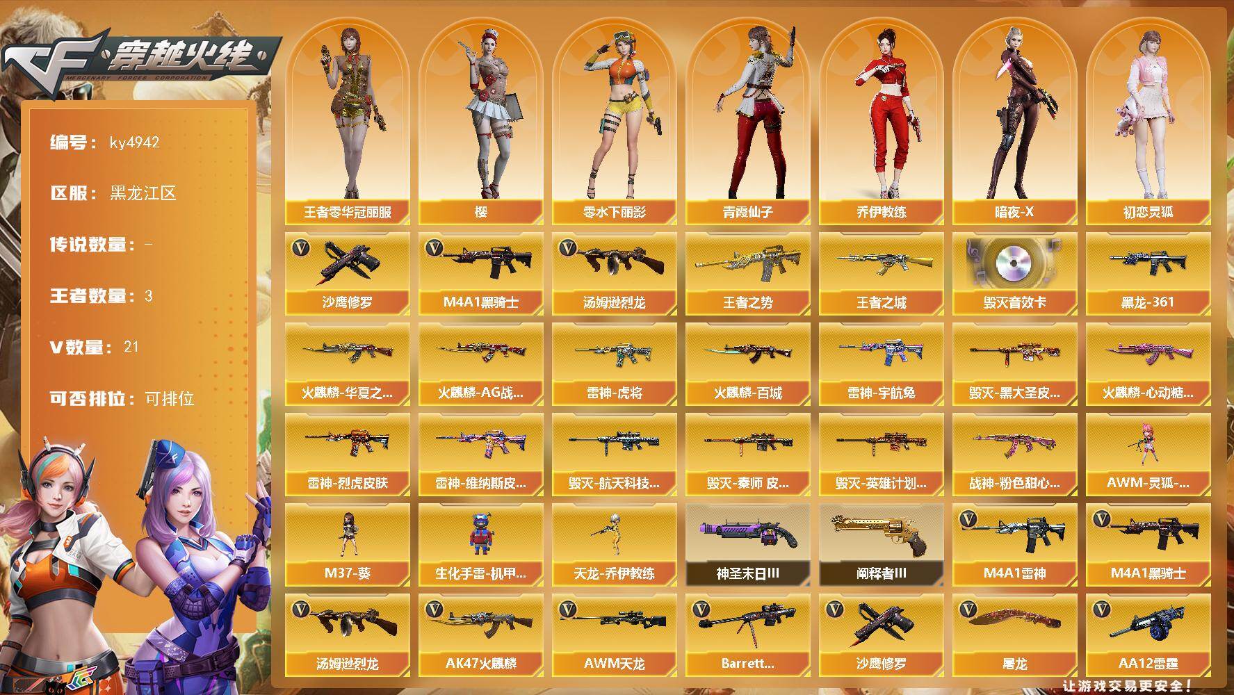 [16842523]黑龙江区-21V-3王者-0炫金 【热门武器】:M4A1-黑骑士,汤姆逊-烈龙,沙鹰-修罗*2 【王者炫金武器】:王者之城,王者之势 【音效卡】:Barrett-毁灭音效卡 【皮肤】:雷神-虎将,雷神-烈虎皮肤,雷神-宇航兔皮肤,雷神-维纳斯皮肤,火麒麟-AG战队皮肤,火麒麟-华夏之心,火麒麟-百城,火麒麟-心动糖果,毁灭-黑大圣皮肤,毁灭-航天科技皮肤,毁灭-秦师 皮肤,毁灭-英雄计划 皮肤,M4A1-黑龙-361,战神-粉色甜心皮肤 【角色】:樱,王者零-华冠丽服,乔伊教练,暗夜-X,初恋灵狐,飞虎队-X,风暴女,虎妞,嘉年华灵狐,兰-海滩派对,猎狐者-追月,零-水下丽影,灵狐者-七夕宝贝,龙儿-小淘气,潘多拉-甜心教官,青霞仙子,斯沃特-X,兔囡囡,维纳斯,雪莉杨,雪莉杨-摸金校尉,夜玫瑰-幻能朋克,影武者-X 【人偶武器】:天龙-乔伊教练,AWM-灵狐-15周年嘉年华,M37-葵,生化手雷-机甲核心 【挑战大师】:神圣爆裂者-末日III,阐释者III 【英雄级武器】:AK47-火麒麟*2,M4A1-雷神,M4A1-黑骑士,无影-神兵利器,黑武士-锦绣游龙,烈火-动感闪耀,王者之戮-觉醒版,AWM-天龙,Barrett-毁灭,汤姆逊-烈龙,AA-12-雷霆,沙鹰-修罗*2,天神-动感闪耀,屠龙*2,屠龙-动感闪耀,手雷-动感闪耀 【道具】:炫彩背包,超级背包,迷你冰龙背包,夺命之镰,防化服,金色流光-枪王排位*2,星辰流光-枪王排位,枪王排位28赛季金色流光,枪王排位29赛季金色流光,动感闪耀表情,防弹头盔*2,防弹衣,C4工具钳*2,手雷包*2 【特殊枪械】:1黑骑士,1烈龙