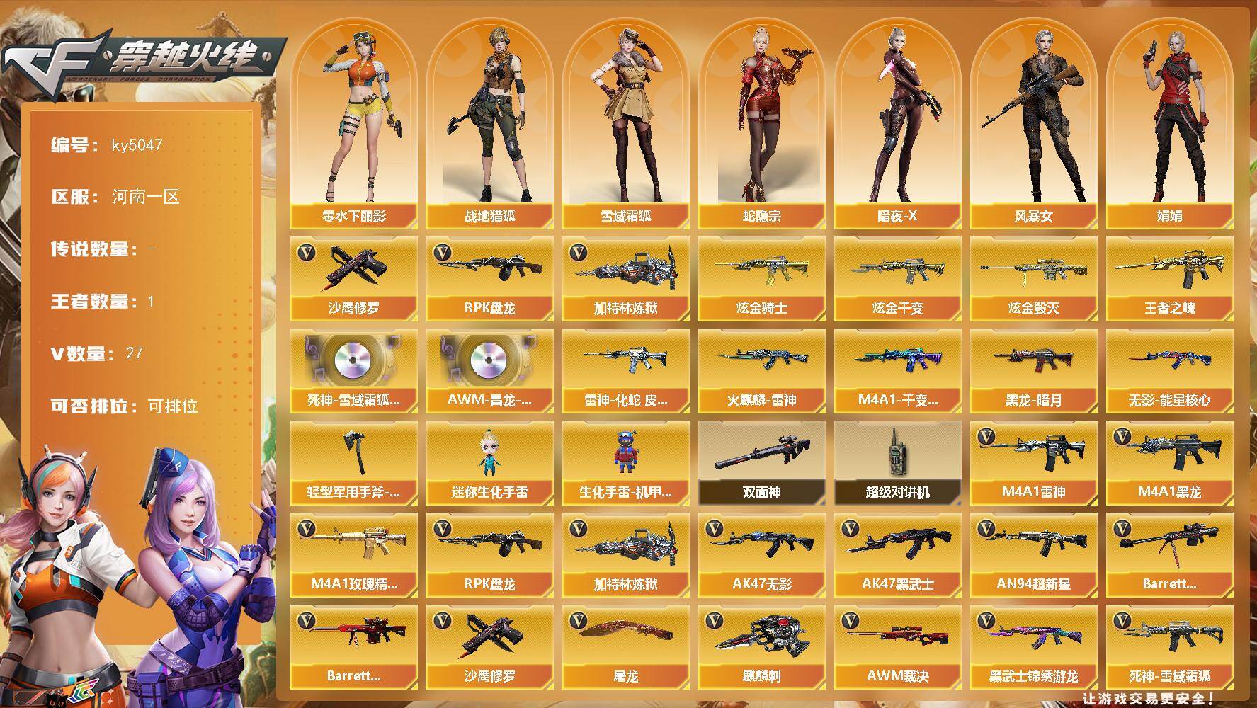 [16843615]河南一区-27V-1王者-3炫金 【热门武器】:RPK-盘龙,加特林-炼狱,沙鹰-修罗*3 【王者炫金武器】:王者之魄,炫金骑士,炫金千变,炫金毁灭 【音效卡】:死神-雪域霜狐-怀旧音效卡,AWM-昌龙-怀旧音效卡 【皮肤】:雷神-化蛇 皮肤,火麒麟-雷神,M4A1-千变-孔明皮肤,黑龙-暗月,无影-能量核心,轻型军用手斧-再燃火线 【角色】:战地猎狐,雪域霜狐,蛇隐宗,暗夜-X,风暴女,娟娟,兰-海滩派对,兰妹妹,零-水下丽影,麻雀,蛇姬,维纳斯,影武者-X,智影 【人偶武器】:迷你生化手雷,生化手雷-机甲核心 【暴走生化】:双面神,超级对讲机 【英雄级武器】:M4A1-黑龙*3,M4A1-雷神*2,AK47-无影,AK47-黑武士,AN94-超新星,黑武士-锦绣游龙,死神-雪域霜狐,M4A1-玫瑰精灵,Barrett-毁灭,Barrett-极光,AWM-裁决,RPK-盘龙,加特林-炼狱,沙鹰-修罗*3,屠龙*3,麒麟刺,高爆手雷-古蛇迷踪,闪光弹-堕天神,烟雾弹-古蛇迷踪,M4A1-赤狱骑士,AWM-昌龙 【道具】:云山科技背包,亚洲杯纪念炫彩背包,炫彩背包-诺拉,炫彩背包,背包-洛丽塔,雪域霜狐炫彩背包,救世主-黑桃战神,黄金生化钩,绿色巨人,灵魂忍者,迷雾幽灵,夺命之镰,防化服*3,枪王排位29赛季金色流光,语音特效-怀旧,雪域霜狐表情,防弹头盔*2,防弹衣*2,C4工具钳*2,手雷包*2 【特殊枪械】:1盘龙,1炼狱