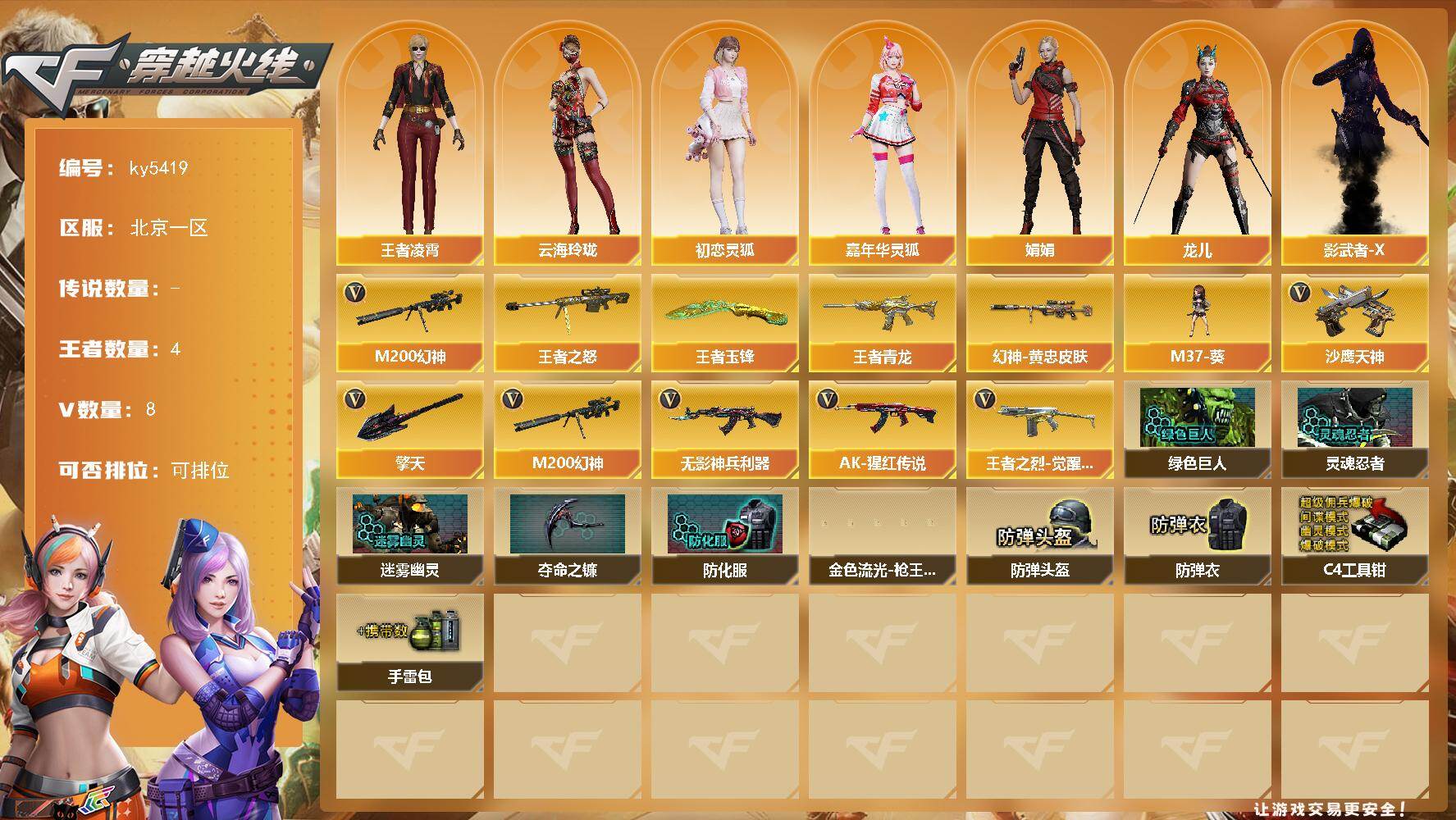 - [14440778]安徽一区-73V-5王者-0炫金 【热门武器】:QBZ03-金色蔷薇,M200-幻神,柯尔特-冠军之特,Kar98K-星神,金色小号,M4A1-黑骑士,白虎-枪娘安妮,Knife-冠军之刃 【王者炫金武器】:王者星光 【音效卡】:M200-幻神音效卡,M4A1-黑骑士音效卡,Barrett-毁灭音效卡,白鲨语音包,Kar98K-星神音效卡,M14EBR-玄武音效卡,Barrett-碧霄极光音效卡,麒麟刺-百战金芒-盛典舞曲音效卡,炼狱-百战金芒-庆典舞曲音效卡,死神-雪域霜狐-怀旧音效卡 【皮肤】:M200-幻神-黄忠皮肤,幻神-荣耀世冠白鲨2023 皮肤,裁决-羽掣 皮肤,雷神-冠军之魄,M4A1-战神赵云,雷神-R.LGD-CFPLS18冠军,M4A1-再燃火线,雷神-神秘按键 皮肤,火麒麟-战神关羽,火麒麟-平天大圣,火麒麟-百城,毁灭-冠军之怒,毁灭-战神张飞,毁灭-航天科技皮肤,毁灭-英雄计划 皮肤,M4A1-千变-孔明皮肤,黑骑士-战神马超,屠龙-惊鸿 皮肤,轻型军用手斧-再燃火线 【角色】:魅影,玄豹,战地猎狐,王者零-华冠丽服,王者-魅影,雪域霜狐,乔伊教练,暗夜-X,电竞少女,飞虎队-X,风暴女,虎妞,嘉年华灵狐,娟娟,兰-空鹰,兰妹妹,零-水下丽影,龙儿-小淘气,曼陀罗-X,潘多拉-甜心教官,青霞仙子,蜀雪,铁骑荣耀,雪莉杨-摸金校尉,夜玫瑰-幻能朋克,樱-战斗天使,影武者-X,游珑儿,职业选手 【人偶武器】:火麒麟-灵狐,白虎-枪娘安妮,异变清道夫-蛇影双骄,AWM-灵狐-15周年嘉年华 【暴走生化】:黑龙吞噬者,超级对讲机 【挑战大师】:激光毁灭者III-白马银枪,激光毁灭者III,KAC-圣炎切割者III,神圣爆裂者-末日III 【英雄级武器】:M4A1-千变,AK47-火麒麟*3,M4A1-雷神*2,M4A1-黑骑士,AN94-超新星,无影-神兵利器,黑武士-锦绣游龙,死神-雪域霜狐,SCAR Light-玄豹,九霄圣角,QBZ03-金色蔷薇,黑骑士-海王,Barrett-毁灭,AWM-裁决,M200-幻神,Kar98K-星神,炼狱-百战金芒,沙鹰-天神*2,柯尔特-冠军之特,Anaconda-玄豹,屠龙*2,麒麟刺-百战金芒,丛林匕首-玄豹,高爆手雷-堕天神,高爆手雷-玄豹*11,闪光弹-雷暴,闪光弹-堕天神,闪光弹-玄豹*8,烟雾弹