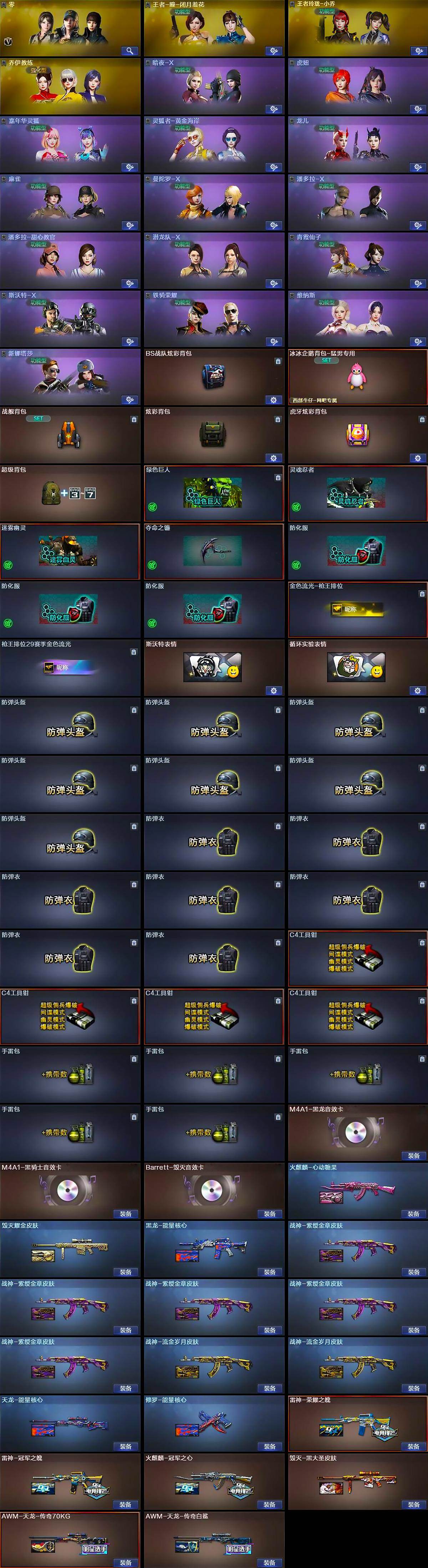 【道具】:BS战队炫彩背包,冰冰企鹅背包-猛男专用,战舰背包,炫彩背包,虎牙炫彩背包,超级背包,绿色巨人,灵魂忍者,迷雾幽灵,夺命之镰,防化服*3,金色流光-枪王排位,枪王排位29赛季金色流光,斯沃特表情,循环实验表情,防弹头盔*7,防弹衣*7,C4工具钳*4,手雷包*5