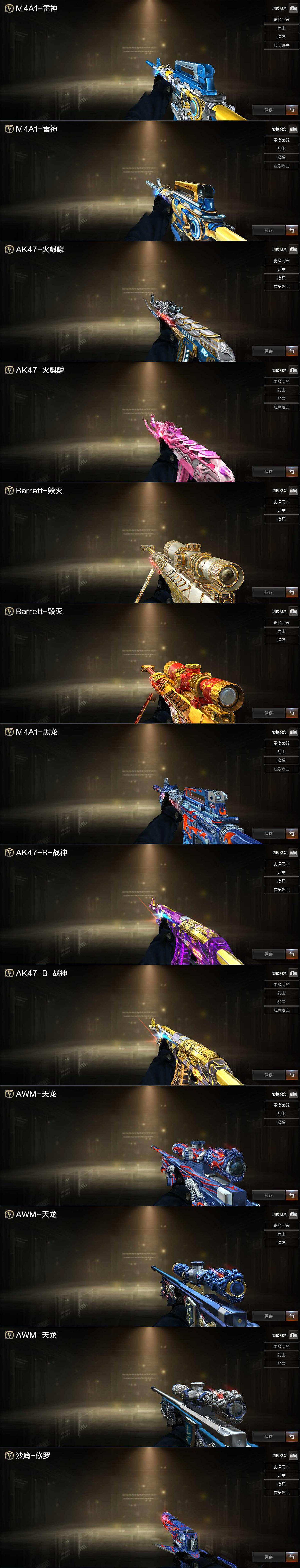 【热门武器】:QBZ03-金色蔷薇,HK417-朱雀,M4A1-青龙,M200-幻神,M4A1-黑骑士,加特林-炼狱,斯泰尔-蝴蝶,USP-雷暴,沙鹰-修罗*2