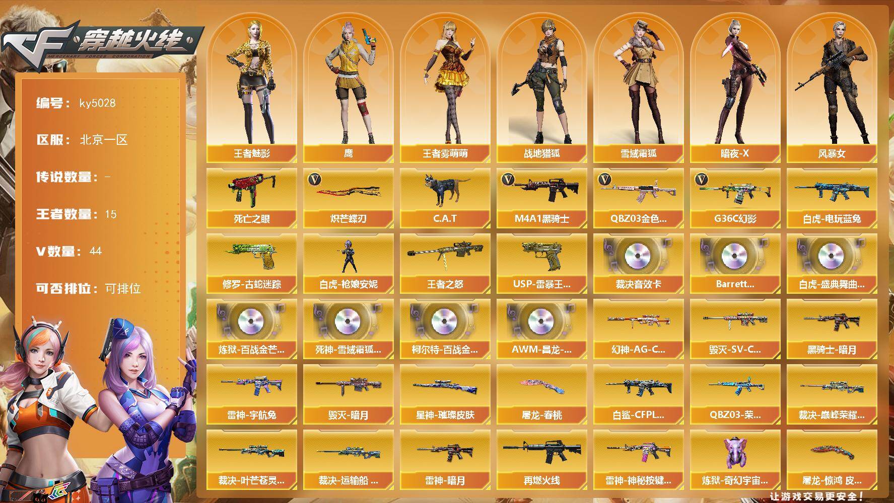 [16845132]北京一区-44V-15王者-0炫金 【传说角色】:传说星骇 【热门武器】:G36C-幻影,QBZ03-金色蔷薇,修罗-古蛇迷踪,死亡之眼,白虎-电玩蓝兔,C.A.T,M4A1-黑骑士,白虎-枪娘安妮,炽芒蝶刃 【王者炫金武器】:王者之怒,USP-雷暴王者 【音效卡】:AWM-裁决音效卡,Barrett-碧霄极光音效卡,白虎-盛典舞曲音效卡,炼狱-百战金芒-庆典舞曲音效卡,死神-雪域霜狐-怀旧音效卡,柯尔特-百战金芒-庆典舞曲音效卡,AWM-昌龙-怀旧音效卡 【皮肤】:幻神-AG-CFPL S24冠军 皮肤,幻神-电竞之星 皮肤,白虎-白鲨-CFPLS23冠军,QBZ03-荣耀世冠EP 皮肤,金色蔷薇-电竞之星 皮肤,裁决-巅峰荣耀 皮肤,裁决-叶芒苍灵 皮肤,裁决-运输船 皮肤,裁决-胜者为王 皮肤,星神-璀璨皮肤,雷神-暗月,雷神-宇航兔皮肤,M4A1-再燃火线,雷神-神秘按键 皮肤,毁灭-暗月,毁灭-SV-CFPLS16冠军,黑骑士-暗月,炼狱-奇幻宇宙万象,屠龙-春桃 皮肤,屠龙-惊鸿 皮肤,轻型军用手斧-再燃火线,龙啸-青青莓果 皮肤 【角色】:鹰,战地猎狐,王者-魅影,王者雾萌萌,雪域霜狐,暗夜-X,风暴女,兰-新年限定,兰妹妹,潘多拉-X,潘多拉-甜心教官,蛇姬 【人偶武器】:白虎-枪娘安妮,HK417-朱雀-枪娘菲,金色蔷薇-枪娘阿敏,星神-枪娘默,迷你宝贝,AWM-灵狐-15周年嘉年华*2,C.A.T,生化手雷-机甲核心,深渊终结者手雷 【暴走生化】:死亡之眼 【挑战大师】:激光毁灭者III-白马银枪 【英雄级武器】:AK47-火麒麟*2,M4A1-黑龙,M4A1-雷神*2,M4A1-黑骑士,G36C-幻影,死神-雪域霜狐,QBZ03-金色蔷薇,黑骑士-海王,白虎-电玩蓝兔,AWM-裁决,王者幻神-觉醒版,炼狱-百战金芒,AA-12-雷霆,柯尔特-荣耀世冠EP,修罗-古蛇迷踪,屠龙,擎天-竞技荣光,炽芒蝶刃,麒麟刺-百战金芒,王者冰锋-觉醒版*2,高爆手雷-竞技荣光,高爆手雷-古蛇迷踪,闪光弹-竞技荣光*3,烟雾弹-竞技荣光*3,烟雾弹-古蛇迷踪,烟雾弹-荣耀世冠EP*7,M4A1-赤狱骑士,M4A1-苍鸣雷神,AWM-昌龙,Barrett-碧霄极光 【道具】:BS战队炫彩背包,CFS限定背包,EP战队炫彩背包,云山科技背包,亚洲杯纪念炫彩背包,古