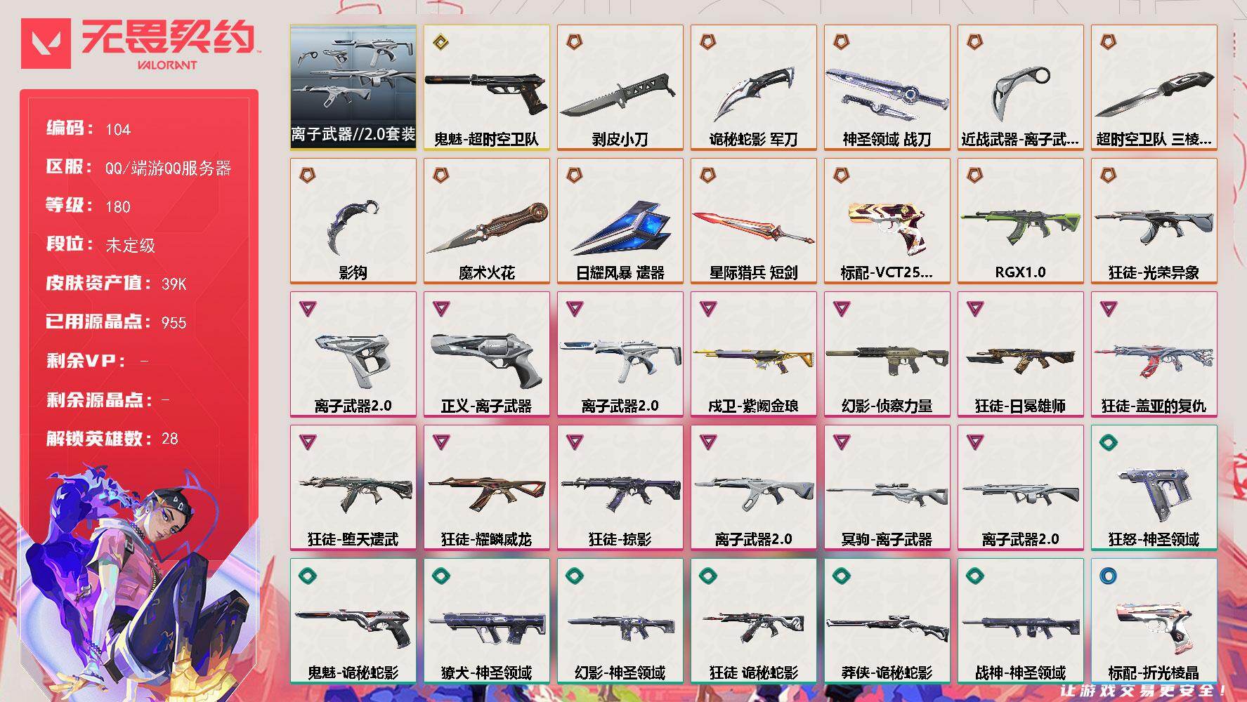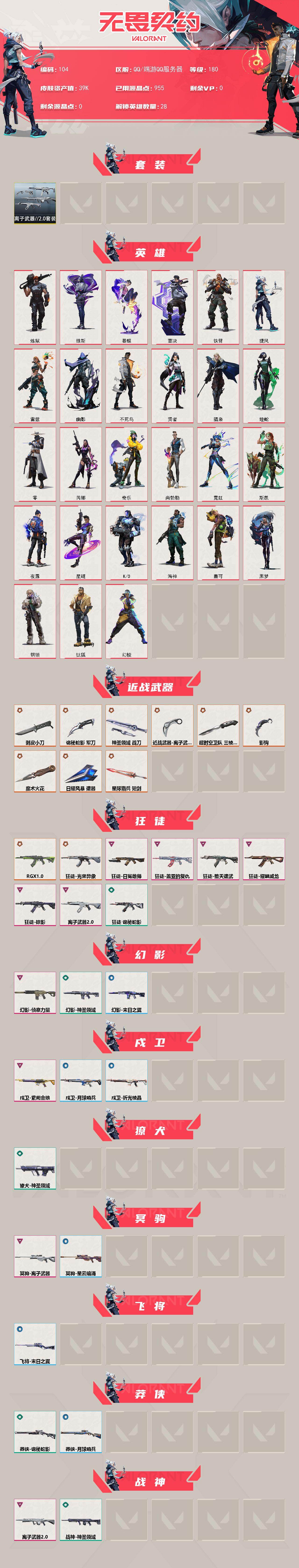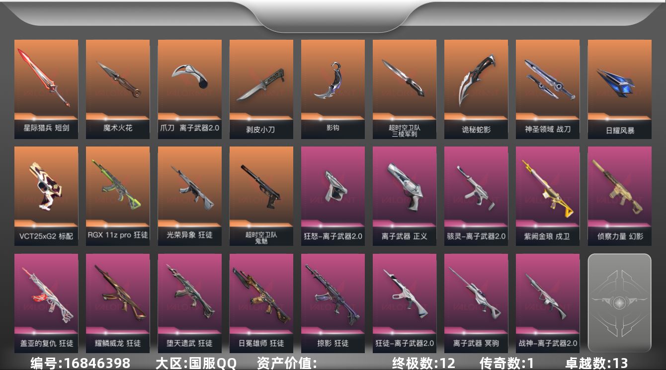 [16846398]【104】【套装】:离子武器//2.0套装 【英雄】:幻棱,炼狱,维斯,暮蝶,钛狐,壹决,铁臂,捷风,雷兹,幽影,不死鸟,贤者,猎枭,蝰蛇,零,芮娜,奇乐,尚勃勒,霓虹,斯凯,夜露,星礈,K/O,海神,盖可,黑梦,钢锁 【近战武器】:近战武器-魔术火花,近战武器-影钩,近战武器-超时空卫队 三棱军刺,近战武器-剥皮小刀,近战武器-离子武器//2.0 爪刀,近战武器-诡秘蛇影 军刀,近战武器-神圣领域 战刀,近战武器-日耀风暴 遗器,近战武器-星际猎兵 短剑,近战武器-魔术火花 【狂徒】:狂徒-RGX 11z Pro,狂徒-光荣异象,狂徒-堕天遗武,狂徒-掠影,狂徒-盖亚的复仇,狂徒-日冕雄师,狂徒-耀鳞威龙,狂徒-离子武器//2.0,狂徒-诡秘蛇影 【幻影】:幻影-侦察力量,幻影-神圣领域,幻影-末日之翼 【戍卫】:戍卫-紫阙金琅,戍卫-月球哨兵,戍卫-折光棱晶 【獠犬】:獠犬-神圣领域 【冥驹】:冥驹-离子武器,冥驹-星云暗涌 【飞将】:飞将-末日之翼 【莽侠】:莽侠-诡秘蛇影,莽侠-月球哨兵 【战神】:战神-离子武器//2.0,战神-神圣领域 【奥丁】:奥丁-末日之翼 【判官】:判官-诡秘蛇影 【雄鹿】:雄鹿-月球哨兵 【骇灵】:骇灵-离子武器//2.0,骇灵-星云暗涌 【蜂刺】:蜂刺-星云暗涌,蜂刺-折光棱晶 【标配】:标配-折光棱晶 【VCT手枪】:标配-VCT25 x G2 【正义】:正义-离子武器,正义-纳米打击,正义-月球哨兵 【鬼魅】:鬼魅-超时空卫队,鬼魅-诡秘蛇影,鬼魅-扑棱扑棱,鬼魅-星云暗涌 【狂怒】:狂怒-离子武器//2.0,狂怒-神圣领域 【短炮】:短炮-末日之翼 【卡面】:终章:激斗汉堡 卡面,进入射程 卡面,《双城之战》拥抱 卡面,精灵大战 卡面,欢迎来到底城 卡面,南瓜盛典 卡面,无畏契约:暮蝶 卡面,修车达人 卡面,正义的化身 卡面,至黑之夜 卡面,无畏契约:蝰蛇 卡面,无畏契约GO!第一卷:芮娜 卡面,无畏契约GO!第一卷:零 卡面,黑影先生的咖啡! 卡面,代号红色 卡面,新兵报到 卡面,V契约 卡面,无畏契约 卡面 【喷漆】:嗨宝南瓜灯 喷漆,嘭! 喷漆,都算到了 喷漆,控场勿近 喷漆,伤心心 喷漆,熊抱 喷漆,蝰蛇 喷漆,致命毒素 喷漆,喜欢哪种毒? 喷漆,VCT x G2 喷漆,买装还是存钱 喷漆,胜利属于无畏契约 喷漆