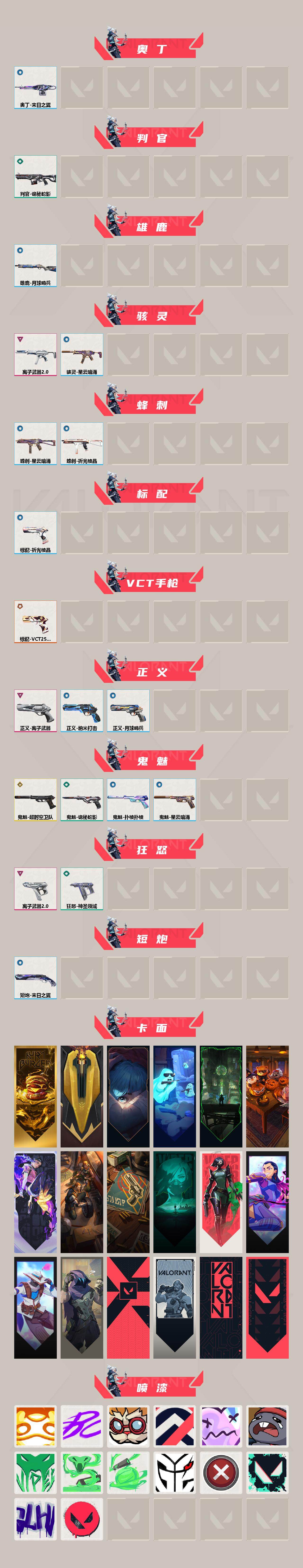 【喷漆】:嗨宝南瓜灯 喷漆,嘭! 喷漆,都算到了 喷漆,控场勿近 喷漆,伤心心 喷漆,熊抱 喷漆,蝰蛇 喷漆,致命毒素 喷漆,喜欢哪种毒? 喷漆,VCT x G2 喷漆,买装还是存钱 喷漆,胜利属于无畏契约 喷漆