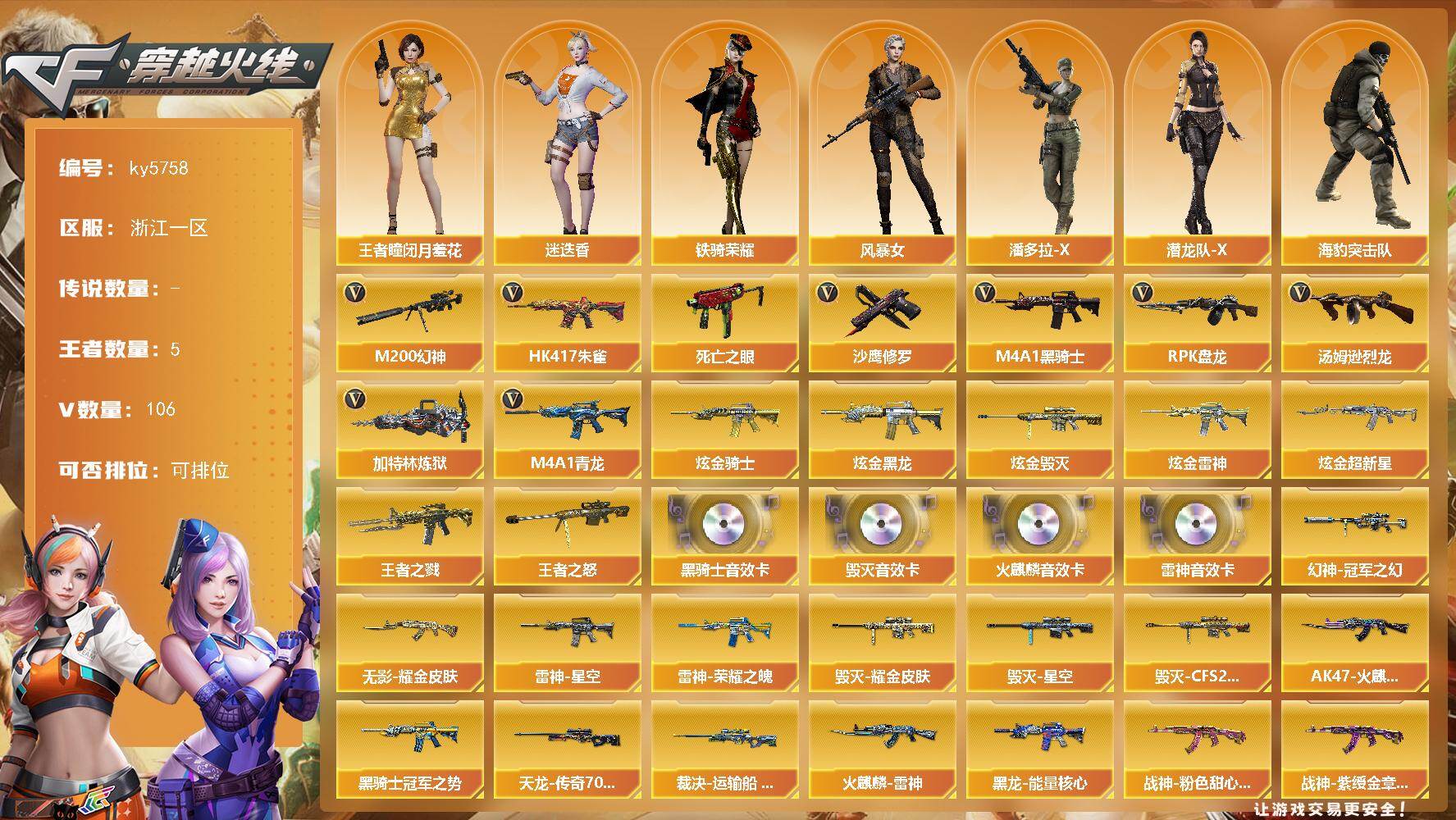 [16846609]浙江一区-108V-5王者武器数-5炫金武器数 【热门武器】:HK417-朱雀,M4A1-青龙,M200-幻神,死亡之眼,M4A1-黑骑士*2,汤姆逊-烈龙,RPK-盘龙,加特林-炼狱*3,沙鹰-修罗*2 【王者炫金武器】:王者之戮,王者之怒*2,炫金骑士,炫金黑龙,炫金雷神,炫金超新星,炫金毁灭 【音效卡】:AK47-火麒麟音效卡,M4A1-雷神音效卡,M4A1-黑骑士音效卡,Barrett-毁灭音效卡 【皮肤】:幻神-冠军之幻,裁决-运输船 皮肤,雷神-荣耀之魄,雷神-星空,火麒麟-雷神,AK47-火麒麟-传奇EVEN,毁灭耀金皮肤,毁灭-星空,毁灭-CFS2020*2,黑龙-能量核心,黑骑士-冠军之势,无影耀金皮肤,战神-粉色甜心皮肤*5,战神-紫绶金章皮肤*2,战神-流金岁月皮肤*11,AWM-天龙-传奇70KG,修罗-能量核心 【角色】:迷迭香,王者-瞳-闭月羞花,风暴女,潘多拉-X,潜龙队-X,铁骑荣耀,海豹突击队 【人偶武器】:火麒麟-灵狐*3,巴雷特-零-水下丽影,闪光弹-小乔 【暴走生化】:死亡之眼,超级对讲机 【挑战大师】:AK47-冰龙粉碎者,冰龙粉碎者-白马银枪 【英雄级武器】:AK47-火麒麟,M4A1-黑龙*6,M4A1-雷神*2,M4A1-黑骑士*2,AK47-无影*3,AK47-黑武士,AK47-黑鲨*3,M4A1-龙血*2,M4A1-青龙,HK417-朱雀,无影-神兵利器,M4A1-玫瑰精灵*2,王者之翼-觉醒版,王者之武-觉醒版,AK-47-猩红传说*28,AK47-B-战神,AWM-天龙*2,Barrett-毁灭,AWM-裁决*5,M200-幻神,RPK-盘龙,加特林-炼狱*3,汤姆逊-烈龙,AA-12-雷霆,沙鹰-修罗*2,沙鹰-天神,屠龙*3,龙啸,麒麟刺-堕天神*2,擎天*5,龙啸-堕天神,高爆手雷-堕天神*4,闪光弹-堕天神*4,烟雾弹-堕天神*4,M4A1-赤狱骑士 【道具】:战舰背包,炫彩背包,超级背包,妩媚妖姬,黄金生化钩,绿色巨人,灵魂忍者,变异宝贝,生化弹匣,夺命之镰,防化服*2,金色流光-枪王排位,星辰流光-枪王排位,枪王排位28赛季金色流光,枪王排位29赛季金色流光,防弹头盔*8,防弹衣*10,C4工具钳*7,手雷包*6 【特殊枪械】:2黑骑士,1烈龙,1盘龙,3炼狱