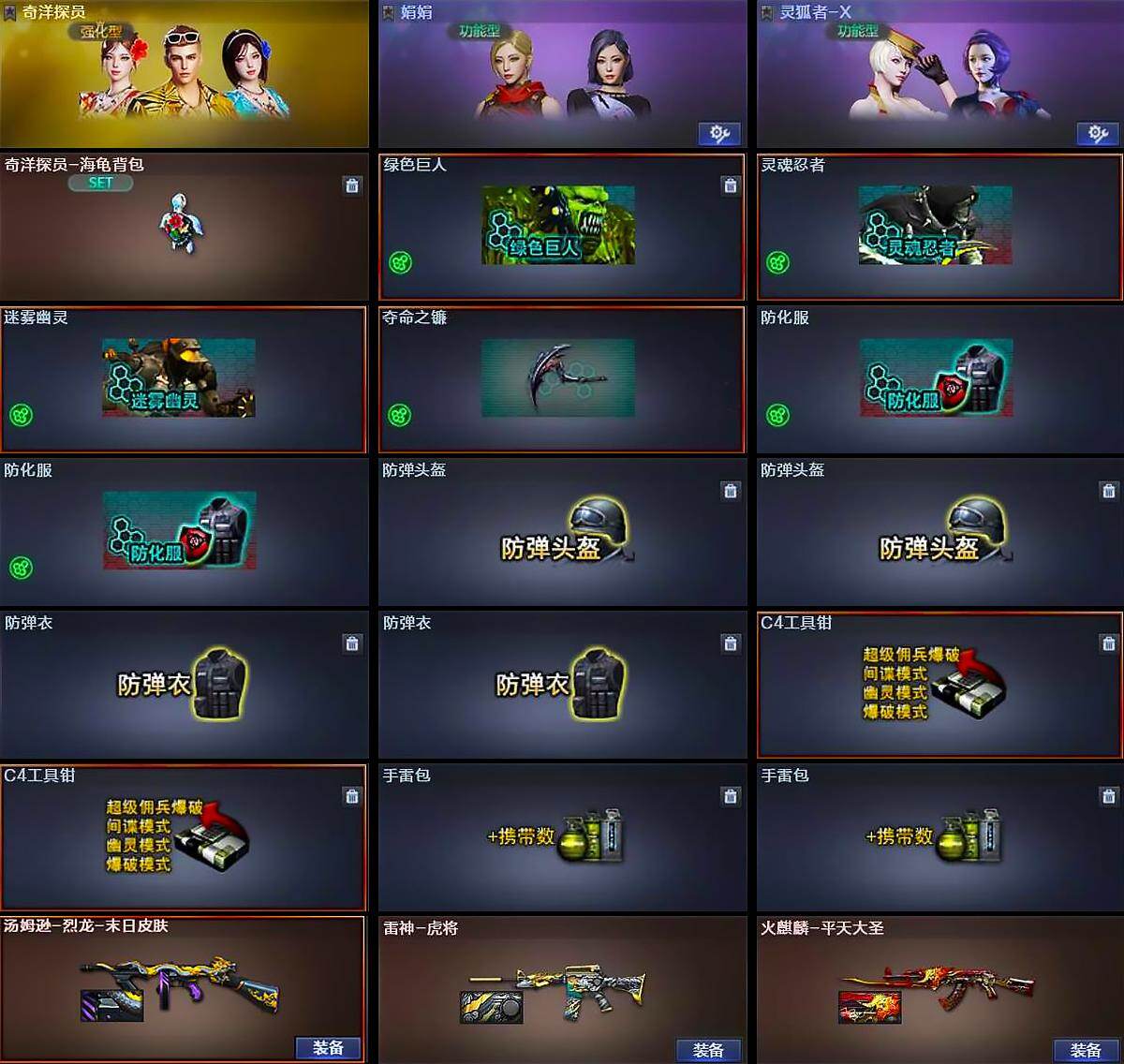 【道具】:奇洋探员-海龟背包,绿色巨人,灵魂忍者,迷雾幽灵,夺命之镰,防化服*2,防弹头盔*2,防弹衣*2,C4工具钳*2,手雷包*2