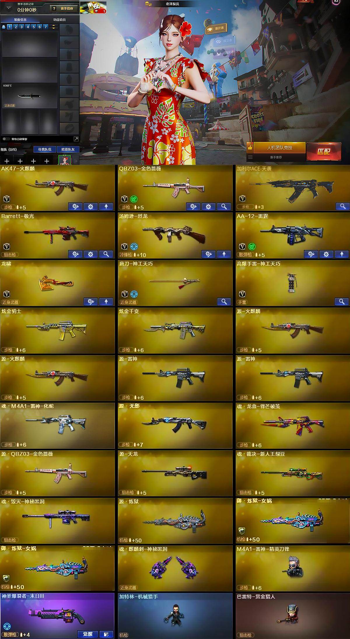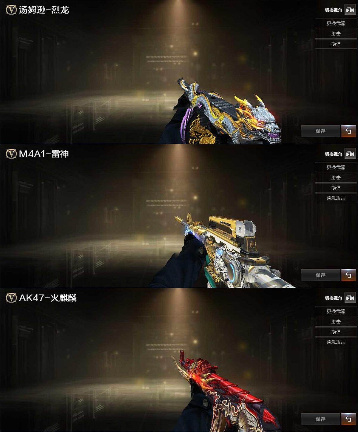 【英雄级武器】:AK47-火麒麟,QBZ03-金色蔷薇,加利尔ACE-天袭,Barrett-极光,汤姆逊-烈龙,AA-12-雷霆,龙啸,唐刀-神工天巧,高爆手雷-神工天巧