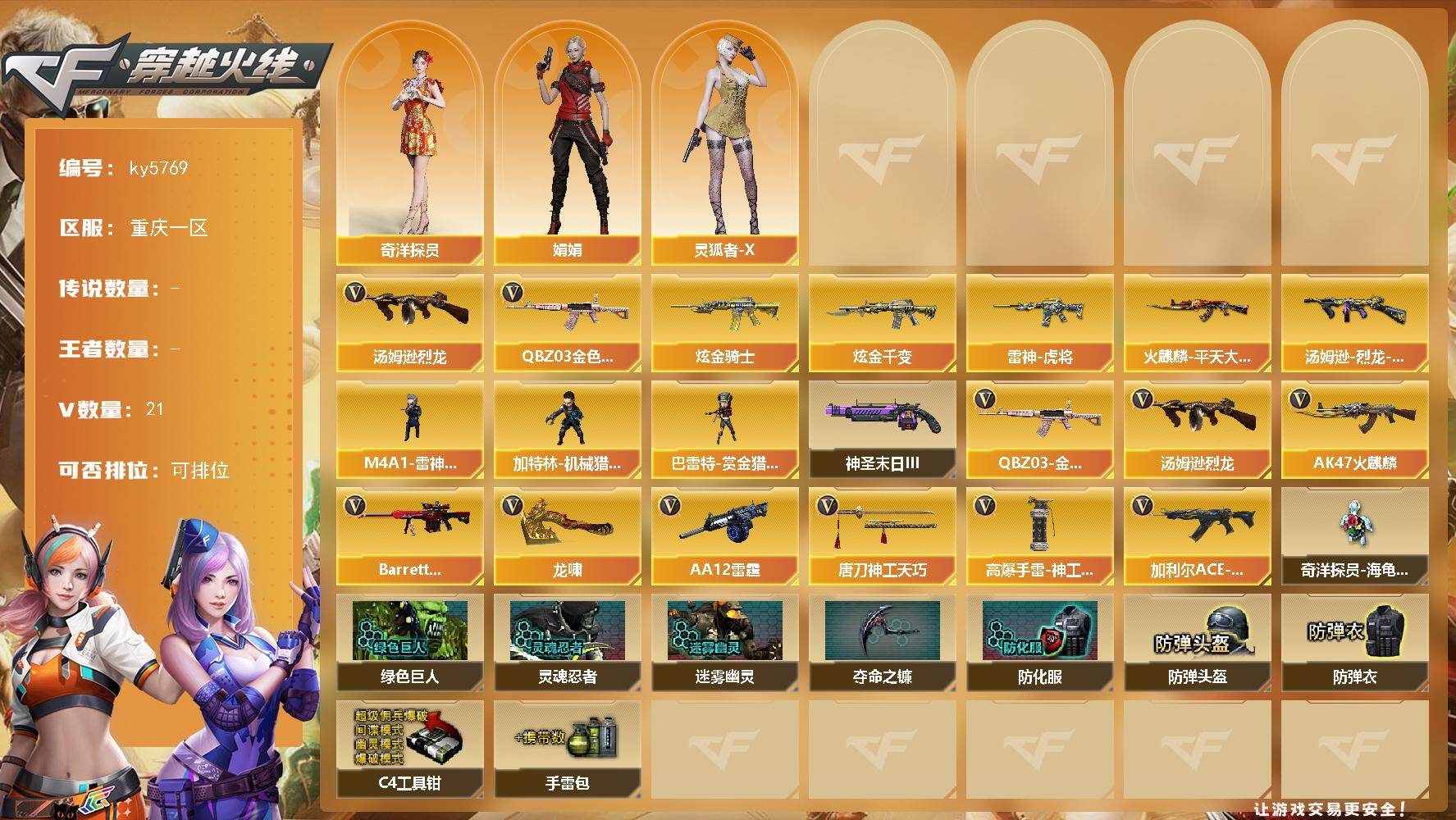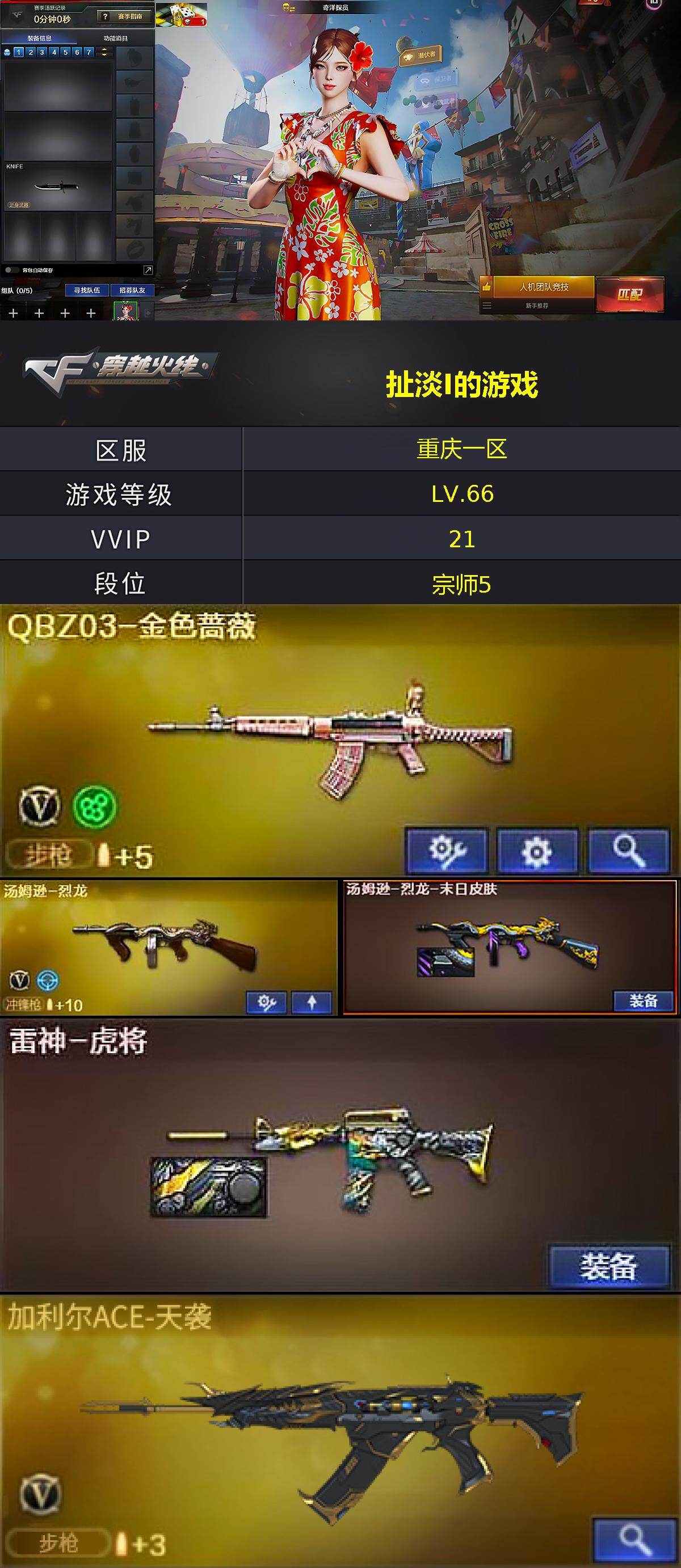 [16846672]重庆一区-22V-0王者武器数-2炫金武器数 【热门武器】:QBZ03-金色蔷薇,汤姆逊-烈龙 【王者炫金武器】:炫金骑士,炫金千变 【皮肤】:汤姆逊-烈龙-末日皮肤,雷神-虎将,火麒麟-平天大圣 【角色】:奇洋探员,娟娟,灵狐者-X 【人偶武器】:M4A1-雷神-精英刀锋,加特林-机械猎手,巴雷特-赏金猎人 【挑战大师】:神圣爆裂者-末日III 【英雄级武器】:AK47-火麒麟,QBZ03-金色蔷薇,加利尔ACE-天袭,Barrett-极光,汤姆逊-烈龙,AA-12-雷霆,龙啸,唐刀-神工天巧,高爆手雷-神工天巧 【道具】:奇洋探员-海龟背包,绿色巨人,灵魂忍者,迷雾幽灵,夺命之镰,防化服*2,防弹头盔*2,防弹衣*2,C4工具钳*2,手雷包*2 【特殊枪械】:1烈龙