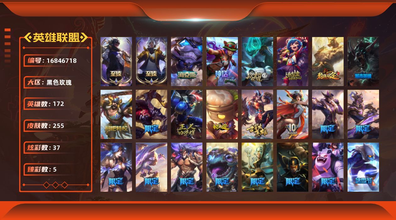 [16846718]【特价出售/店主推荐】白银段位-172英雄-255皮肤-37炫彩-0终极-7神话-31限定-18传说-62史诗