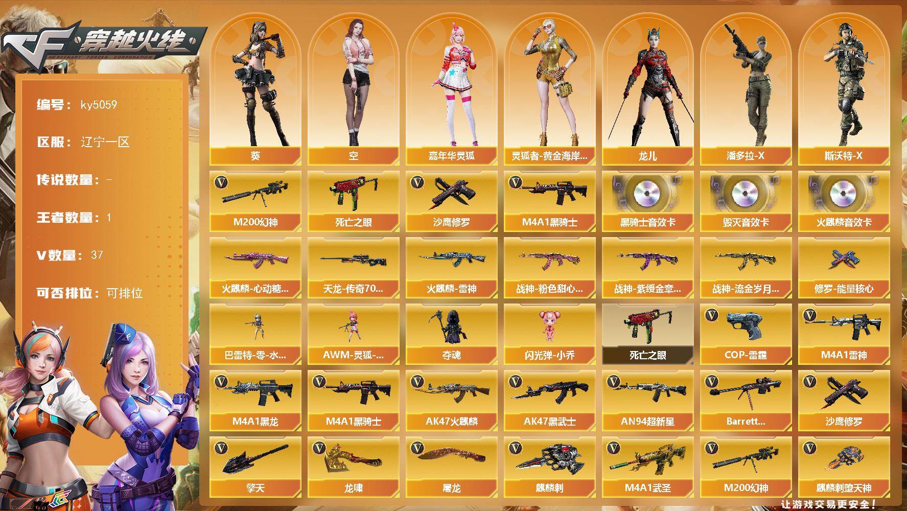 [16846723]辽宁一区-37V-1王者-0炫金 【热门武器】:M200-幻神,死亡之眼,M4A1-黑骑士,沙鹰-修罗 【音效卡】:AK47-火麒麟音效卡,M4A1-黑骑士音效卡*2,Barrett-毁灭音效卡 【皮肤】:火麒麟-雷神,火麒麟-心动糖果,战神-粉色甜心皮肤*2,战神-紫绶金章皮肤*5,战神-流金岁月皮肤*2,AWM-天龙-传奇70KG,修罗-能量核心 【角色】:葵,空,嘉年华灵狐,灵狐者-黄金海岸,龙儿,潘多拉-X,斯沃特-X,新娜塔莎,影武者-X 【人偶武器】:巴雷特-零-水下丽影,AWM-灵狐-15周年嘉年华,夺魂,闪光弹-小乔 【暴走生化】:死亡之眼 【英雄级武器】:AK47-火麒麟*2,M4A1-黑龙,M4A1-雷神*2,M4A1-黑骑士,AK47-黑武士,AN94-超新星,M4A1-武圣,无影-神兵利器,王者之势-觉醒版,AK-47-猩红传说*6,AK47-B-战神,Barrett-毁灭,M200-幻神,沙鹰-修罗,COP-雷霆,屠龙,龙啸,麒麟刺-堕天神,擎天,麒麟刺,高爆手雷-雷霆,高爆手雷-堕天神,闪光弹-雷霆,闪光弹-堕天神,烟雾弹-雷霆,烟雾弹-堕天神 【道具】:炫彩背包,超级背包,绿色巨人,灵魂忍者,迷雾幽灵,夺命之镰,防化服*2,金色流光-枪王排位*2,斯沃特表情,循环实验表情,防弹头盔*4,防弹衣*4,C4工具钳*3,手雷包*2 【特殊枪械】:1黑骑士