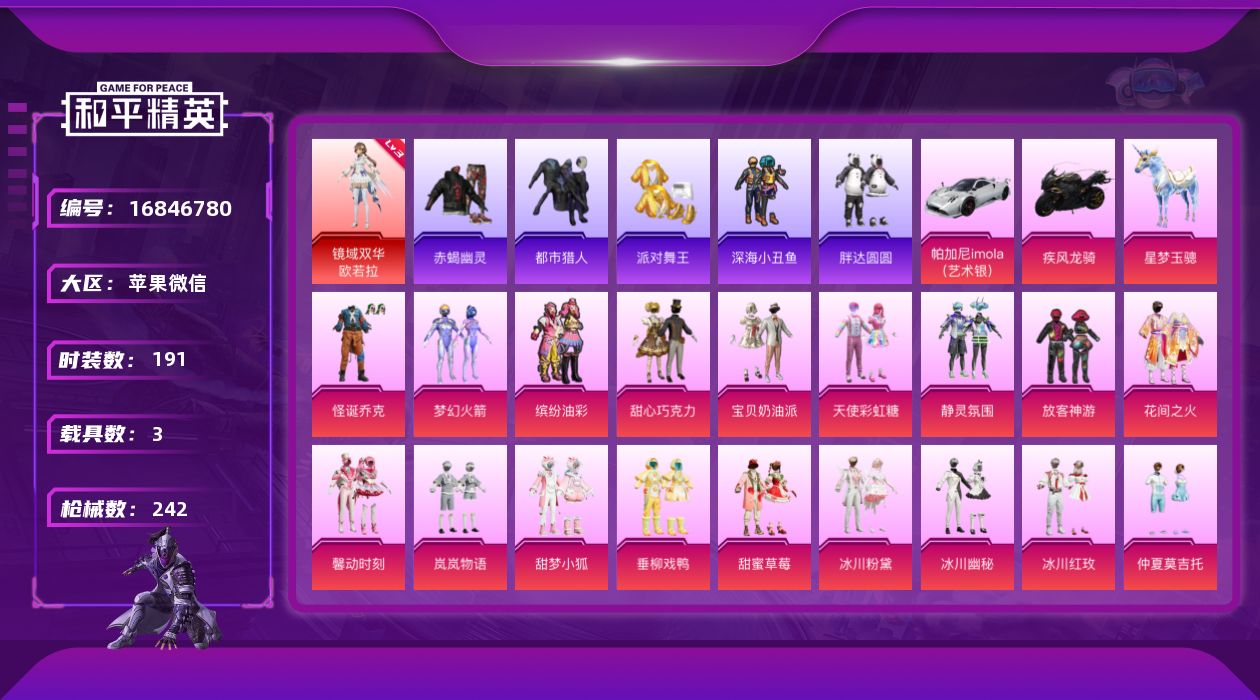 [16846780]【特价出售/店主推荐】苹果 微信-1神装-30粉装-10特效枪-3载具-14粉色飞行器-98504热力值-10王牌印记-191套装-242枪皮