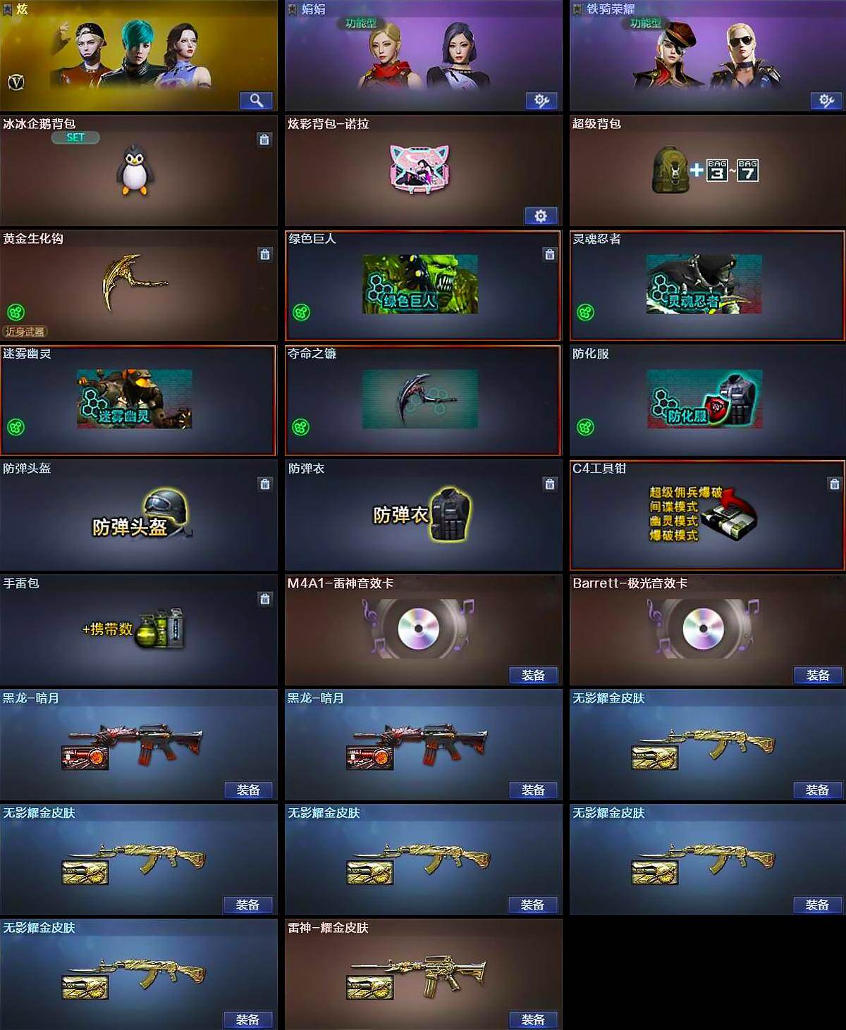【道具】:冰冰企鹅背包,炫彩背包-诺拉,超级背包,黄金生化钩,绿色巨人,灵魂忍者,迷雾幽灵,夺命之镰,防化服,防弹头盔,防弹衣,C4工具钳,手雷包