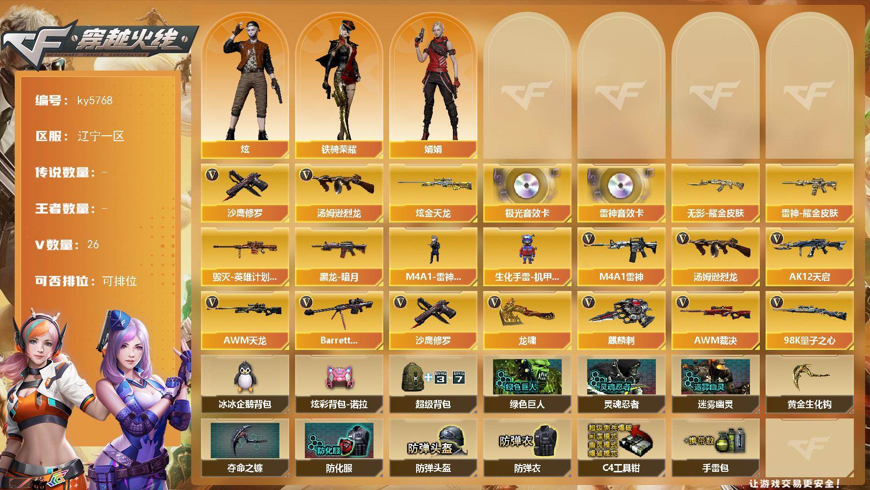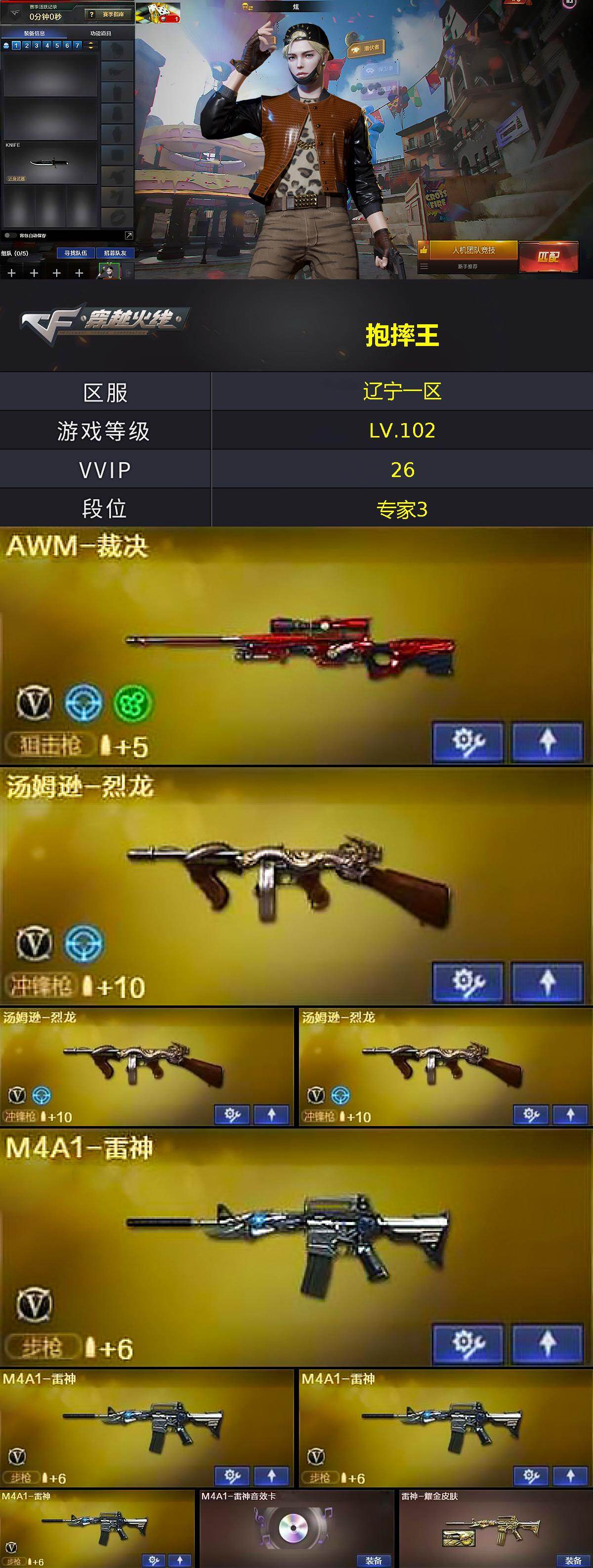 [16846980]辽宁一区-26V-0王者武器数-1炫金武器数 【热门武器】:汤姆逊-烈龙*3,沙鹰-修罗*4 【王者炫金武器】:炫金天龙 【音效卡】:M4A1-雷神音效卡,Barrett-极光音效卡 【皮肤】:雷神-耀金皮肤,毁灭-英雄计划 皮肤,黑龙-暗月*2,无影耀金皮肤*5 【角色】:炫,娟娟,铁骑荣耀 【人偶武器】:M4A1-雷神-精英刀锋,生化手雷-机甲核心 【英雄级武器】:M4A1-雷神*4,AK12-天启*2,AWM-天龙,Barrett-毁灭*5,AWM-裁决,Kar98K-量子之心,汤姆逊-烈龙*3,沙鹰-修罗*4,龙啸,麒麟刺*3 【道具】:冰冰企鹅背包,炫彩背包-诺拉,超级背包,黄金生化钩,绿色巨人,灵魂忍者,迷雾幽灵,夺命之镰,防化服,防弹头盔,防弹衣,C4工具钳,手雷包 【特殊枪械】:3烈龙