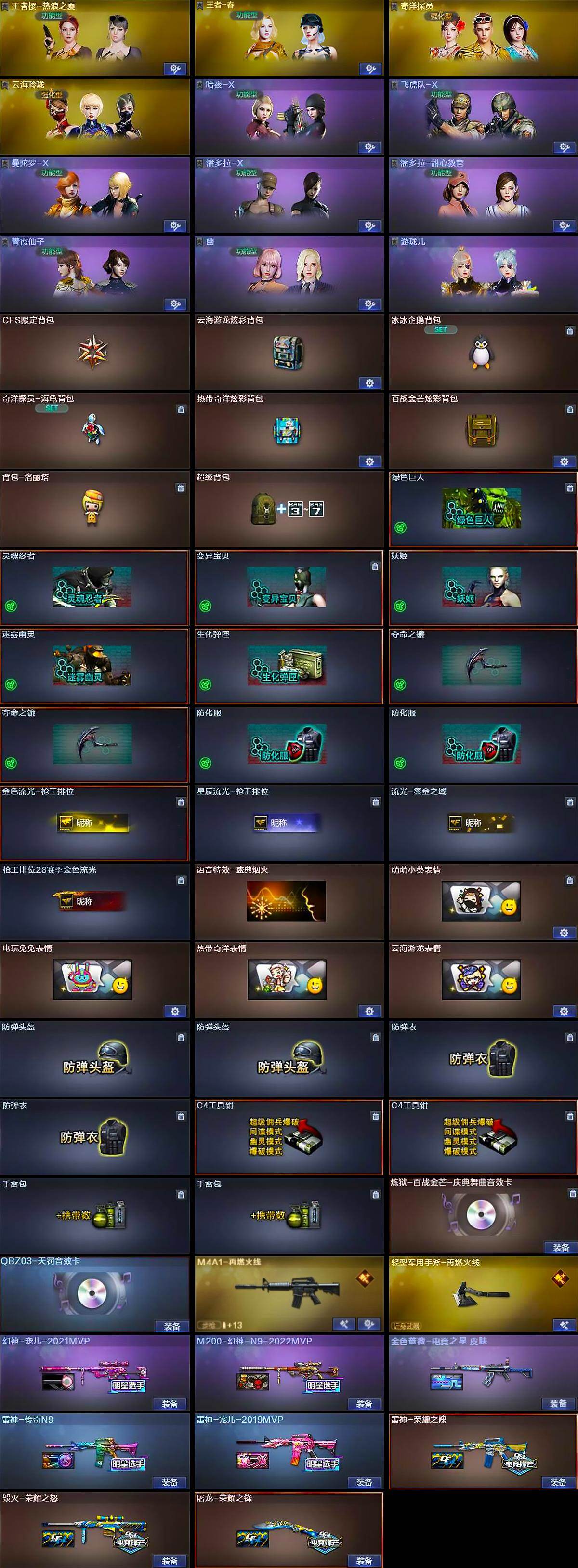 【道具】:CFS限定背包,云海游龙炫彩背包,冰冰企鹅背包,奇洋探员-海龟背包,热带奇洋炫彩背包,百战金芒炫彩背包,背包-洛丽塔,超级背包,绿色巨人,灵魂忍者,变异宝贝,妖姬,迷雾幽灵,生化弹匣,夺命之镰*2,防化服*2,金色流光-枪王排位,星辰流光-枪王排位,流光-鎏金之域,枪王排位28赛季金色流光,语音特效-盛典烟火,萌萌小葵表情,电玩兔兔表情,热带奇洋表情,云海游龙表情,防弹头盔*2,防弹衣*2,C4工具钳*2,手雷包*2