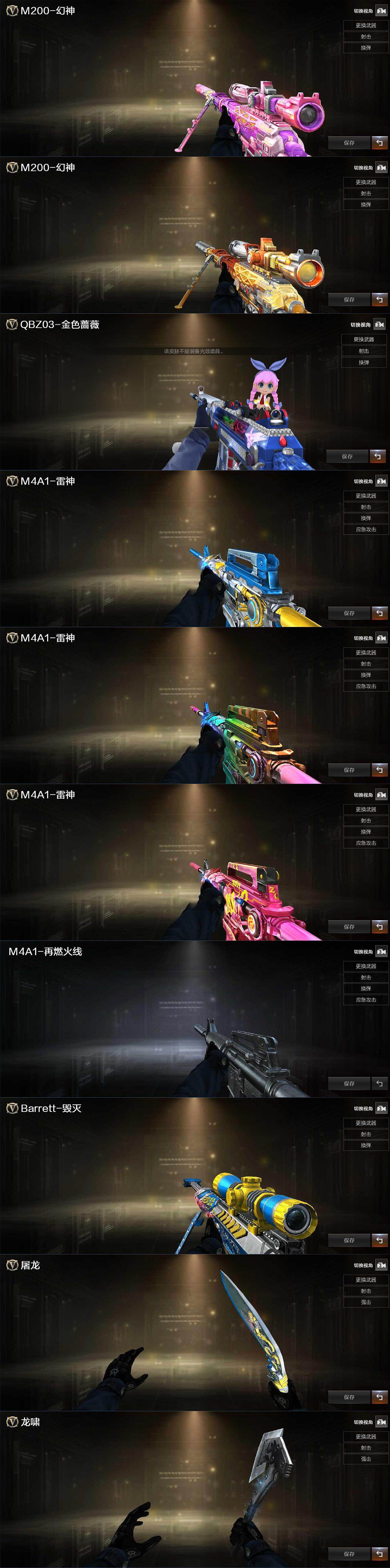 【英雄级武器】:M4A1-雷神,M4A1-黑骑士,黑武士-锦绣游龙,超新星-热带奇洋,QBZ03-金色蔷薇,QBZ-03-王者蔷薇-觉醒版,白虎-电玩蓝兔,王者芳薇-觉醒版,Barrett-毁灭,AWM-裁决,M200-幻神,炼狱-百战金芒,烈龙-云海游龙,沙鹰-修罗*2,沙鹰-天神,COP 357-幻灵,COP 357-云龙,屠龙*2,幻灵之锋,擎天-云海游龙,龙啸-热带奇洋,麒麟刺-百战金芒,高爆手雷-雷霆,高爆手雷-幻灵*2,高爆手雷-云龙,手雷-云海游龙,手雷-热带奇洋,闪光弹-雷霆*2,闪光弹-幻灵,烟雾弹-雷霆,烟雾弹-幻灵*2,烟雾弹-荣耀世冠EP