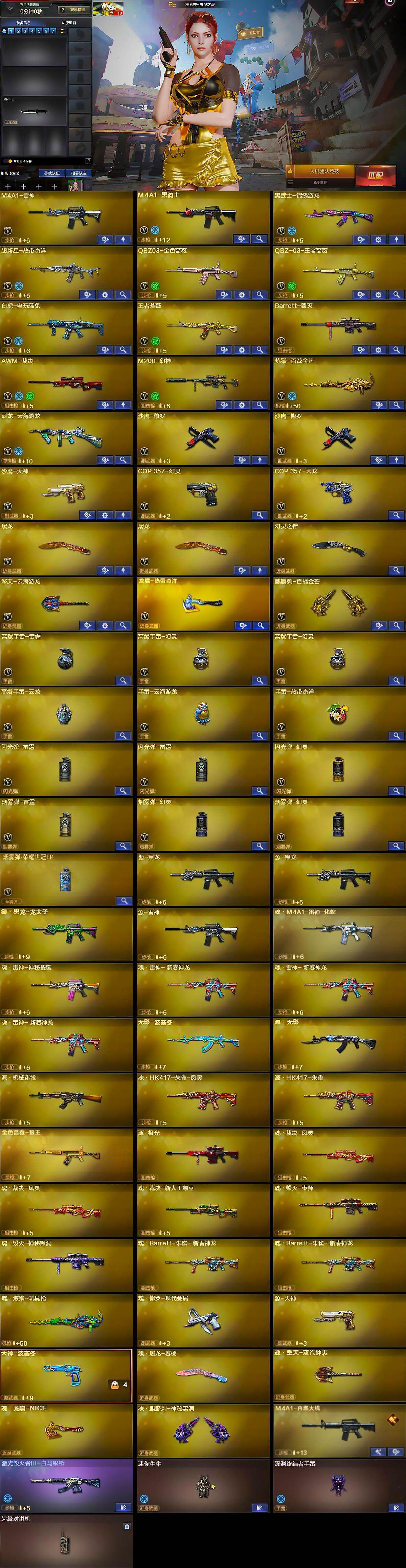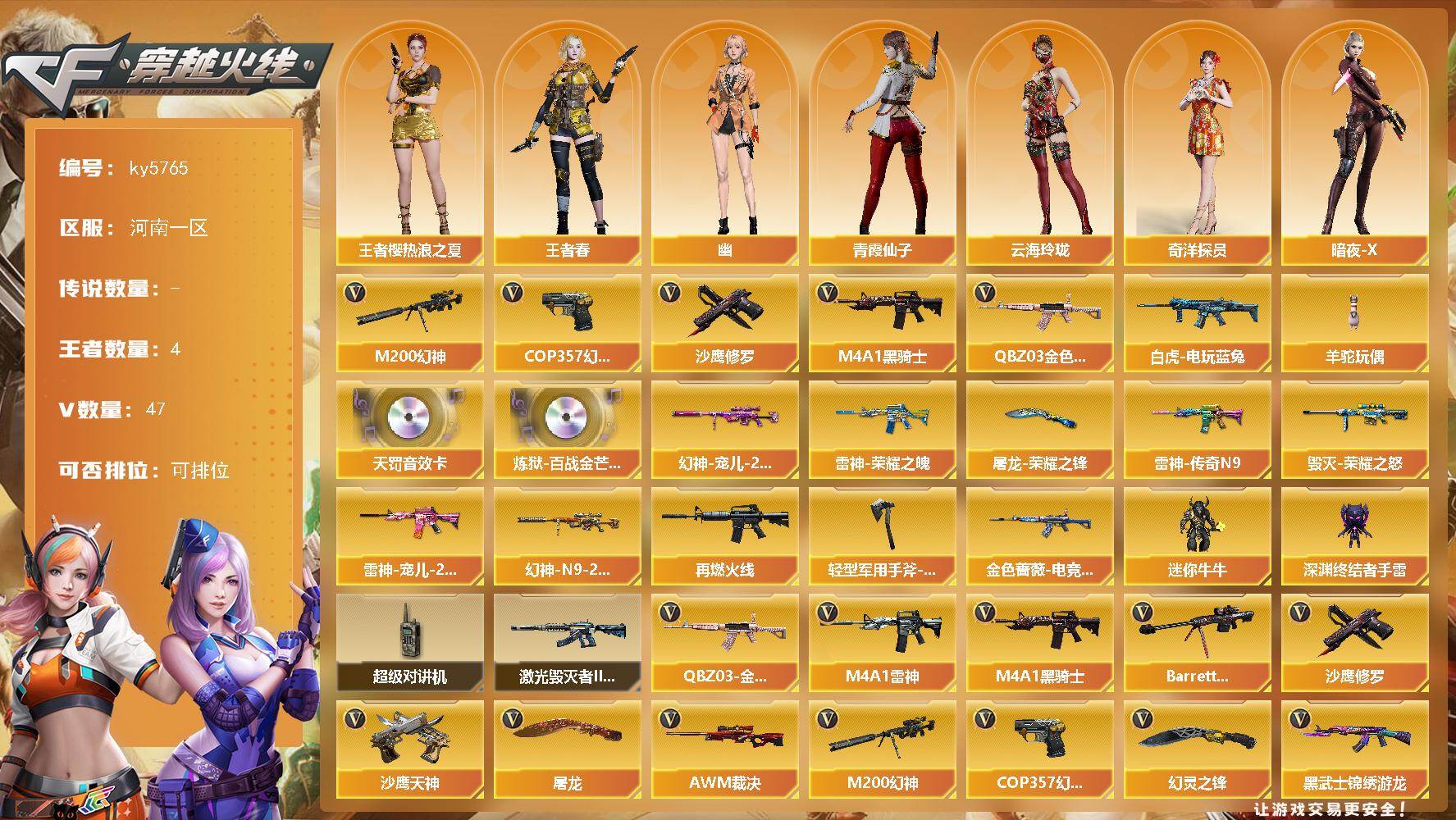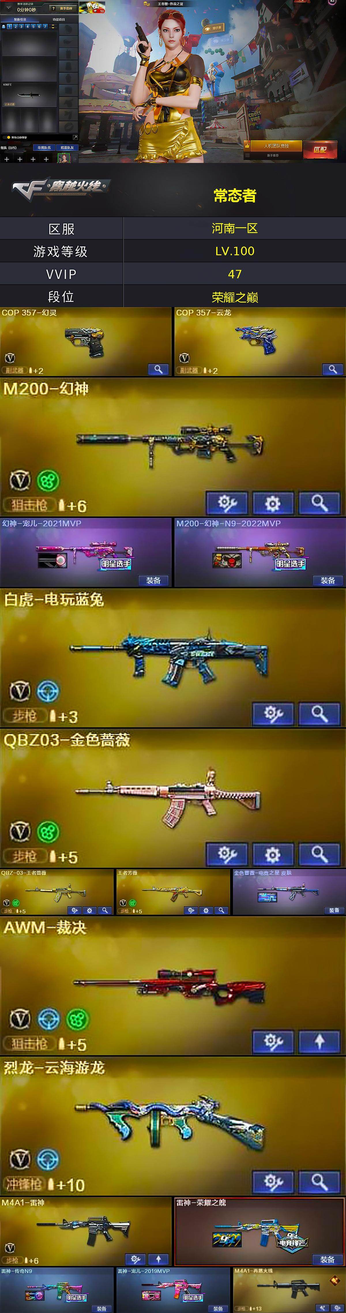 [16847876]河南一区-49V-4王者武器数-0炫金武器数 【热门武器】:QBZ03-金色蔷薇,M200-幻神,白虎-电玩蓝兔,M4A1-黑骑士,羊驼玩偶,COP 357-幻灵,沙鹰-修罗*2 【音效卡】:QBZ03-天罚音效卡,炼狱-百战金芒-庆典舞曲音效卡 【皮肤】:幻神-宠儿-2021MVP,M200-幻神-N9-2022MVP,金色蔷薇-电竞之星 皮肤,雷神-荣耀之魄,雷神-传奇N9,雷神-宠儿-2019MVP,M4A1-再燃火线,毁灭-荣耀之怒,屠龙-荣耀之锋,轻型军用手斧-再燃火线 【角色】:王者樱-热浪之夏,王者春,奇洋探员,云海玲珑,暗夜-X,飞虎队-X,兰-新年限定,曼陀罗-X,潘多拉-X,潘多拉-甜心教官,青霞仙子,幽,游珑儿 【人偶武器】:迷你牛牛,深渊终结者手雷 【暴走生化】:超级对讲机 【挑战大师】:激光毁灭者III-白马银枪 【英雄级武器】:M4A1-雷神,M4A1-黑骑士,黑武士-锦绣游龙,超新星-热带奇洋,QBZ03-金色蔷薇,QBZ-03-王者蔷薇-觉醒版,白虎-电玩蓝兔,王者芳薇-觉醒版,Barrett-毁灭,AWM-裁决,M200-幻神,炼狱-百战金芒,烈龙-云海游龙,沙鹰-修罗*2,沙鹰-天神,COP 357-幻灵,COP 357-云龙,屠龙*2,幻灵之锋,擎天-云海游龙,龙啸-热带奇洋,麒麟刺-百战金芒,高爆手雷-雷霆,高爆手雷-幻灵*2,高爆手雷-云龙,手雷-云海游龙,手雷-热带奇洋,闪光弹-雷霆*2,闪光弹-幻灵,烟雾弹-雷霆,烟雾弹-幻灵*2,烟雾弹-荣耀世冠EP 【道具】:CFS限定背包,云海游龙炫彩背包,冰冰企鹅背包,奇洋探员-海龟背包,热带奇洋炫彩背包,百战金芒炫彩背包,背包-洛丽塔,超级背包,绿色巨人,灵魂忍者,变异宝贝,妖姬,迷雾幽灵,生化弹匣,夺命之镰*2,防化服*2,金色流光-枪王排位,星辰流光-枪王排位,流光-鎏金之域,枪王排位28赛季金色流光,语音特效-盛典烟火,萌萌小葵表情,电玩兔兔表情,热带奇洋表情,云海游龙表情,防弹头盔*2,防弹衣*2,C4工具钳*2,手雷包*2 【特殊枪械】:1黑骑士