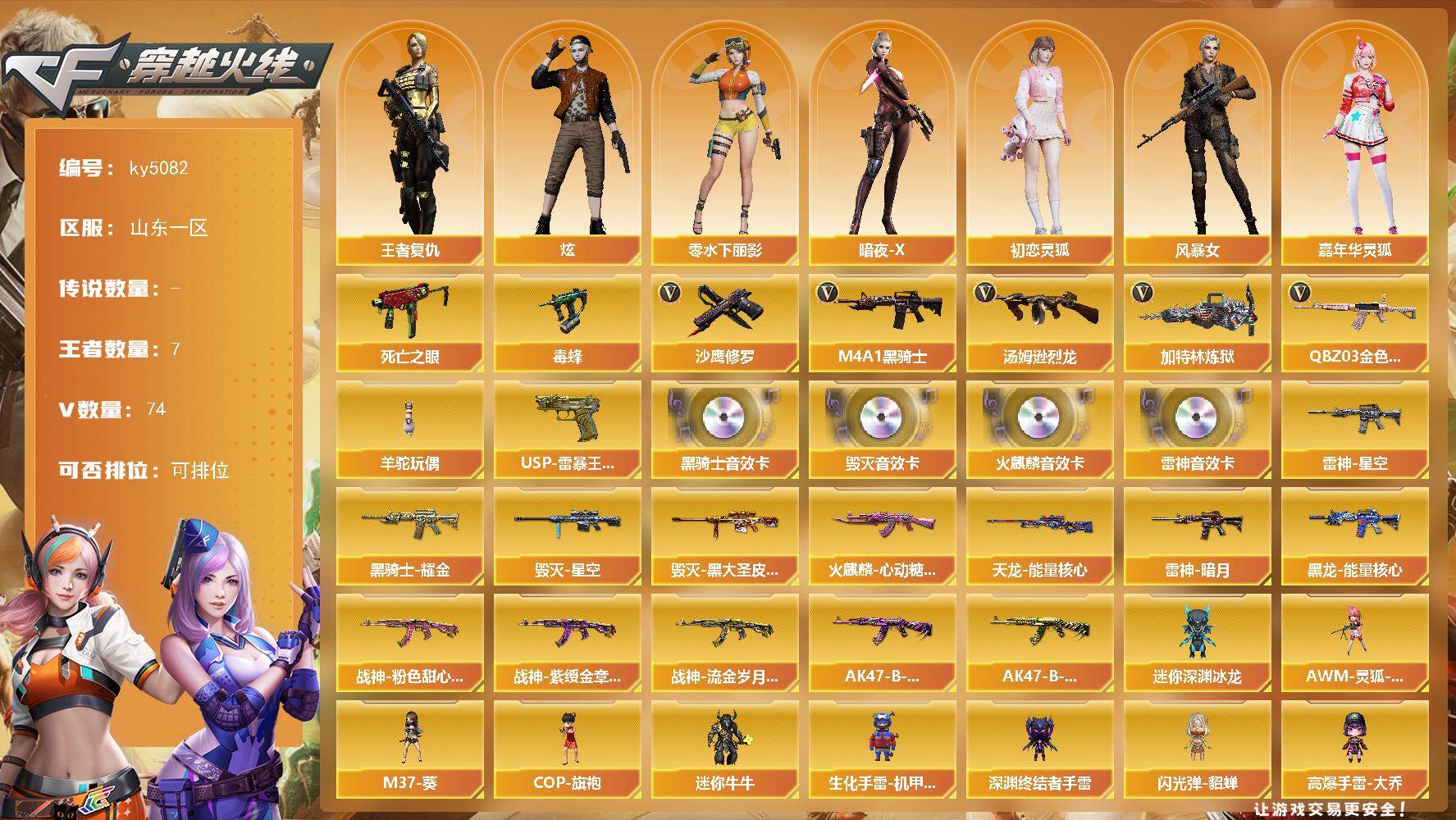 [16849398]山东一区-80V-7王者武器数-0炫金武器数 【热门武器】:QBZ03-金色蔷薇,死亡之眼,毒蜂,M4A1-黑骑士,汤姆逊-烈龙*5,加特林-炼狱*2,羊驼玩偶,沙鹰-修罗*3 【王者炫金武器】:USP-雷暴王者 【音效卡】:AK47-火麒麟音效卡,M4A1-雷神音效卡,M4A1-黑骑士音效卡,Barrett-毁灭音效卡 【皮肤】:雷神-暗月,雷神-星空,火麒麟-心动糖果,毁灭-星空,毁灭-黑大圣皮肤,黑龙-能量核心,黑骑士耀金皮肤,战神-粉色甜心皮肤,战神-紫绶金章皮肤,战神-流金岁月皮肤,AK47-B-常胜将军-曹操*2,AK47-B-常胜将军-孙权*2,天龙-能量核心 【角色】:炫,王者复仇,暗夜-X,初恋灵狐,风暴女,嘉年华灵狐,兰-海滩派对,零-水下丽影,灵狐者-黄金海岸,麻雀,潘多拉-甜心教官,潜龙队-X,斯沃特-X 【人偶武器】:加特林-机械猎手,AWM-灵狐-15周年嘉年华,M37-葵,COP-旗袍,迷你深渊冰龙,迷你牛牛*2,生化手雷-机甲核心*4,深渊终结者手雷,闪光弹-貂蝉,高爆手雷-大乔 【暴走生化】:毒蜂,死亡之眼,超级对讲机 【挑战大师】:冰龙粉碎者-白马银枪,激光毁灭者III-白马银枪,神圣爆裂者-末日III,阐释者III 【英雄级武器】:AK47-火麒麟*3,M4A1-黑龙*3,M4A1-雷神*4,M4A1-黑骑士,M4A1-死神,AK47-黑武士*2,M4A1-武圣*2,M4A1-雷霆,无影-神兵利器,黑武士-锦绣游龙,QBZ03-金色蔷薇,AK-47-猩红传说*2,AK47-B-常胜将军,AWM-天龙,Barrett-毁灭*4,Barrett-极光,Barrett-金色蔷薇,王者之怒-觉醒版,加特林-炼狱*2,汤姆逊-烈龙*5,沙鹰-修罗*3,沙鹰-天神*4,COP-雷霆,屠龙*3,擎天,麒麟刺,王者之击-觉醒版*2,高爆手雷-雷霆*5,闪光弹-雷霆*5,闪光弹-竞技荣光,烟雾弹-雷霆*5 【道具】:CFS限定背包,全能枪王背包,冰冰企鹅背包,炫彩背包,背包-葫芦兄弟,超级背包,绿色巨人,灵魂忍者,变异宝贝,迷雾幽灵,夺命之镰*2,防化服*2,金色流光-枪王排位*2,星辰流光-枪王排位,枪王排位28赛季金色流光,电玩兔兔表情,EP战队名片,EP战队喷图,EP战队击杀图标,防弹头盔*2,防弹衣*2,C4工具钳*3,手雷包*3 【特