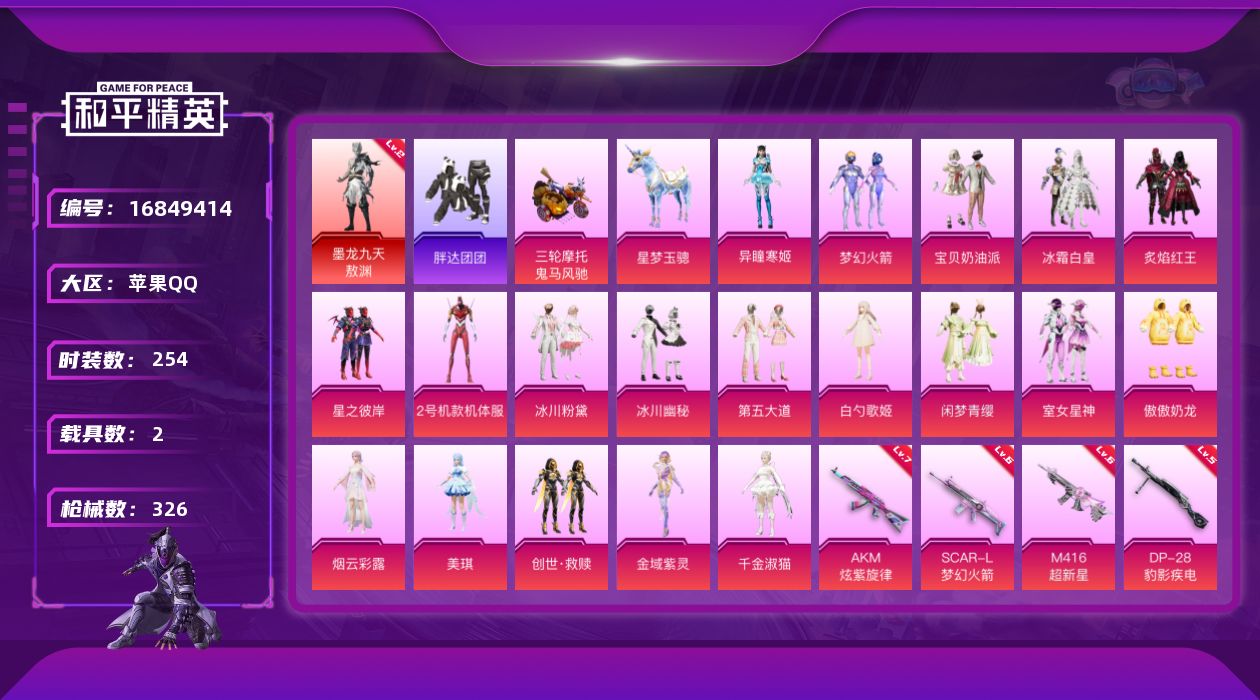 [16849414]2级敖渊红螳螂新101 童趣头盔!苹果 手Q-1神装-19粉装-13特效枪-2载具-5粉色飞行器-112914热力值-15王牌印记-254套装-326枪皮 【红色神装等级】:墨龙九天-敖渊(二级) 【红色角色神装】:墨龙九天-敖渊 【热门品类】:粉装-梦幻火箭,套装-浪漫天命,套装-小丑鱼,套装-胖达团团,套装-星河浪客,套装-SS1特训,旭日初心兜帽大衣,套装-龟仙人,套装-浪漫波比,套装-粉红小猪,角色-8号机,角色-Mark.06,小恶魔头饰 【粉色载具】:鬼马风驰,星梦玉骢 【粉色套装】:粉装-宝贝奶油派,粉装-梦幻火箭,粉装-冰霜白皇,粉装-炙焰红王,粉装-星之彼岸,角色-2号机款机体服,粉装-冰川粉黛,粉装-冰川幽秘,粉装-第五大道,角色-白勺歌姬,粉装-闲梦青缨,粉装-室女星神,粉装-傲傲奶龙,角色-烟云彩露,角色-美琪,套装-创世·救赎,角色-金域紫灵,角色-千金淑猫,角色-异瞳寒姬 【粉色枪皮等级】:AKM-炫紫旋律(七级),AKM-绿萝繁花(五级),SCAR-L-梦幻火箭(六级),SCAR-L-纯梦嫁纱(四级),SCAR-L-锦绣绵绵(五级),M416-超新星(六级),M416-电玩时刻(五级),M416-墨龙九天(三级),GROZA-镜光银凌(五级),AUG-暖羊咩咩(五级),UMP45-量子极限(五级),Kar98K-巳巳如意(五级),DP-28-豹影疾电(五级) 【粉色枪皮】:AKM-炫紫旋律,AKM-绿萝繁花,SCAR-L-梦幻火箭,SCAR-L-纯梦嫁纱,SCAR-L-锦绣绵绵,M416-超新星,M416-电玩时刻,M416-墨龙九天,GROZA-镜光银凌,AUG-暖羊咩咩,UMP45-量子极限,Kar98K-巳巳如意,DP-28-豹影疾电 【粉色飞行器】:春暖花开飞行器,梦幻火箭飞行器,花傲天飞行器,龙翔九天飞行器 【粉色降落伞】:极限特训降落伞,春暖花开降落伞,梦幻火箭降落伞,神秘黑猫降落伞,童趣迷兔降落伞,怪笑疯兔降落伞,旋转彩虹降落伞,未来歌姬降落伞,江南烟雨降落伞,精灵梦叶罗丽降落伞,墨龙九天降落伞,初号机 觉醒Ver.降落伞,幽焰骑士降落伞,千金淑猫降落伞,鬼刀降落伞,星穹咏叹调降落伞 【稀有套装】:套装-龟仙人,套装-巳巳如意,套装-雏菊兔兔,套装-萝兰蝴蝶,套装-小熊娃娃,角色-多纳泰罗,套装-先驱飞行员,套装-糖糖葫