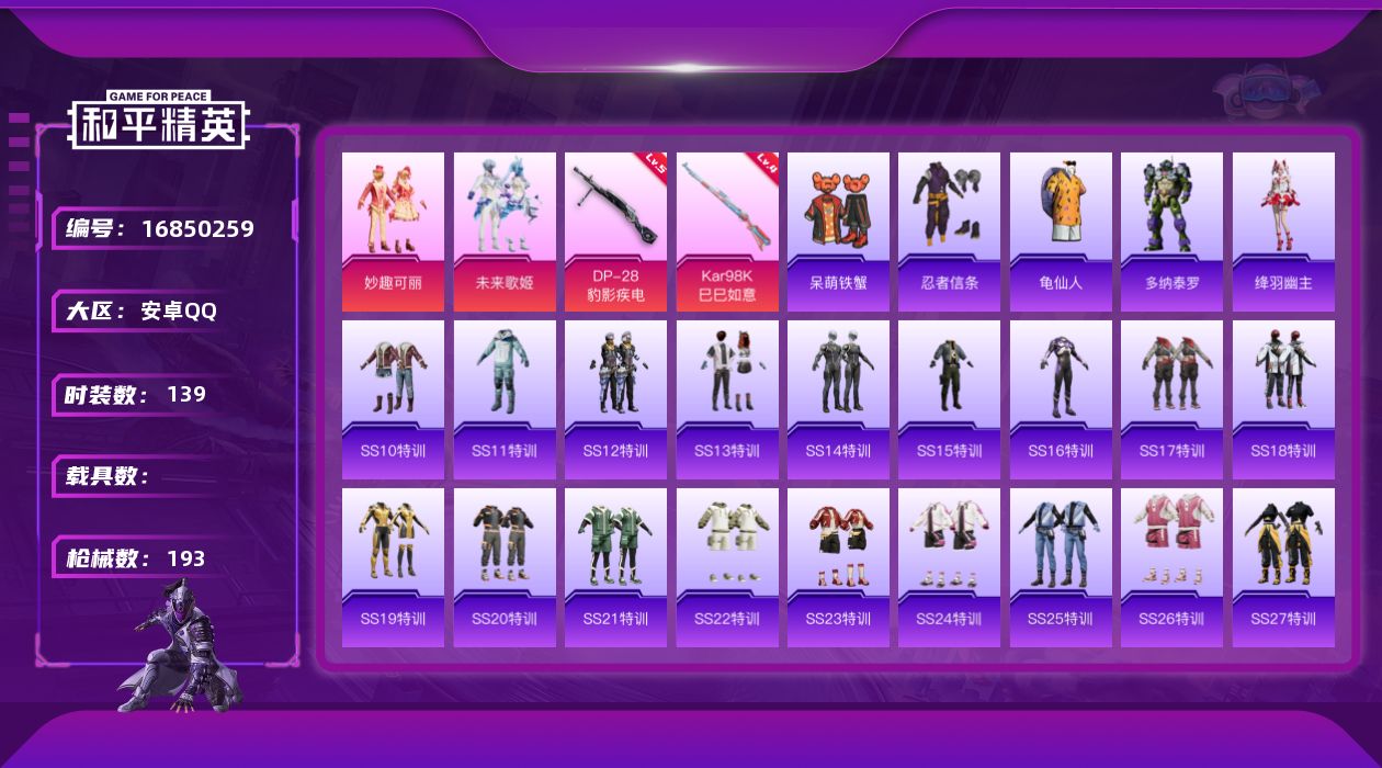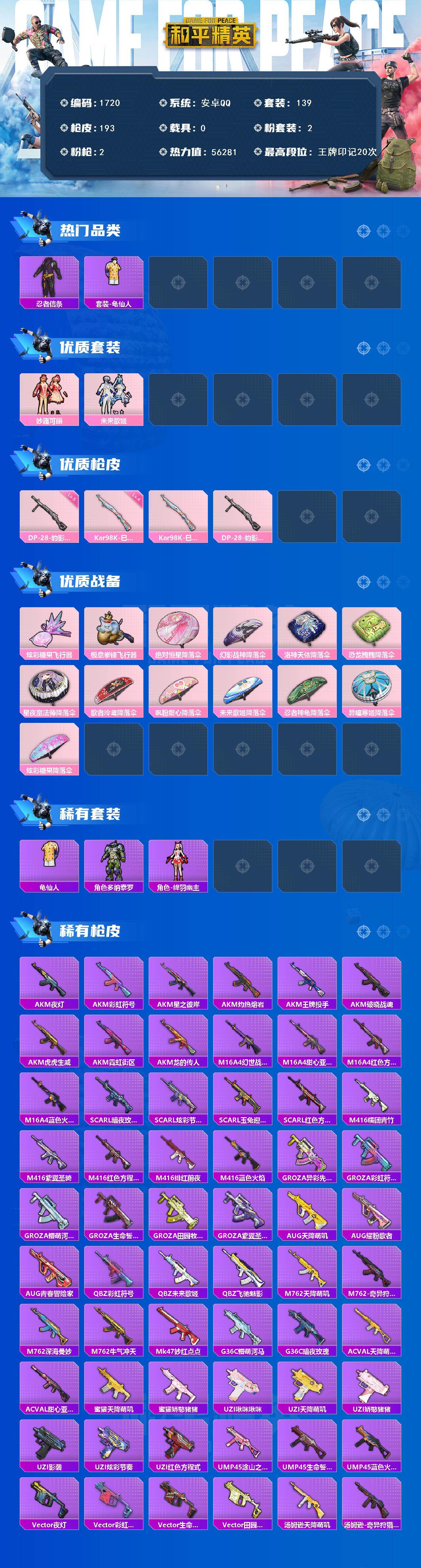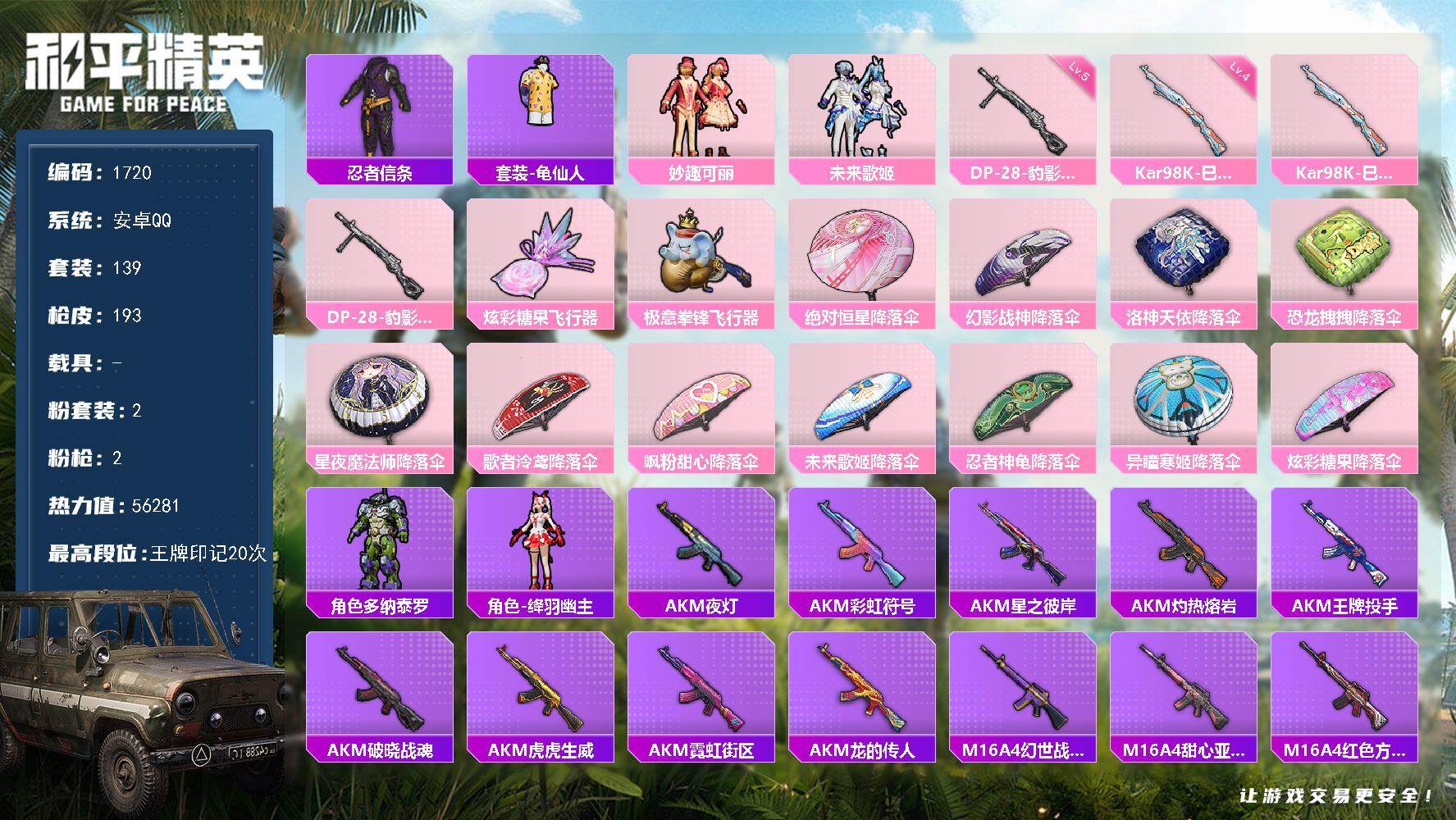 [16850259]【1720】安卓 手Q-2粉装-2特效枪-0载具-2粉色飞行器-56281热力值-20王牌印记-139套装-193枪皮