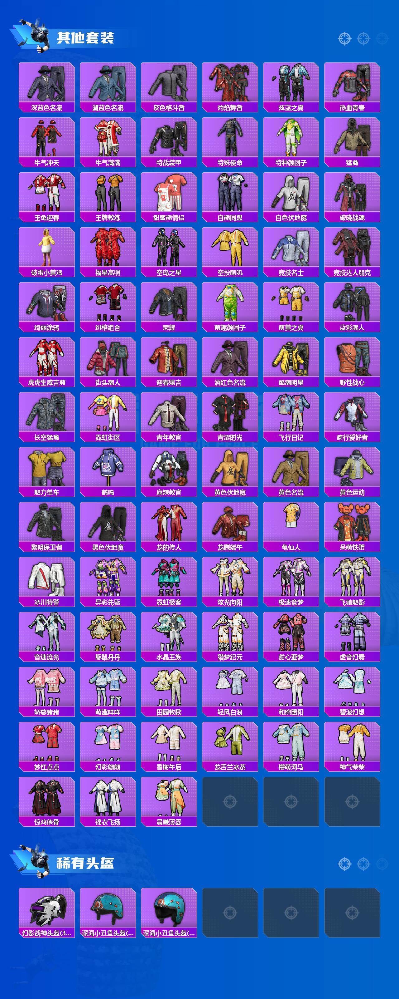 【稀有枪皮】:AKM-夜灯,AKM-彩虹符号,AKM-星之彼岸,AKM-灼热熔岩,AKM-王牌投手,AKM-破晓战魂,AKM-虎虎生威,AKM-霓虹街区,AKM-龙的传人,M16A4-幻世战舞者,M16A4-甜心亚梦,M16A4-红色方程式,M16A4-蓝色火焰,SCAR-L-暗夜玫瑰,SCAR-L-炫彩节奏,SCAR-L-玉兔迎春,SCAR-L-红色方程式,M416-糯团青竹,M416-紫翼圣骑,M416-红色方程式,M416-绯红前夜,M416-蓝色火焰,GROZA-异彩先驱,GROZA-彩虹符号,GROZA-懵萌河马,GROZA-生命誓言,GROZA-田园牧歌,GROZA-紫翼圣骑,AUG-天降萌叽,AUG-耀粉歌者,AUG-青春冒险家,QBZ-彩虹符号,QBZ-未来歌姬,QBZ-飞驰魅影,M762-天降萌叽,M762-奇异狩猎者,M762-深海曼妙,M762-牛气冲天,Mk47-妙红点点,G36C-懵萌河马,G36C-暗夜玫瑰,AC-VAL-天降萌叽,AC-VAL-甜心亚梦,蜜獾-天降萌叽,蜜獾-娇憨猪猪,UZI-啾咪啾咪,UZI-天降萌叽,UZI-娇憨猪猪,UZI-影袭,UZI-炫彩节奏,UZI-红色方程式,UMP45-涂山之恋,UMP45-生命誓言,UMP45-蓝色火焰,Vector-夜灯,Vector-彩虹符号,Vector-生命誓言,Vector-田园牧歌,汤姆逊-天降萌叽,汤姆逊-奇异狩猎者,汤姆逊-异彩先驱,汤姆逊-耀粉歌者,汤姆逊-樱桃泡泡,野牛-夜灯,MP5K-异彩先驱