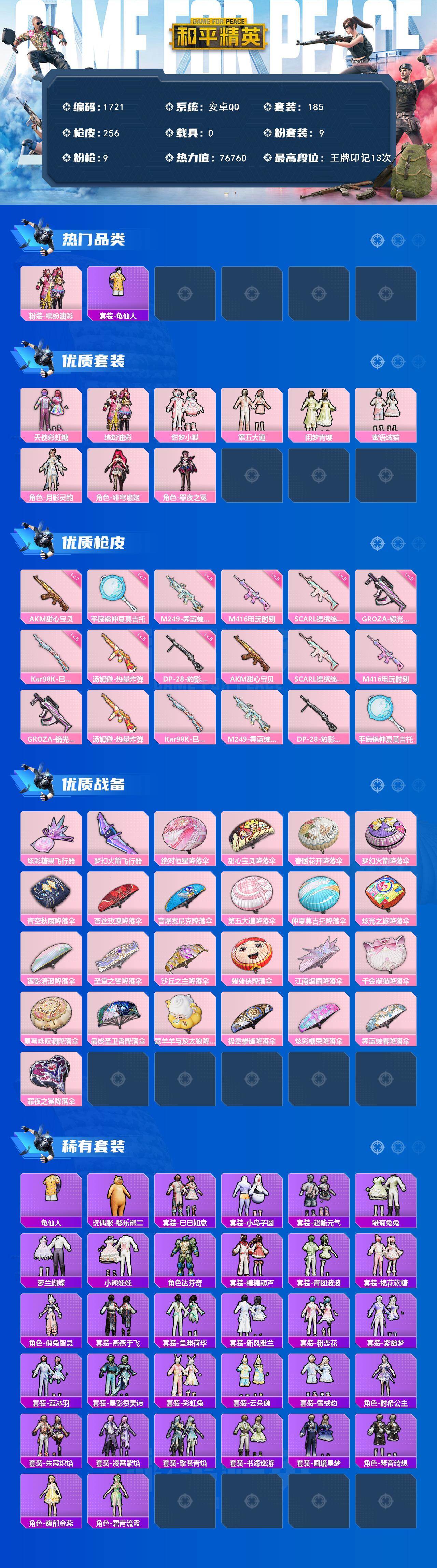 [16850530]【1721】安卓 手Q-9粉装-9特效枪-0载具-2粉色飞行器-76760热力值-13王牌印记-185套装-256枪皮