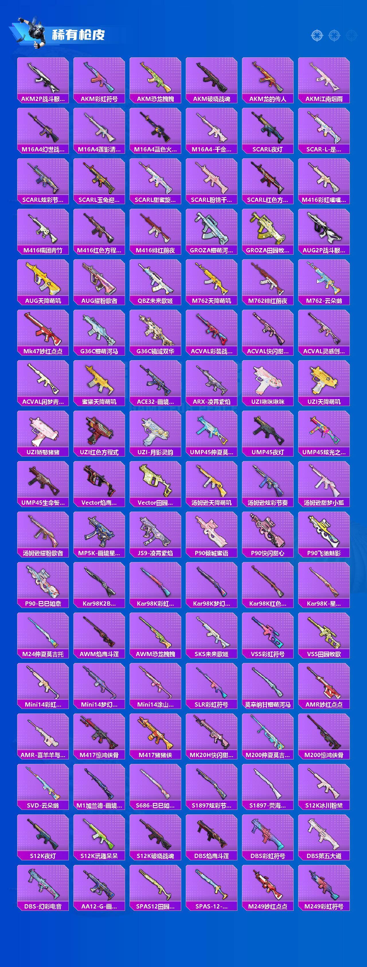 【稀有枪皮】:AUG-冰晶雪宝,AKM-2P战斗服款,AKM-彩虹符号,AKM-恐龙拽拽,AKM-江南烟雨,AKM-破晓战魂,AKM-龙的传人,M16A4-幻世战舞者,M16A4-莲影清波,M16A4-蓝