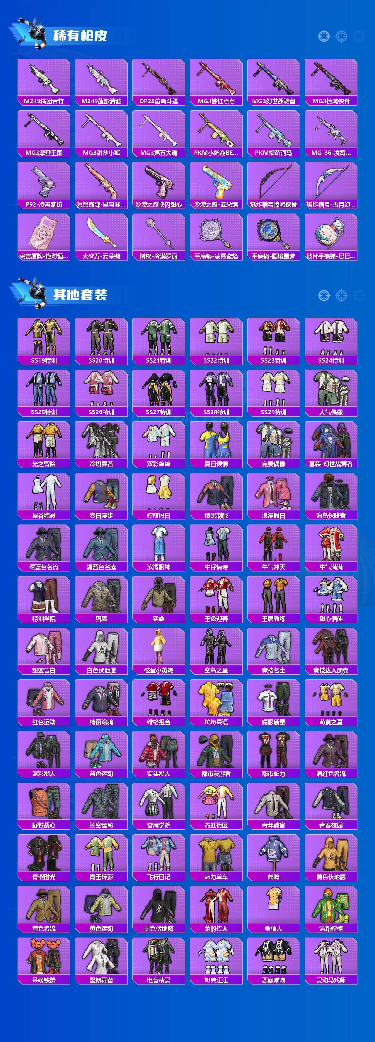 【粉色枪皮】:AKM-甜心宝贝,SCAR-L-锦绣绵绵,M416-电玩时刻,GROZA-镜光银凌,汤姆逊-热量炸弹,Kar98K-巳巳如意,M249-霁蓝缠春,DP-28-豹影疾电,平底锅-仲夏莫吉托