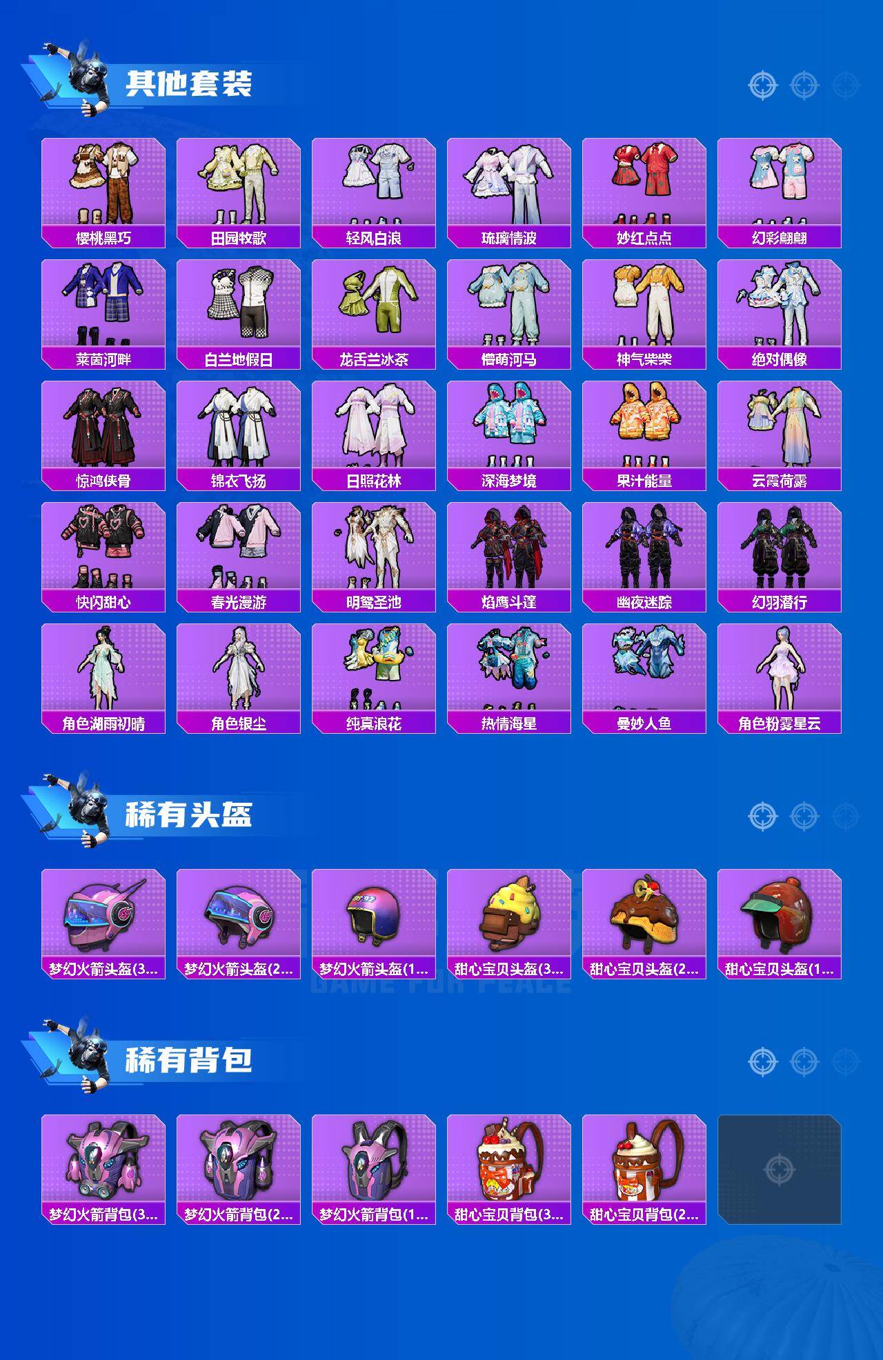 AKM-甜心宝贝,SCAR-L-锦绣绵绵,M416-电玩时刻,GROZA-镜光银凌,Kar98K-巳巳如意,平底锅-仲夏莫吉托