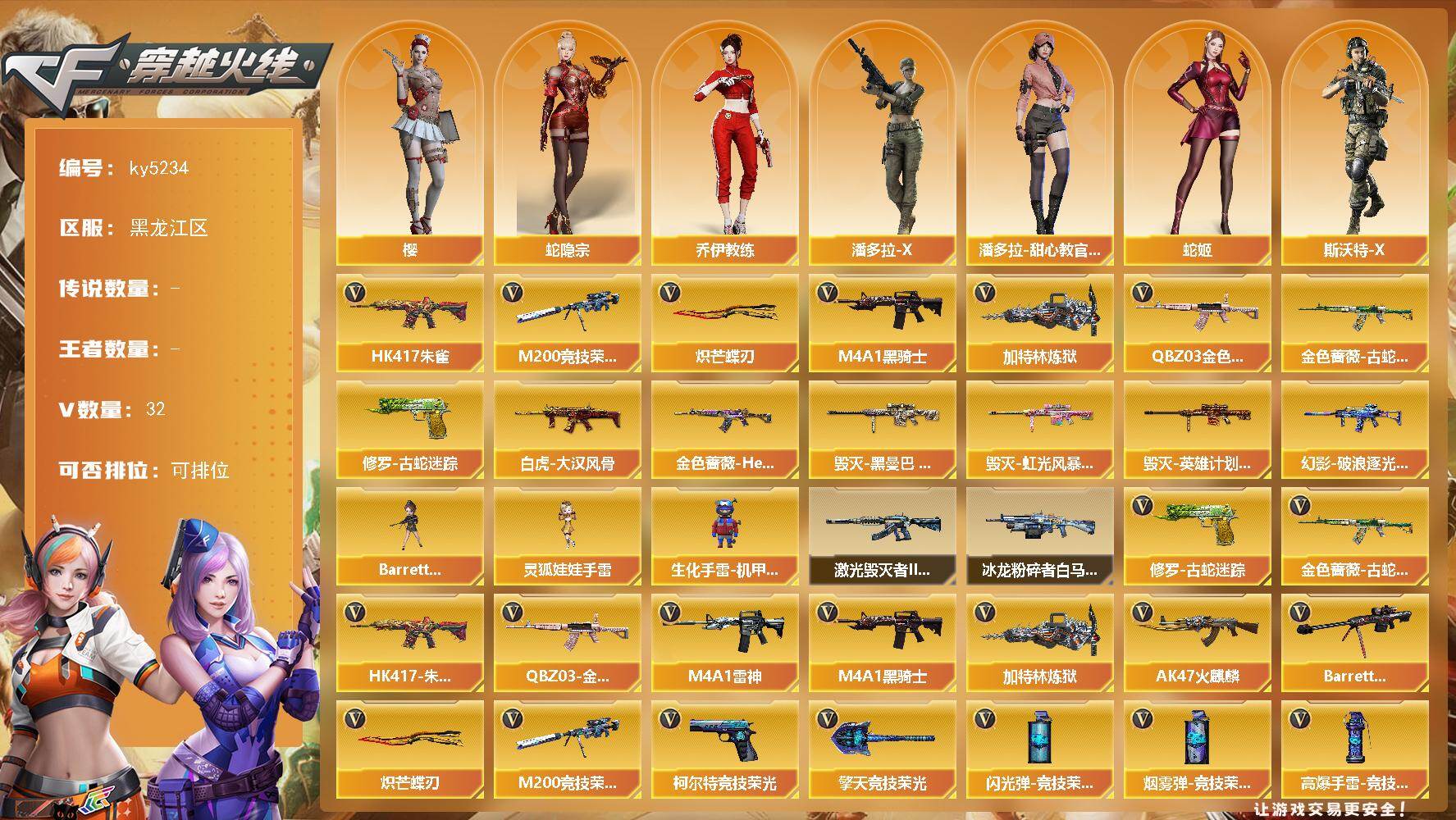[16852145]黑龙江区-32V-0王者-0炫金 【热门武器】:QBZ03-金色蔷薇,HK417-朱雀,金色蔷薇-古蛇迷踪,修罗-古蛇迷踪,M200-竞技荣光,M4A1-黑骑士,加特林-炼狱,炽芒蝶刃 【皮肤】:白虎-大汉风骨,金色蔷薇-Heartshot皮肤,毁灭-黑曼巴 皮肤,毁灭-虹光风暴 皮肤,毁灭-英雄计划 皮肤,幻影-破浪逐光 皮肤 【角色】:樱,蛇隐宗,乔伊教练,潘多拉-X,潘多拉-甜心教官,蛇姬,斯沃特-X 【人偶武器】:生化手雷-机甲核心*2,Barrett-夜玫瑰,灵狐娃娃手雷*2 【挑战大师】:冰龙粉碎者-白马银枪,激光毁灭者III-白马银枪 【英雄级武器】:AK47-火麒麟,M4A1-雷神,M4A1-黑骑士,HK417-朱雀,金色蔷薇-古蛇迷踪,QBZ03-金色蔷薇,Barrett-毁灭,M200-竞技荣光,加特林-炼狱,柯尔特-竞技荣光,USP-冥王,修罗-古蛇迷踪,擎天-竞技荣光*3,炽芒蝶刃,丛林匕首-玄豹,高爆手雷-竞技荣光*4,高爆手雷-古蛇迷踪,高爆手雷-玄豹,闪光弹-竞技荣光*2,闪光弹-玄豹,烟雾弹-竞技荣光*3,烟雾弹-古蛇迷踪,烟雾弹-玄豹,M4A1-赤狱骑士 【道具】:CFS限定背包,云山科技背包,亚洲杯纪念炫彩背包,古蛇迷踪炫彩背包,炫彩背包,超级背包,迷你冰龙背包,女皇终结者-魔龙之吻,救世主-黑桃战神,黄金生化钩,绿色巨人,灵魂忍者*2,变异宝贝,迷雾幽灵*2,夺命之镰,防化服*4,枪王排位28赛季金色流光,枪王排位29赛季金色流光,语音特效-机器人,古蛇迷踪打击特效,蛇隐宗表情,炽雪表情,EP战队名片,EP战队喷图,EP战队击杀图标,防弹头盔*4,防弹衣*4,C4工具钳*4,手雷包*4 【特殊枪械】:1黑骑士,1炼狱