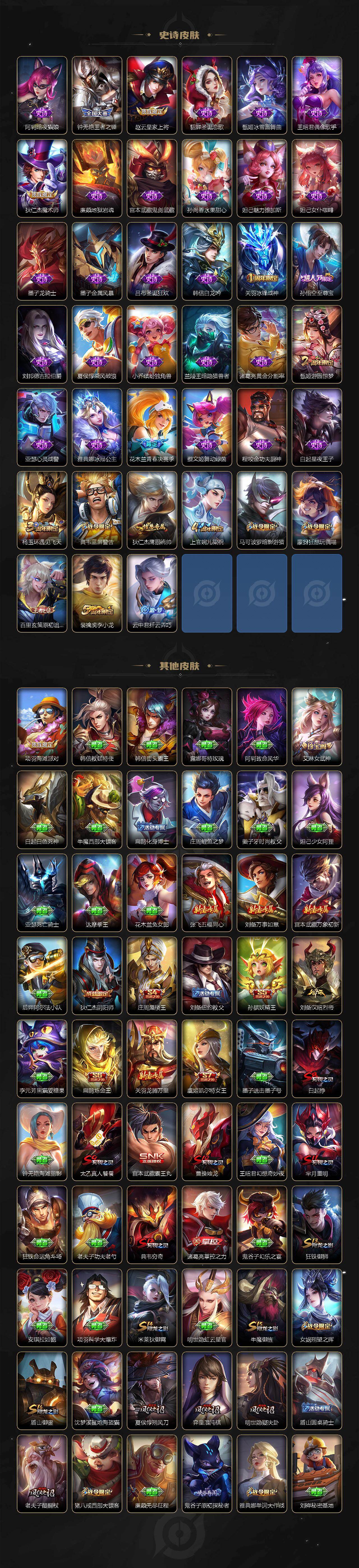【史诗皮肤】:阿轲暗夜猫娘,钟无艳王者之锤,赵云皇家上将,貂蝉圣诞恋歌,甄姬冰雪圆舞曲,王昭君偶像歌手,狄仁杰魔术师,廉颇地狱岩魂,宫本武藏鬼剑武藏,孙尚香水果甜心,妲己魅力维加斯,妲己女仆咖啡,墨子龙骑士,墨子金属风暴,吕布圣诞狂欢,韩信白龙吟,关羽冰锋战神,孙悟空至尊宝,刘邦德古拉伯爵,夏侯惇乘风破浪,小乔缤纷独角兽,兰陵王暗隐猎兽者,诸葛亮黄金分割率,甄姬游园惊梦,亚瑟心灵战警,雅典娜冰冠公主,花木兰青春决赛季,蔡文姬舞动绿茵,程咬金功夫厨神,白起星夜王子,杨玉环遇见飞天,典韦蓝屏警告,狄仁杰鹰眼统帅,上官婉儿梁祝,马可波罗暗影游猎,蒙犽狂想玩偶喵,百里玄策原初追逐者,裴擒虎李小龙,云中君纤