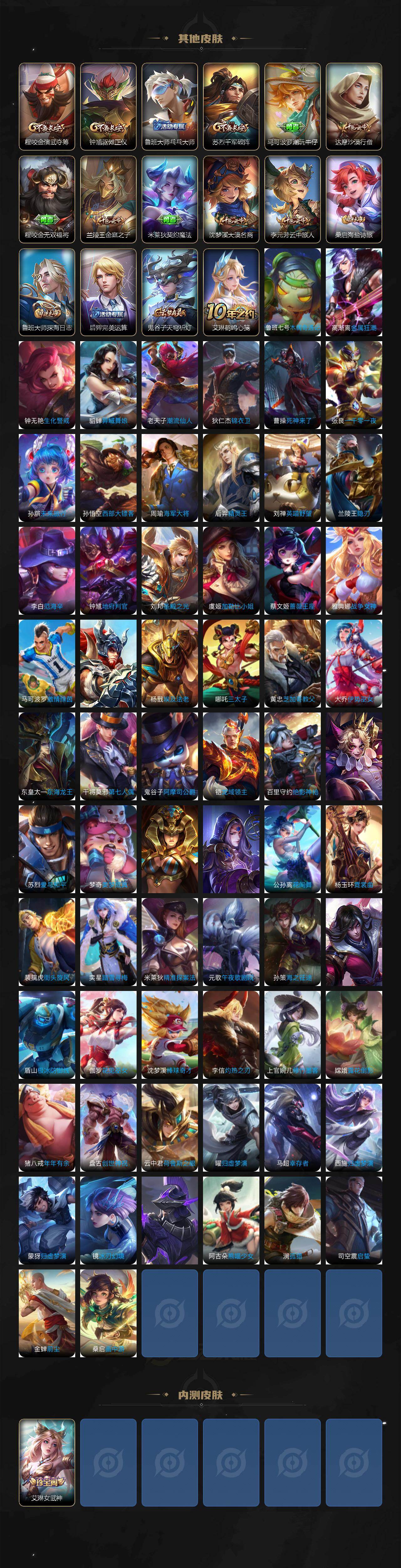 【赛季限定】:庄周蜃楼王,孙膑妖精王,扁鹊炼金王,虞姬凯尔特女王,白起狰,太乙真人饕餮,曹操烛龙,芈月重明,典韦穷奇,狂铁御狮,米莱狄御霄,牛魔御旌,盾山御銮,夏侯惇朔风刀,弈星混沌棋,明世隐疑决卦,老夫子醍醐杖,鬼谷子原初探秘者,程咬金演武夺筹,钟馗驱傩正仪,苏烈千军破阵,达摩沙漠行僧,兰陵王金庭之子,沈梦溪大漠名商,李元芳云中旅人,桑启海盐诗旅,鲁班大师探海日志,鬼谷子天穹祈灯,百里玄策原初追逐者