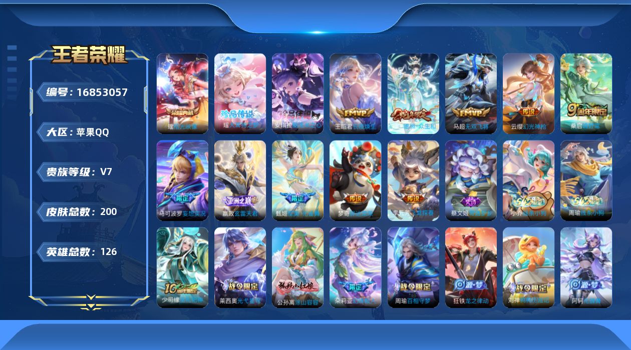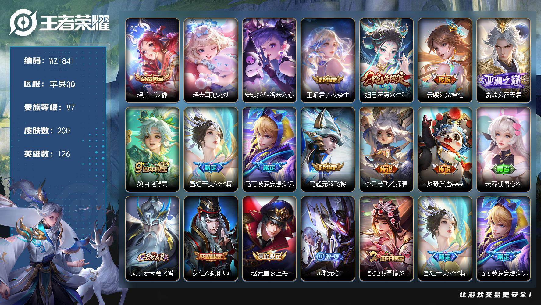 [16853057]19摁键 苹果Q-200皮肤-1典藏皮肤-2珍品传说-10传说-51史诗 【英雄全皮】:孙权全皮,空空儿全皮,影全皮 【荣耀典藏】:瑶拾光映像 【珍品传说】:瑶大耳狗之梦,安琪拉酷洛米之心 【传说皮肤】:王昭君长夜焕生,妲己愿照众生和,云缨幻光神枪,嬴政玄雷天君,桑启鸣野蒿,甄姬至美化雀舞,马可波罗妄想实况,马超无双飞将,李元芳飞鸢探春,梦奇胖达荣荣 【限定皮肤】:大乔绒语心约,姜子牙天穹之誓,狄仁杰阴阳师,赵云皇家上将,元歌无心,甄姬游园惊梦,甄姬至美化雀舞,马可波罗妄想实况,狄仁杰魔术师,项羽海滩派对,李元芳云中旅人,杨玉环遇见飞天,裴擒虎擒涛扼浪,云中君纤云弄巧,鲁班大师探海日志,桑启海盐诗旅,阿古朵江河有灵,张良古海寻踪,蒙犽百解令,鬼谷子天穹祈灯,沈梦溪龙舞盛年,刘邦剑破天穹,刘备异域游侠,周瑜熔金海岸 【年限皮肤】:妲己愿照众生和 【赛季限定】:李元芳云中旅人,桑启海盐诗旅,裴擒虎擒涛扼浪,鲁班大师探海日志,张良古海寻踪,鬼谷子天穹祈灯,刘邦剑破天穹,姜子牙天穹之誓,东皇太一噬灭天穹,太乙真人谧流熔炉,钟馗虚灵犬护,亚瑟荣光之誓 【战令限定】:孙膑茶境仙,马超访茗客,刘禅鸭鸭历险记,沈梦溪鸭鸭历险记,周瑜百相守梦,孙策百相守梦,莱西奥光弋星穹,明世隐往忆晖光,周瑜线条小狗,小乔线条小狗 【史诗皮肤】:露娜紫霞仙子,赵云皇家上将,赵云未来纪元,貂蝉圣诞恋歌,甄姬冰雪圆舞曲,狄仁杰魔术师,廉颇地狱岩魂,宫本武藏鬼剑武藏,孙尚香水果甜心,嬴政暗夜贵公子,嬴政摇滚巨星,妲己女仆咖啡,曹操幽灵船长,张飞乱世虎臣,花木兰水晶猎龙者,小乔缤纷独角兽,诸葛亮黄金分割率,甄姬游园惊梦,雅典娜冰冠公主,安琪拉心灵骇客,百里守约特工魅影,铠曙光守护者,蔡文姬舞动绿茵,程咬金功夫厨神,阿轲节奏热浪,杨玉环遇见飞天,狄仁杰鹰眼统帅,小乔青蛇,瑶遇见神鹿,云中君纤云弄巧,百里玄策热力回旋,杨戬天秀启明,貂蝉唤灵魅影,弈星滕王阁序,元歌无心,阿古朵江河有灵,蒙犽百解令,马可波罗星界特工,孙膑茶境仙,弈星万物之道,赵怀真器灵浮梦炉,阿轲化蝶舞,刘禅鸭鸭历险记,狂铁龙之律动,周瑜百相守梦,朵莉亚幻珠鲛人,公孙离涂山容容,莱西奥光弋星穹,少司缘巫礼祀神,小乔线条小狗,周瑜线条小狗,蔡文姬奇遇梦乡 【其他皮肤】:项羽海滩派对,韩信教廷特使,韩信街头霸王,露娜哥特玫瑰,阿轲爱心护理,赵云忍炎
