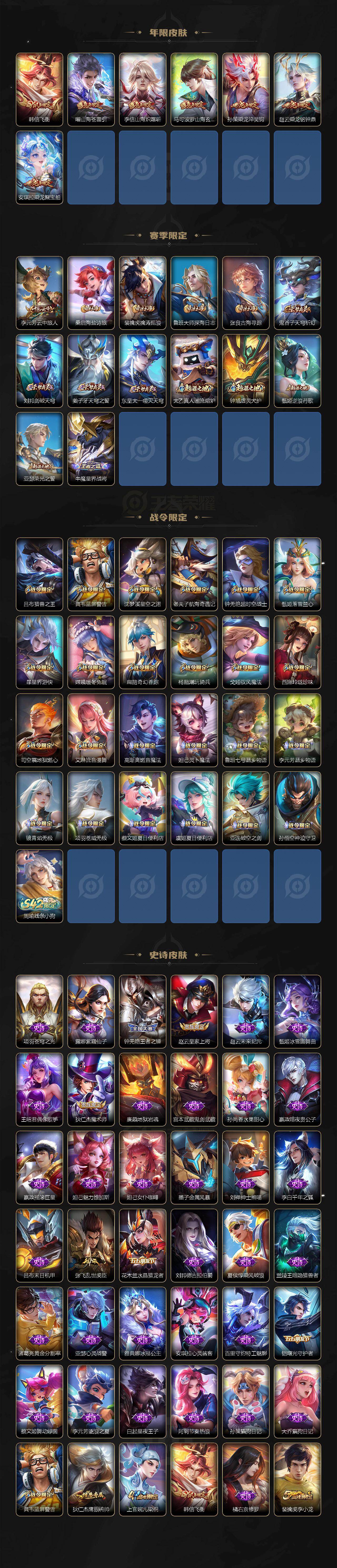 【赛季限定】:李元芳云中旅人,桑启海盐诗旅,裴擒虎擒涛扼浪,鲁班大师探海日志,张良古海寻踪,鬼谷子天穹祈灯,刘邦剑破天穹,姜子牙天穹之誓,东皇太一噬灭天穹,太乙真人谧流熔炉,钟馗虚灵犬护,甄姬逆浪荇歌,亚瑟荣光之誓,牛魔星界战将