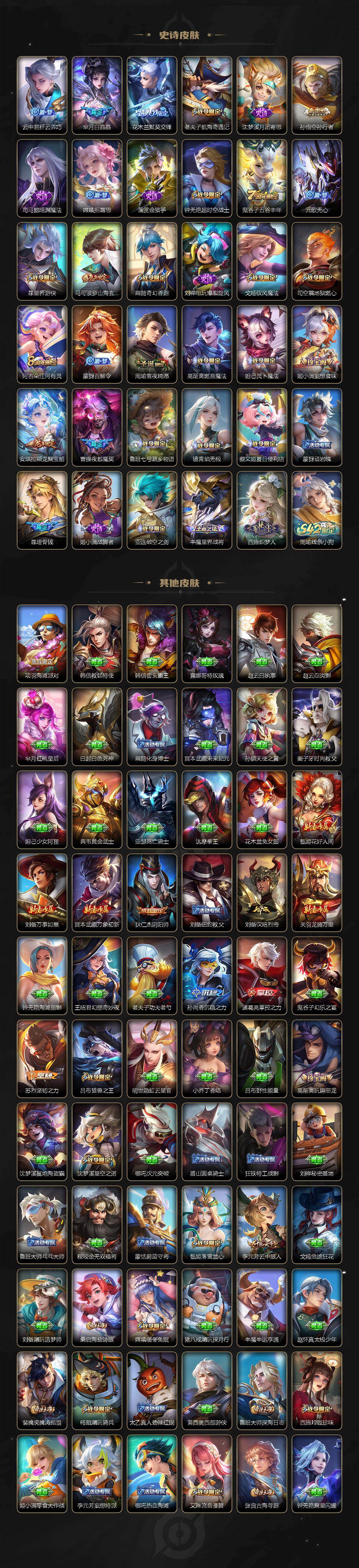 【限定皮肤】:暃埋骨钱,蒙犽顽岩魄,蔡文姬夏日便利店,大乔绒语心约,虞姬夏日便利店,姜子牙天穹之誓,杨戬破阵退雄兵,狄仁杰阴阳师,赵云皇家上将,高渐离玩趣恶龙,钟无艳王者之锤,钟无艳超时空战士,扁鹊奇幻香踪,芈月白晶晶,吕布猎兽之王,元歌无心,甄姬落雪兰心,典韦蓝屏警告,马可波罗山海玄木吟,狄仁杰魔术师,项羽海滩派对,老夫子航海奇遇记,韩信飞衡,花木兰默契交锋,孙悟空孙行者,孙悟空齐天大圣,李元芳云中旅人,杨戬潮玩骑兵,鬼谷子五谷丰年,诸葛亮鹤羽星尊,沈梦溪星空之诺,裴擒虎李小龙,裴擒虎擒涛扼浪,云中君纤云弄巧,李信山海炽霜斩,上官婉儿梁祝,嫦娥拒霜思,嫦娥暖冬兔眠,曜山海苍雷引,西施玲珑珍味,鲁班大师探海日志,桑启海盐诗旅,夏洛特浮生妄,暃星界游侠,戈娅驭风魔法,艾琳流音漫舞,云缨鹤归松栖,司空震地狱燃心,阿古朵江河有灵,张良古海寻踪,蒙犽百解令,高渐离燃音魔法,妲己灵卜魔法,鬼谷子天穹祈灯,李白碎月剑心,姬小满妄想食味,安琪拉乘龙聚宝船,孙策乘龙淬吴钩,赵云乘龙铭钟鼎,曹操夜都魔契,鲁班七号蔬乡物语,李元芳蔬乡物语,刘邦剑破天穹,程咬金群星魔术团,镜青焰无极,项羽苍威无极,周瑜熔金海岸
