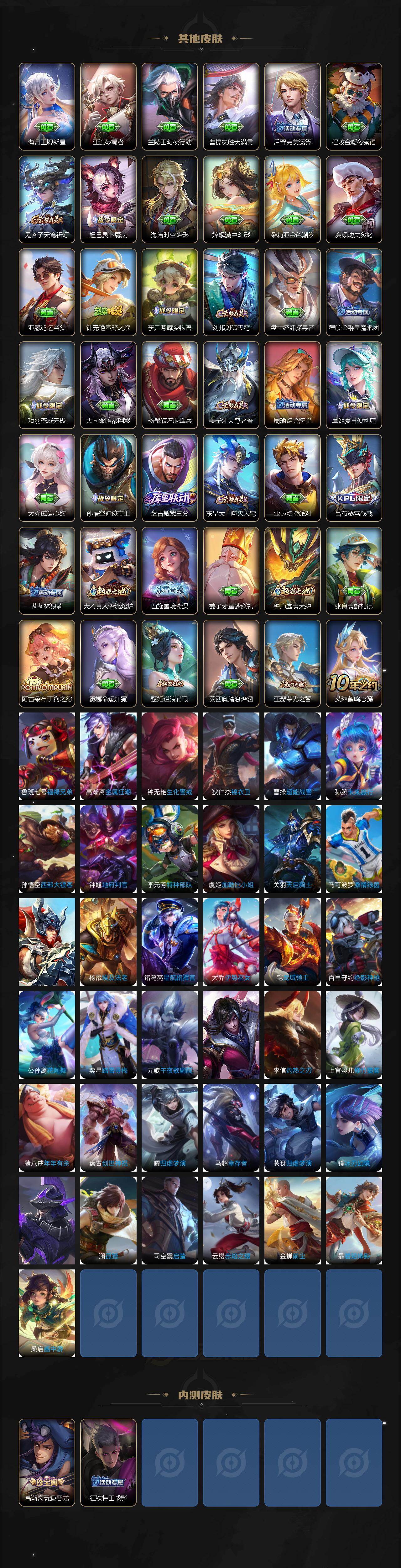 李元芳逐浪之夏,大乔猫狗日记,孙策猫狗日记,阿轲节奏热浪,露娜紫霞仙子,诸葛亮黄金分割率,王昭君偶像歌手,项羽苍穹之光,雅典娜冰冠公主,吕布末日机甲,橘右京修罗,嬴政摇滚巨星,刘禅绅士熊喵,白起星夜王子,安琪拉心灵骇客,刘邦德古拉伯爵,兰陵王暗隐猎兽者,宫本武藏鬼剑武藏,司马懿暗渊魔法,亚瑟心灵战警,蔡文姬舞动绿茵,廉颇地狱岩魂,夏侯惇乘风破浪,花木兰水晶猎龙者,铠曙光守护者,墨子金属风暴,百里守约特工魅影,嬴政暗夜贵公子,嫦娥拒霜思,李白千年之狐,澜赏金猎手,刘禅电玩·爆裂旋风,蒙犽百解令,周瑜雪夜绮愿,高渐离燃音魔法,安琪拉乘龙·聚宝船,曹操夜都魔契