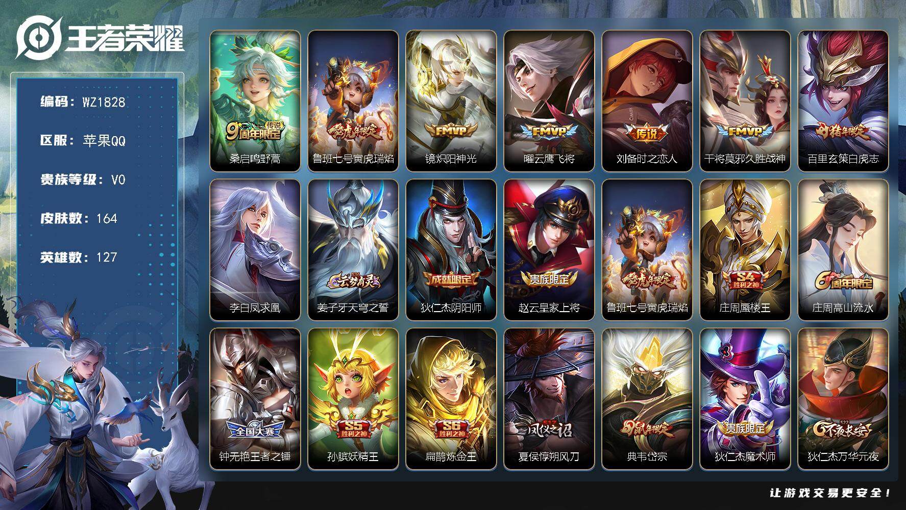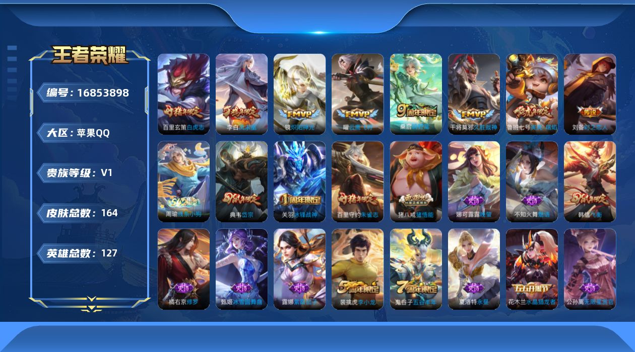 - [14039958]【店主推荐捡漏号!可直接换绑】苹果Q-V9-至尊星耀I段位-128英雄-375皮肤-3典藏-31传说-108史诗 【英雄全皮】:钟馗全皮,司空震全皮,戈娅全皮 【荣耀典藏】:武则天英雄,孙悟空全息碎影,鲁班七号星空梦想,瑶拾光映像 【传说皮肤】:司空震愿照山河定,澜愿照九州拓,云缨幻光神枪,裴擒虎祥瑞亨通,桑启鸣野蒿,孙策乘龙淬吴钩,赵云乘龙铭钟鼎,澜逐花归海,狄仁杰夜礼服假面,王昭君永恒水手月亮,吕布遇见神鼓,云缨鹤归松栖,东皇太一灼幽烈阳,亚瑟追逃游戏,露娜启示之音,女娲补天,孙策末日机甲,王昭君乞巧织情,西施游龙清影,李元芳飞鸢探春,镜炽阳神光,虞姬启明星使,曜云鹰飞将,张良黄金白羊座,干将莫邪久胜战神,后羿黄金射手座,貂蝉仲夏夜之梦,孙尚香末日机甲,孙悟空地狱火,武则天海洋之心,狄仁杰超时空战士 【限定皮肤】:蔡文姬夏日便利店,虞姬夏日便利店,姜子牙天穹之誓,李白谪仙醉月,狄仁杰阴阳师,赵云皇家上将,嬴政白昼王子,鲁班七号狮舞东方,庄周高山流水,高渐离死亡摇滚,扁鹊奇幻香踪,吕布猎兽之王,吕布御风骁将,吕布遇见神鼓,元歌云间偶戏,夏侯惇朔风刀,曹操烛龙,典韦穷奇,典韦蓝屏警告,马可波罗暗影游猎,狄仁杰魔术师,狄仁杰万华元夜,达摩沙漠行僧,项羽海滩派对,老夫子醍醐杖,程咬金演武夺筹,露娜启示之音,韩信飞衡,韩信傲雪梅枪,兰陵王金庭之子,花木兰青春决赛季,亚瑟潮玩骑士王,亚瑟追逃游戏,孙悟空至尊宝,牛魔御旌,牛魔奔雷神使,后羿如梦令,刘备百相守梦,李元芳匿光侦查者,李元芳云中旅人,虞姬启明星使,钟馗神迹守卫,钟馗驱傩正仪,杨戬潮玩骑兵,女娲朔望之晖,女娲补天,雅典娜黎明之约,太乙真人华丽摇滚,鬼谷子原初探秘者,大乔白鹤梁神女,苏烈千军破阵,百里玄策原初追逐者,弈星混沌棋,梦奇顽趣,沈梦溪大漠名商,明世隐疑决卦,明世隐吟游魔法,裴擒虎天狼狩猎者,裴擒虎李小龙,裴擒虎擒涛扼浪,狂铁御狮,米莱狄御霄,云中君纤云弄巧,盾山御銮,猪八戒西部大镖客,上官婉儿梁祝,嫦娥拒霜思,西施玲珑珍味,鲁班大师探海日志,桑启海盐诗旅,戈娅驭风魔法,艾琳女武神,艾琳流音漫舞,赵怀真鹤归松栖,云缨鹤归松栖,司空震地狱燃心,阿古朵江河有灵,张良古海寻踪,王昭君永恒水手月亮,狄仁杰夜礼服假面,蒙犽百解令,蒙恬荣光圣徽,高渐离燃音魔法,妲己灵卜魔法,鬼谷子天穹祈灯,伽罗琥珀纪元,安琪拉乘龙聚宝船