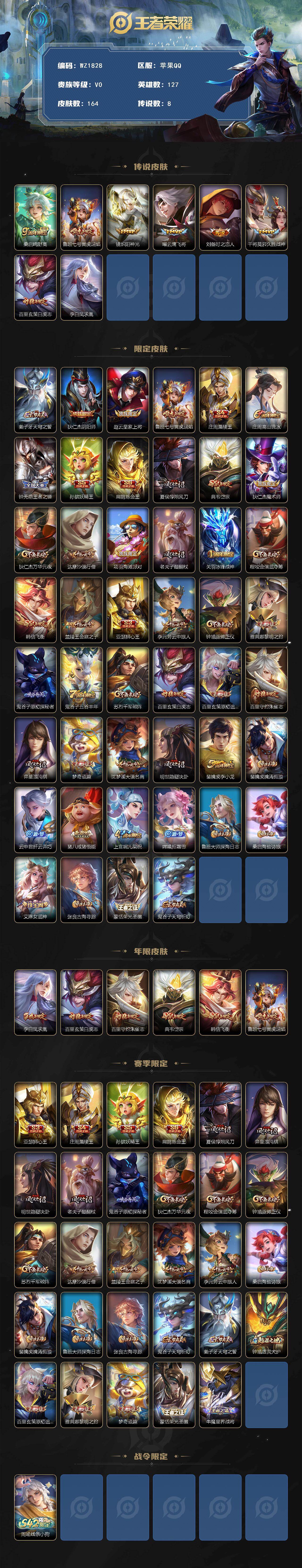[16853898]苹果Q-164皮肤-8传说-44史诗 【英雄全皮】:孙权全皮 【传说皮肤】:桑启鸣野蒿,鲁班七号寅虎瑞焰,镜炽阳神光,曜云鹰飞将,刘备时之恋人,干将莫邪久胜战神,百里玄策白虎志,李白凤求凰 【限定皮肤】:姜子牙天穹之誓,狄仁杰阴阳师,赵云皇家上将,鲁班七号寅虎瑞焰,庄周蜃楼王,庄周高山流水,钟无艳王者之锤,孙膑妖精王,扁鹊炼金王,夏侯惇朔风刀,典韦岱宗,狄仁杰魔术师,狄仁杰万华元夜,达摩沙漠行僧,项羽海滩派对,老夫子醍醐杖,关羽冰锋战神,程咬金演武夺筹,韩信飞衡,兰陵王金庭之子,亚瑟狮心王,李元芳云中旅人,钟馗驱傩正仪,雅典娜黎明之约,鬼谷子原初探秘者,鬼谷子五谷丰年,苏烈千军破阵,百里玄策白虎志,百里玄策原初追逐者,百里守约朱雀志,弈星混沌棋,梦奇顽趣,沈梦溪大漠名商,明世隐疑决卦,裴擒虎李小龙,裴擒虎擒涛扼浪,云中君纤云弄巧,猪八戒猪悟能,上官婉儿梁祝,嫦娥拒霜思,鲁班大师探海日志,桑启海盐诗旅,艾琳女武神,张良古海寻踪,蒙恬荣光圣徽,鬼谷子天穹祈灯 【年限皮肤】:李白凤求凰,百里玄策白虎志,百里守约朱雀志,典韦岱宗,韩信飞衡,鲁班七号寅虎瑞焰 【赛季限定】:亚瑟狮心王,庄周蜃楼王,孙膑妖精王,扁鹊炼金王,夏侯惇朔风刀,弈星混沌棋,明世隐疑决卦,老夫子醍醐杖,鬼谷子原初探秘者,狄仁杰万华元夜,程咬金演武夺筹,钟馗驱傩正仪,苏烈千军破阵,达摩沙漠行僧,兰陵王金庭之子,沈梦溪大漠名商,李元芳云中旅人,桑启海盐诗旅,裴擒虎擒涛扼浪,鲁班大师探海日志,张良古海寻踪,鬼谷子天穹祈灯,姜子牙天穹之誓,钟馗虚灵犬护,百里玄策原初追逐者,雅典娜黎明之约,梦奇顽趣,蒙恬荣光圣徽,牛魔星界战将 【战令限定】:周瑜线条小狗 【史诗皮肤】:露娜紫霞仙子,钟无艳王者之锤,赵云皇家上将,貂蝉圣诞恋歌,甄姬冰雪圆舞曲,王昭君偶像歌手,狄仁杰魔术师,廉颇地狱岩魂,宫本武藏鬼剑武藏,孙尚香水果甜心,嬴政暗夜贵公子,妲己魅力维加斯,墨子金属风暴,吕布圣诞狂欢,李白千年之狐,关羽冰锋战神,花木兰水晶猎龙者,刘邦德古拉伯爵,诸葛亮黄金分割率,安琪拉心灵骇客,百里守约特工魅影,程咬金功夫厨神,阿轲节奏热浪,百里守约朱雀志,狄仁杰鹰眼统帅,公孙离无限星赏官,上官婉儿梁祝,娜可露露晚萤,韩信飞衡,典韦岱宗,不知火舞魅语,橘右京修罗,百里玄策原初追逐者,裴擒虎李小龙,云中君纤云弄巧,猪八戒猪悟能,庄周高山流