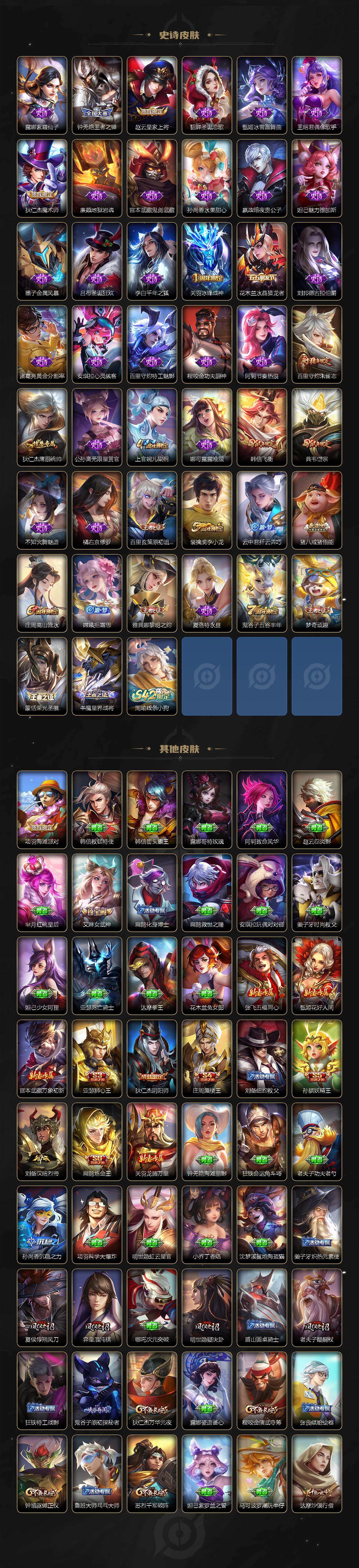 【史诗皮肤】:露娜紫霞仙子,钟无艳王者之锤,赵云皇家上将,貂蝉圣诞恋歌,甄姬冰雪圆舞曲,王昭君偶像歌手,狄仁杰魔术师,廉颇地狱岩魂,宫本武藏鬼剑武藏,孙尚香水果甜心,嬴政暗夜贵公子,妲己魅力维加斯,墨子金属风暴,吕布圣诞狂欢,李白千年之狐,关羽冰锋战神,花木兰水晶猎龙者,刘邦德古拉伯爵,诸葛亮黄金分割率,安琪拉心灵骇客,百里守约特工魅影,程咬金功夫厨神,阿轲节奏热浪,百里守约朱雀志,狄仁杰鹰眼统帅,公孙离无限星赏官,上官婉儿梁祝,娜可露露晚萤,韩信飞衡,典韦岱宗,不知火舞魅语,橘右京修罗,百里玄策原初追逐者,裴擒虎李小龙,云中君纤云弄巧,猪八戒猪悟能,庄周高山流