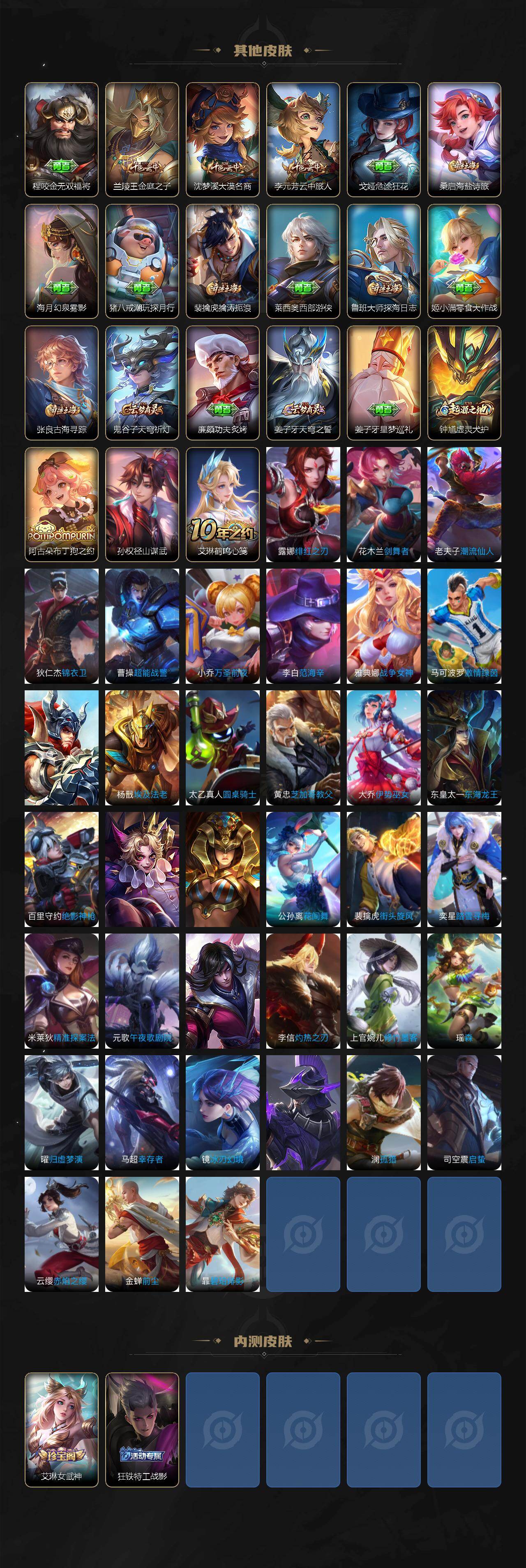 【赛季限定】:亚瑟狮心王,庄周蜃楼王,孙膑妖精王,扁鹊炼金王,夏侯惇朔风刀,弈星混沌棋,明世隐疑决卦,老夫子醍醐杖,鬼谷子原初探秘者,狄仁杰万华元夜,程咬金演武夺筹,钟馗驱傩正仪,苏烈千军破阵,达摩沙漠行僧,兰陵王金庭之子,沈梦溪大漠名商,李元芳云中旅人,桑启海盐诗旅,裴擒虎擒涛扼浪,鲁班大师探海日志,张良古海寻踪,鬼谷子天穹祈灯,姜子牙天穹之誓,钟馗虚灵犬护,百里玄策原初追逐者,雅典娜黎明之约,梦奇顽趣,蒙恬荣光圣徽,牛魔星界战将