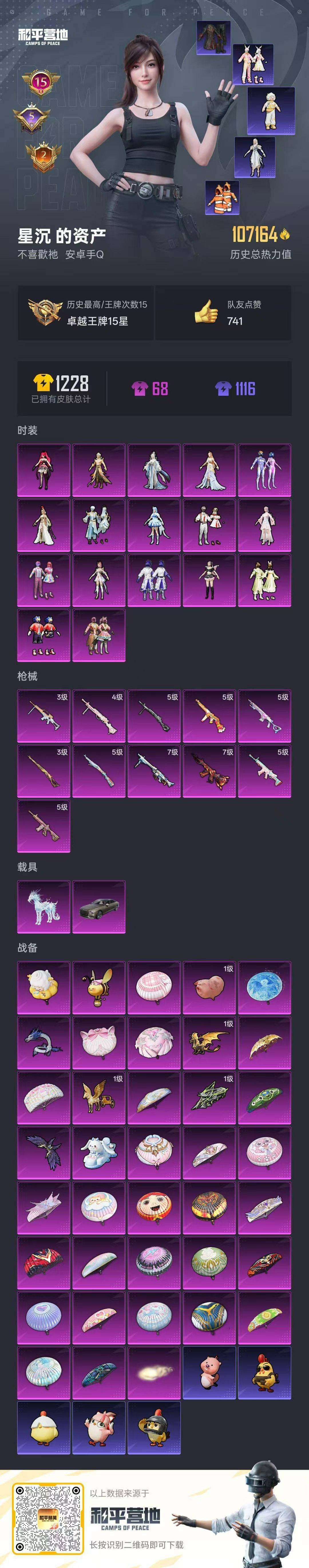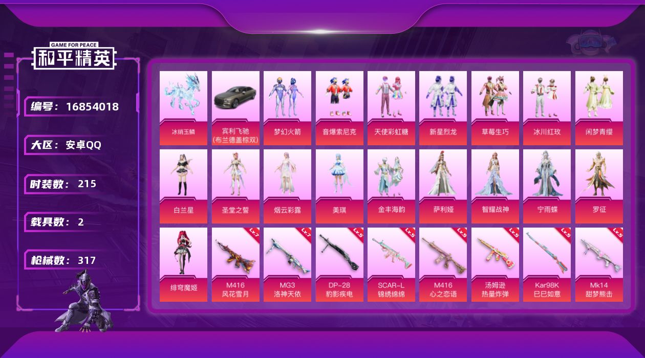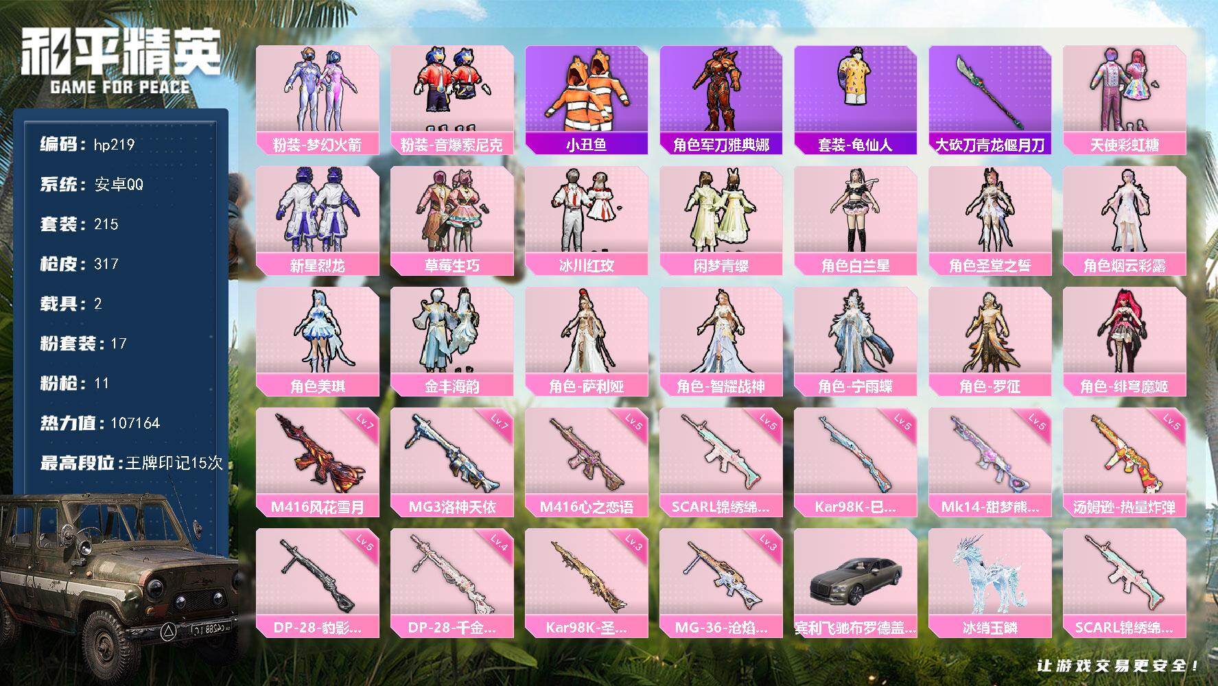 [16854018]安卓 手Q-17粉装-11特效枪-2载具-9粉色飞行器-107164热力值-15王牌印记-215套装-317枪皮