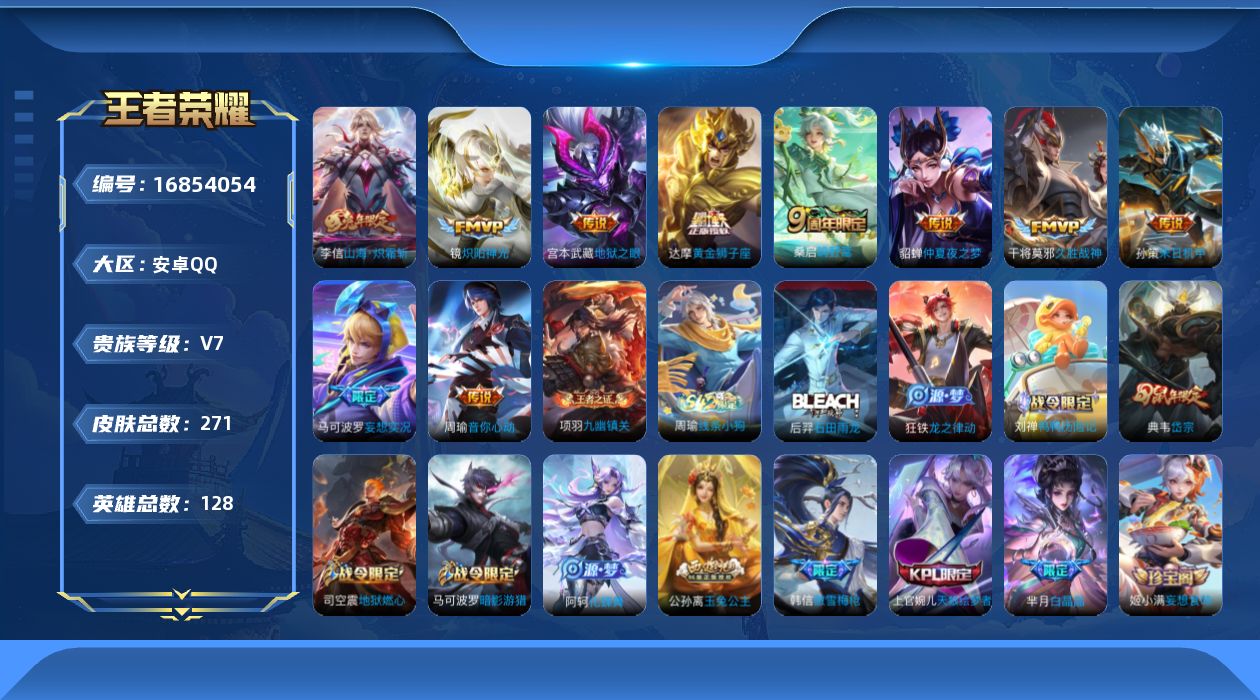 - [12321561]V8 2典藏 2珍品传说 25传说 125英雄 325皮肤 可修改实名 优质装备:鸣剑·曳影,弑枪猎影(韩信典藏),朽木白哉,黑崎一护,黄金狮子座,黄金射手座,云鹰飞将(小将军),绛天战甲(鸡嘴战神),炽阳神光,一念神魔,末日机甲-孙尚香(绿蚂蚱),地狱火,地狱之眼,末日机甲-孙策,无双飞将,燃星之曲,电玩·雷克斯,澜逐花归海,诡秘之主,千山共赴,涂山容容 传说皮:死亡执政官,九山相柳,祥瑞亨通 珍宝阁皮:优雅恋人,蔷薇恋人 限定皮:鸣野蒿,至尊宝,凤求凰(白切鸡),时雨天司(水龙头),飞衡(韩信年限),遇见飞天,诗剑行,五谷丰年,冰锋战神,游园惊梦,梁祝,祈雪灵祝(雪兔子),李小龙,逐梦之影,霸王别姬-虞姬,默契交锋-花木兰,大圣娶亲,引擎之心,冰霜恋舞曲,美猴王 史诗皮:飞车小橘子,灵蛊蚀心,龙之律动,东方月初,百相守梦-黄忠,紫霞仙子,电玩小子(小书包),白龙吟,黄金分割率,特工魅影,千年之狐,江河有灵,鹤归松栖(赵怀真),蒙恬荣光圣徽,匿光破解者,冰冠公主,偶像歌手,电玩·兔顽号,电玩·爆裂旋风,暗夜猫娘,百相守梦(关羽),龙骑士(小龙虾),末日机甲-吕布,节奏热浪,女仆咖啡,摇滚巨星,水果甜心,天才门将,星夜王子,功夫厨神,德古拉伯爵,暗隐猎兽者,幽灵船长,鬼剑武藏,地狱岩魂,繁星吟游(呼啦呼啦),缤纷独角兽,乘风破浪,逐浪之夏,水晶猎龙者,箭羽风息,金属风暴,原初追逐者,圣诞狂欢,鹰眼统帅,王者之锤,暗夜贵公子,魅力维加斯,黎明之约,赏金猎手,未来纪元-赵云,玫瑰异探