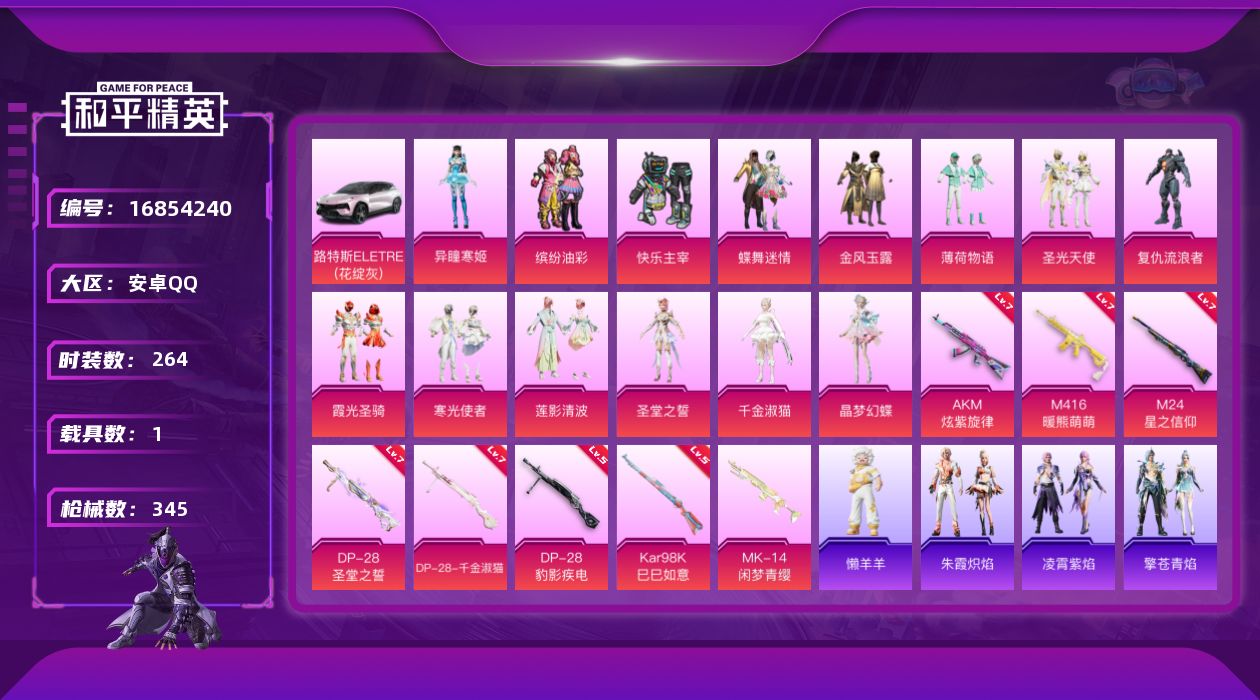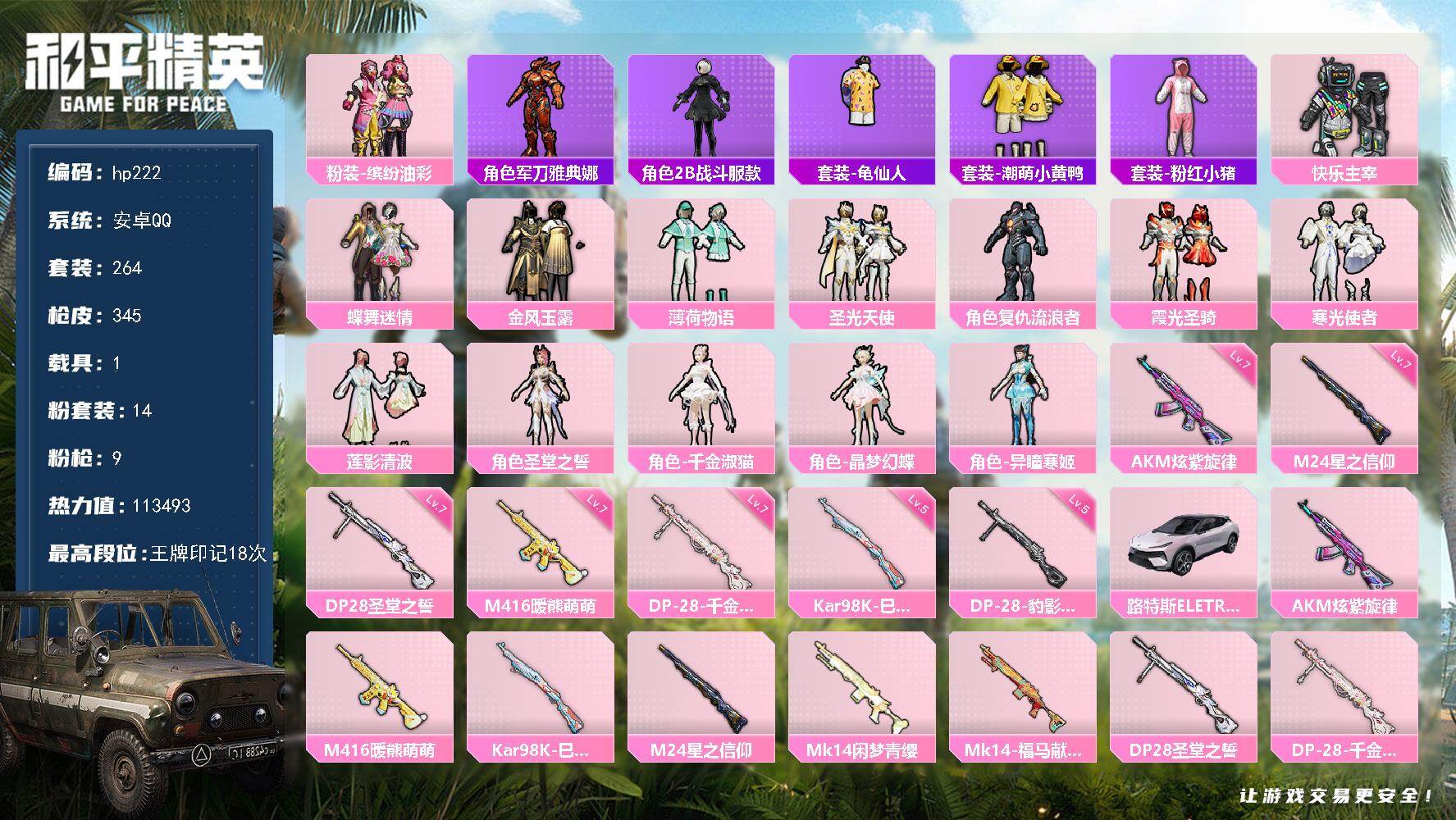 [16854240]安卓 手Q-14粉装-9特效枪-1载具-2粉色飞行器-113493热力值-18王牌印记-264套装-345枪皮