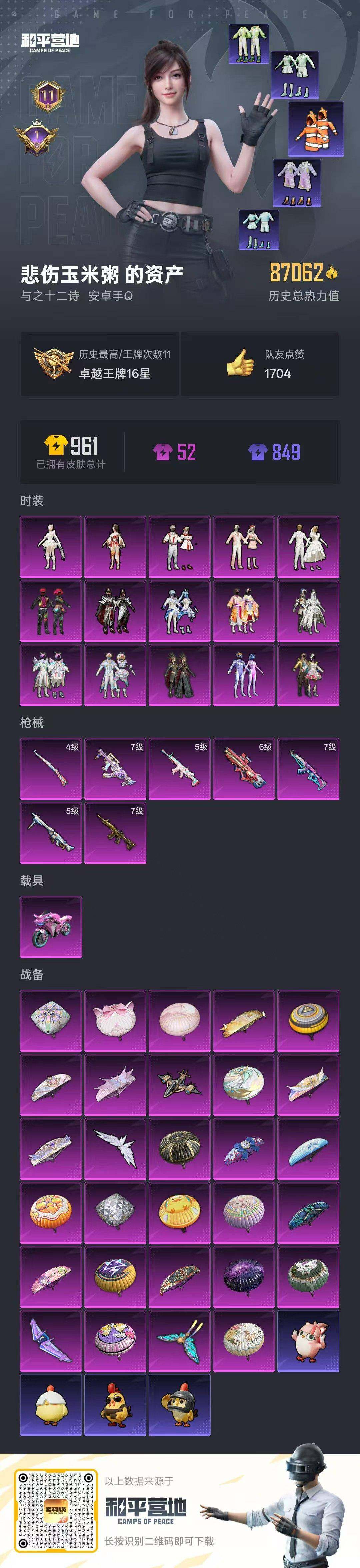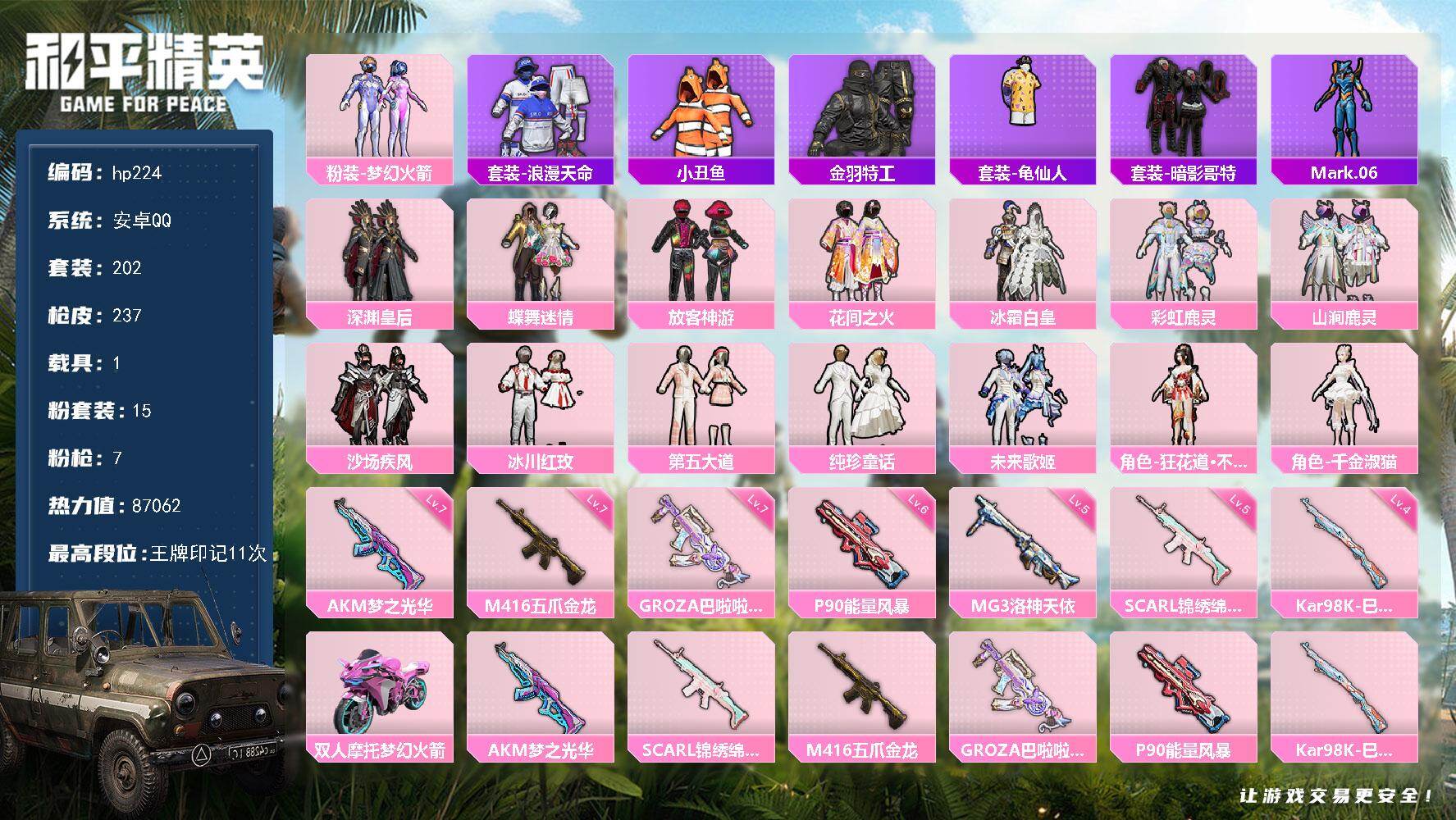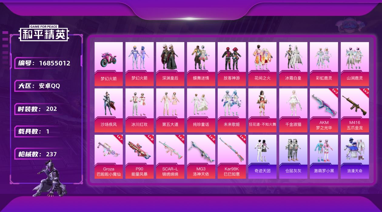 [16855012]安卓 手Q-15粉装-7特效枪-1载具-4粉色飞行器-87062热力值-11王牌印记-202套装-237枪皮