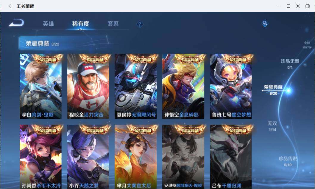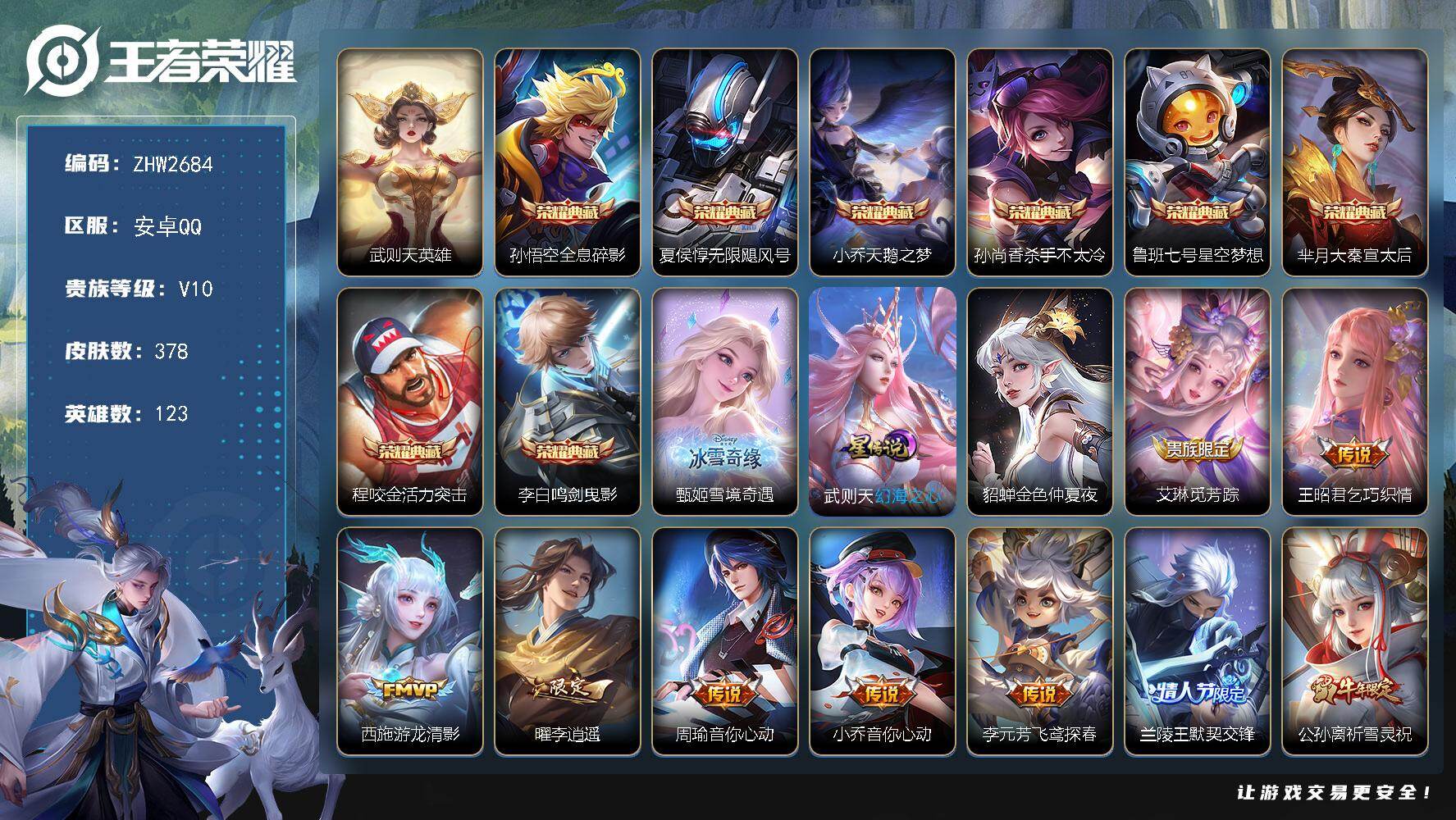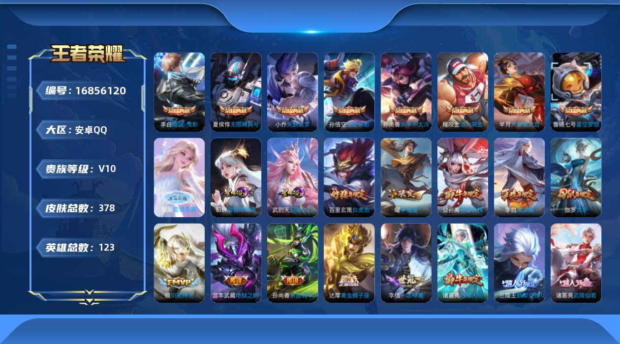 [16856120]安卓Q-V10-最强王者段位-123英雄-378皮肤-8典藏皮肤-1典藏英雄-1无双-36传说-128史诗