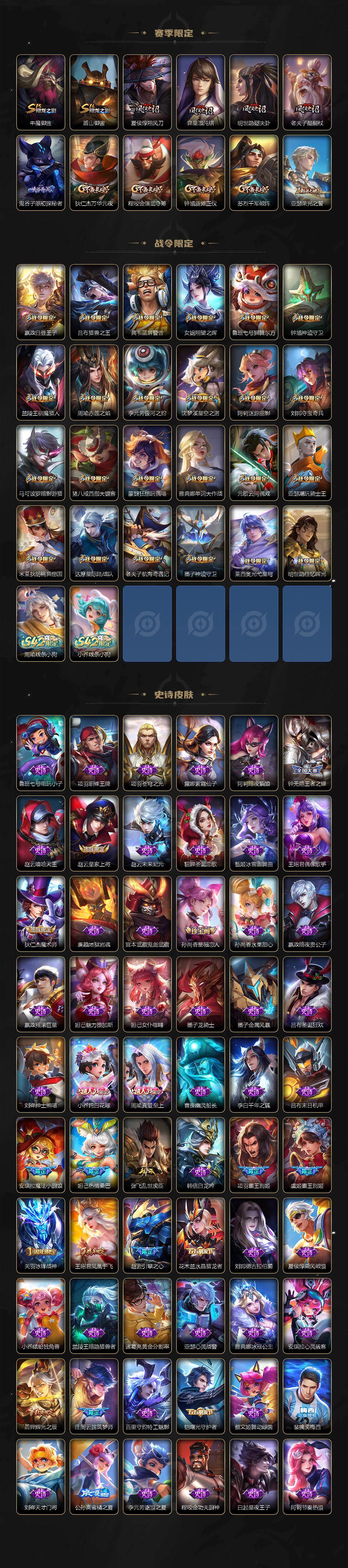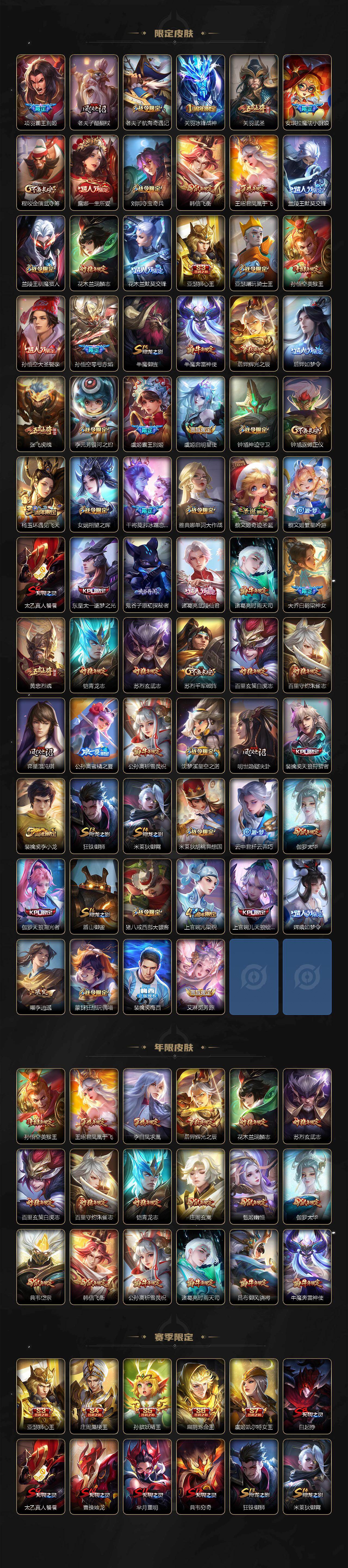 【限定皮肤】:白起狰,狄仁杰阴阳师,小乔纯白花嫁,虞姬凯尔特女王,赵云皇家上将,赵云引擎之心,赵云龙胆,墨子神迹守卫,妲己热情桑巴,妲己时之彼端,嬴政白昼王子,孙尚香蔷薇恋人,鲁班七号狮舞东方,鲁班七号乒乒小将,庄周蜃楼王,庄周云端筑梦师,庄周玄嵩,阿轲迷踪丽影,钟无艳王者之锤,孙膑妖精王,孙膑天狼运算者,扁鹊炼金王,芈月重明,芈月白晶晶,吕布猎兽之王,吕布御风骁将,周瑜真爱至上,周瑜赤莲之焰,元歌云间偶戏,元歌无心,夏侯惇朔风刀,甄姬幽恒,曹操烛龙,曹操天狼征服者,典韦穷奇,典韦蓝屏警告,典韦岱宗,马可波罗暗影游猎,狄仁杰魔术师,狄仁杰万华元夜,达摩星际陆战队,项羽海滩派对,项羽霸王别姬,老夫子醍醐杖,老夫子航海奇遇记,关羽冰锋战神,关羽武圣,安琪拉魔法小厨娘,程咬金演武夺筹,露娜一生所爱,刘邦夺宝奇兵,韩信飞衡,王昭君凤凰于飞,兰陵王默契交锋,兰陵王驯魔猎人,花木兰瑞麟志,花木兰默契交锋,亚瑟狮心王,亚瑟潮玩骑士王,孙悟空美猴王,孙悟空大圣娶亲,孙悟空零号赤焰,牛魔御旌,牛魔奔雷神使,后羿辉光之辰,后羿如梦令,张飞虎魄,李元芳银河之约,虞姬霸王别姬,虞姬启明星使,钟馗神迹守卫,钟馗驱傩正仪,杨玉环遇见飞天,女娲朔望之晖,干将莫邪冰霜恋舞曲,雅典娜单词大作战,蔡文姬奇迹圣诞,蔡文姬繁星吟游,太乙真人饕餮,东皇太一
