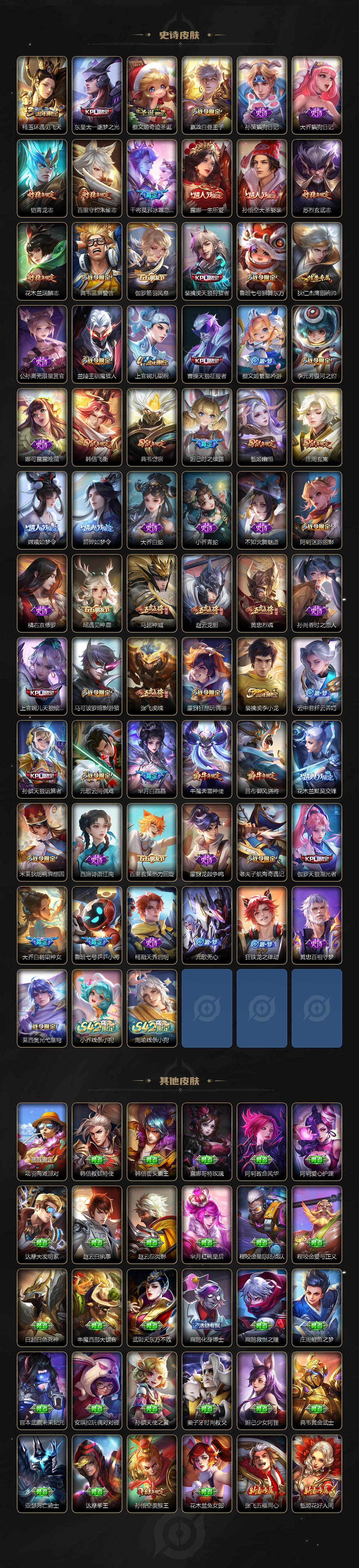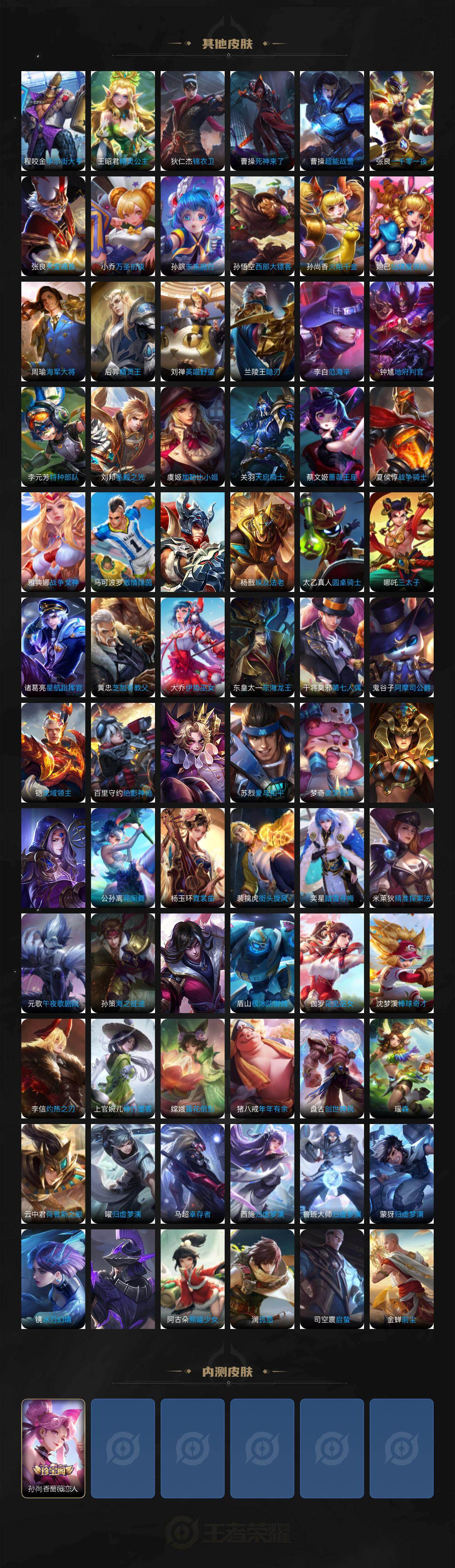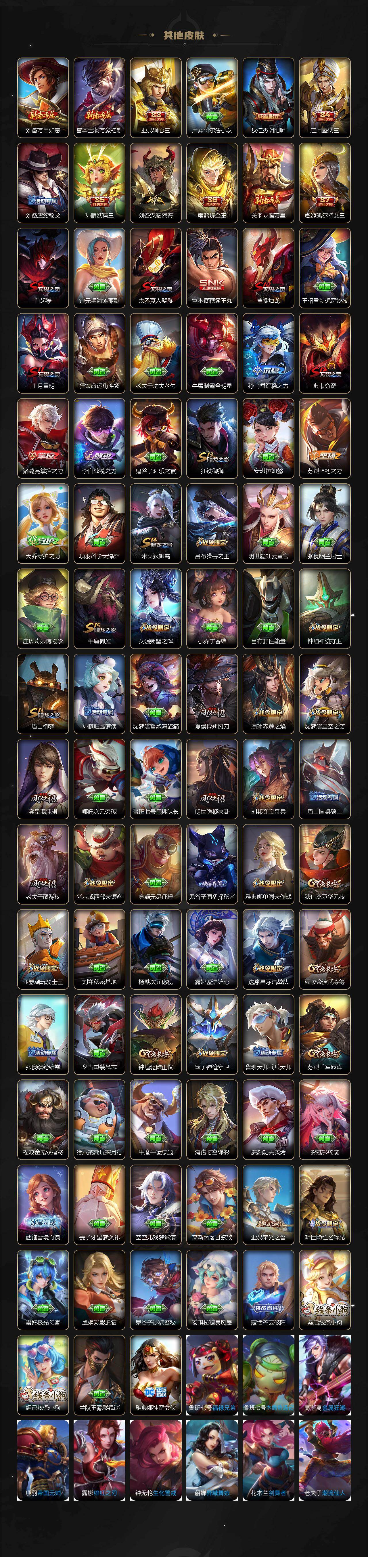 关羽冰锋战神,裴擒虎李小龙,上官婉儿梁祝,牛魔奔雷神使,公孙离祈雪灵祝,吕布御风骁将,诸葛亮时雨天司,赵云龙胆,关羽武圣,黄忠烈魂,张飞虎魄,马超神威,后羿辉光之辰,庄周玄嵩,典韦岱宗,甄姬幽恒,韩信飞衡,伽罗太华,曹操天狼征服者,裴擒虎天狼狩猎者,孙膑天狼运算者,上官婉儿天狼绘梦者,伽罗天狼溯光者,东皇太一逐梦之光,铠青龙志,百里玄策白虎志,花木兰瑞麟志,苏烈玄武志,百里守约朱雀志,王昭君凤凰于飞,项羽霸王别姬,虞姬霸王别姬,小乔纯白花嫁,周瑜真爱至上,孙悟空大圣娶亲,露娜一生所爱,花木兰默契交锋,兰陵王默契交锋,后羿如梦令,嫦娥如梦令,裴擒虎梅西,雅典娜神奇女侠,妲己热情桑巴,干将莫邪冰霜恋舞曲,蔡文姬奇迹圣诞,妲己时之彼端,公孙离蜜橘之夏,芈月白晶晶,安琪拉魔法小厨娘,赵云引擎之心,孙悟空美猴王,庄周云端筑梦师,鲁班七号乒乒小将,大乔白鹤梁神女
