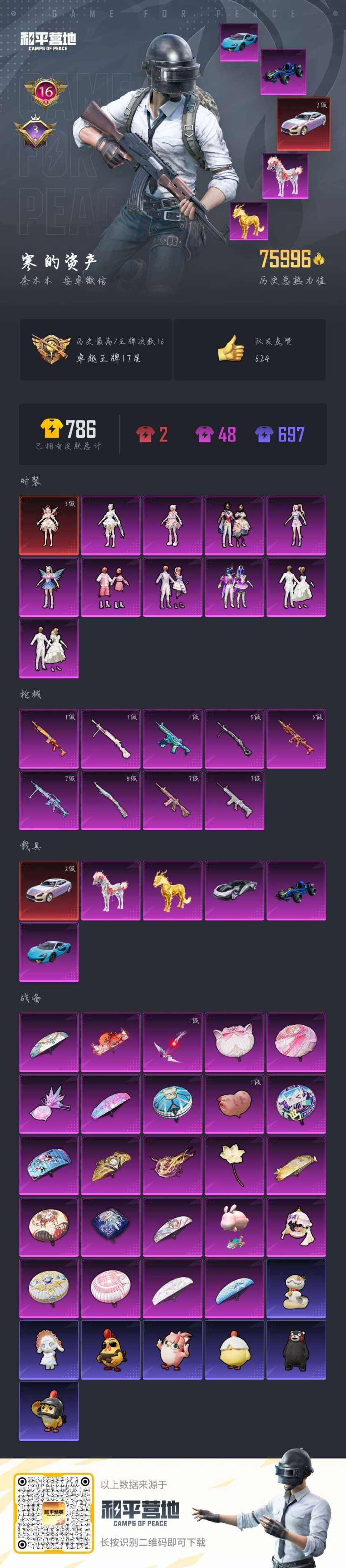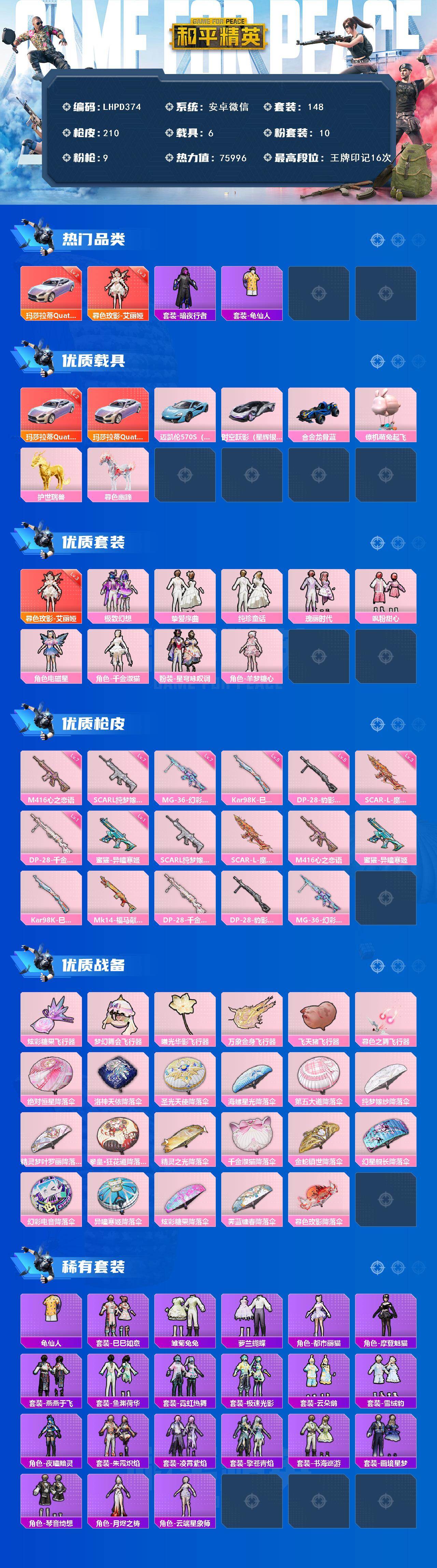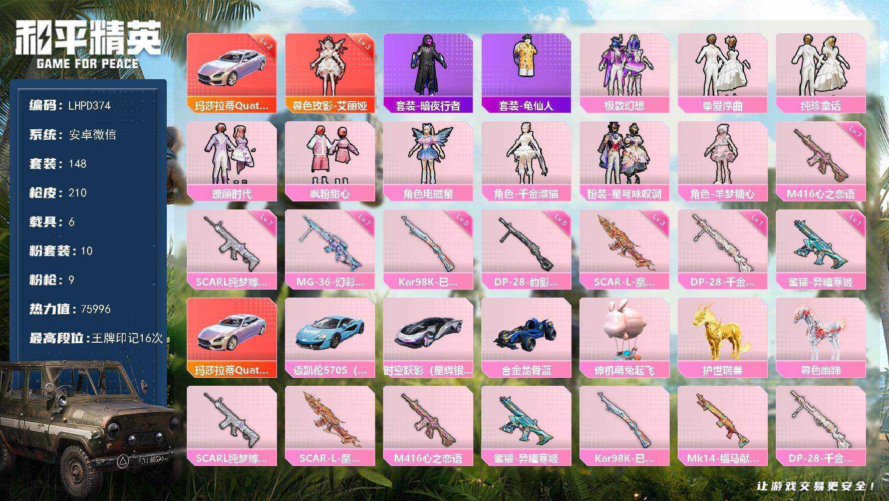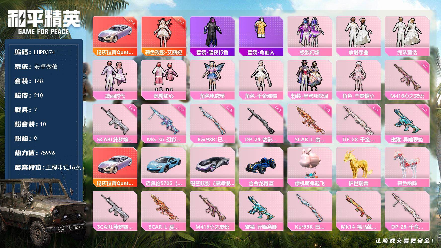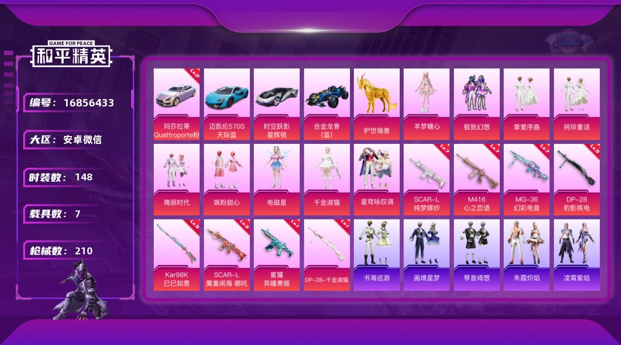 [16856433]【特价出售/店主推荐】安卓 微信-1神装-10粉装-9特效枪-7载具-6粉色飞行器-75996热力值-16王牌印记-148套装-210枪皮【红色载具】:玛莎拉蒂Quattroporte(幻星粉)(二级)【红色神装等级】:暮色玫影-艾丽娅(三级)【红色角色神装】:暮色玫影-艾丽娅【热门品类】:套装-暗夜行者,套装-龟仙人【粉色套装】:粉装-极致幻想,粉装-挚爱序曲,粉装-纯珍童话,粉装-瑰丽时代,粉装-飒粉甜心,角色-电磁星,角色-千金淑猫,粉装-星穹咏叹调,角色-羊梦糖心【粉色枪皮等级】:SCAR-L-纯梦嫁纱(七级),SCAR-L-魔童闹海 哪吒(三级),M416-心之恋语(七级),蜜獾-异瞳寒姬(一级),Kar98K-巳巳如意(五级),DP-28-千金淑猫(一级),DP-28-豹影疾电(五级),MG-36-幻彩电音(七级)【粉色载具】:玛莎拉蒂Quattroporte(幻星粉),迈凯伦570S(天际蓝),时空跃影(星辉银),合金龙骨(蓝),僚机-萌兔起飞,护世瑞兽,暮色幽蹄【粉色枪皮】:SCAR-L-纯梦嫁纱,SCAR-L-魔童闹海 哪吒,M416-心之恋语,蜜獾-异瞳寒姬,Kar98K-巳巳如意,Mk14-福马献瑞,DP-28-千金淑猫,DP-28-豹影疾电,MG-36-幻彩电音【粉色飞行器】:炫彩糖果飞行器,梦幻舞会飞行器,曦光华影飞行器,万象金身飞行器,飞天猪飞行器,暮色之舞飞行器